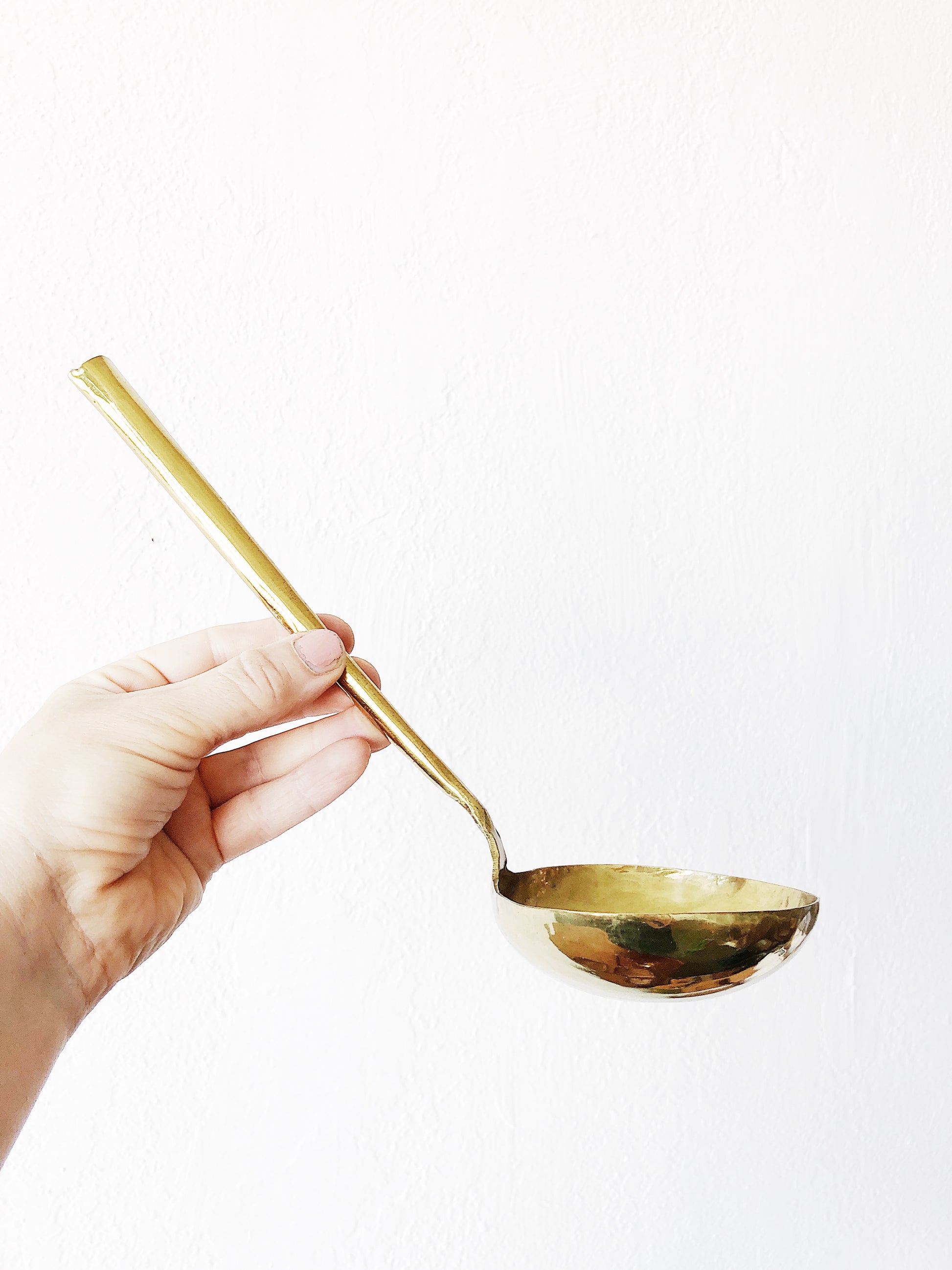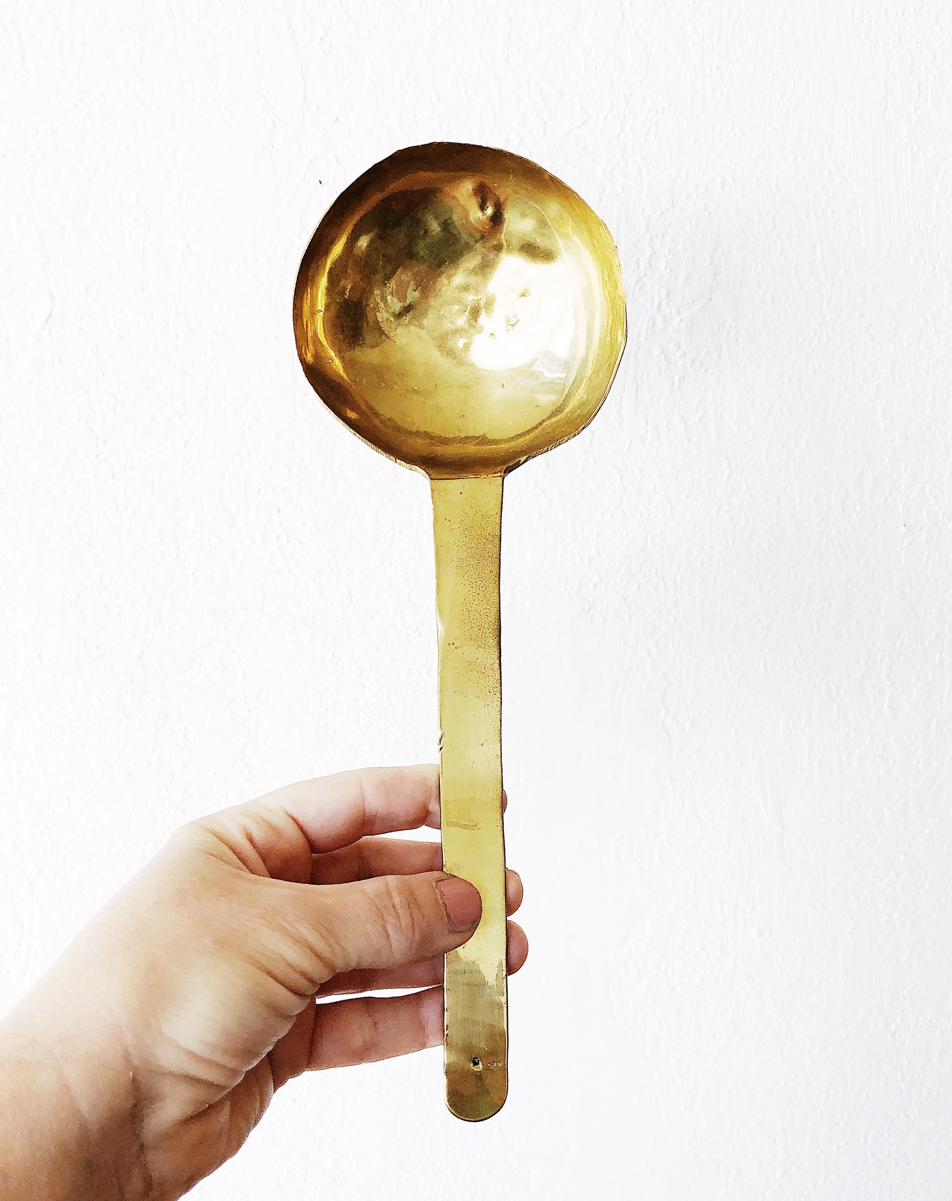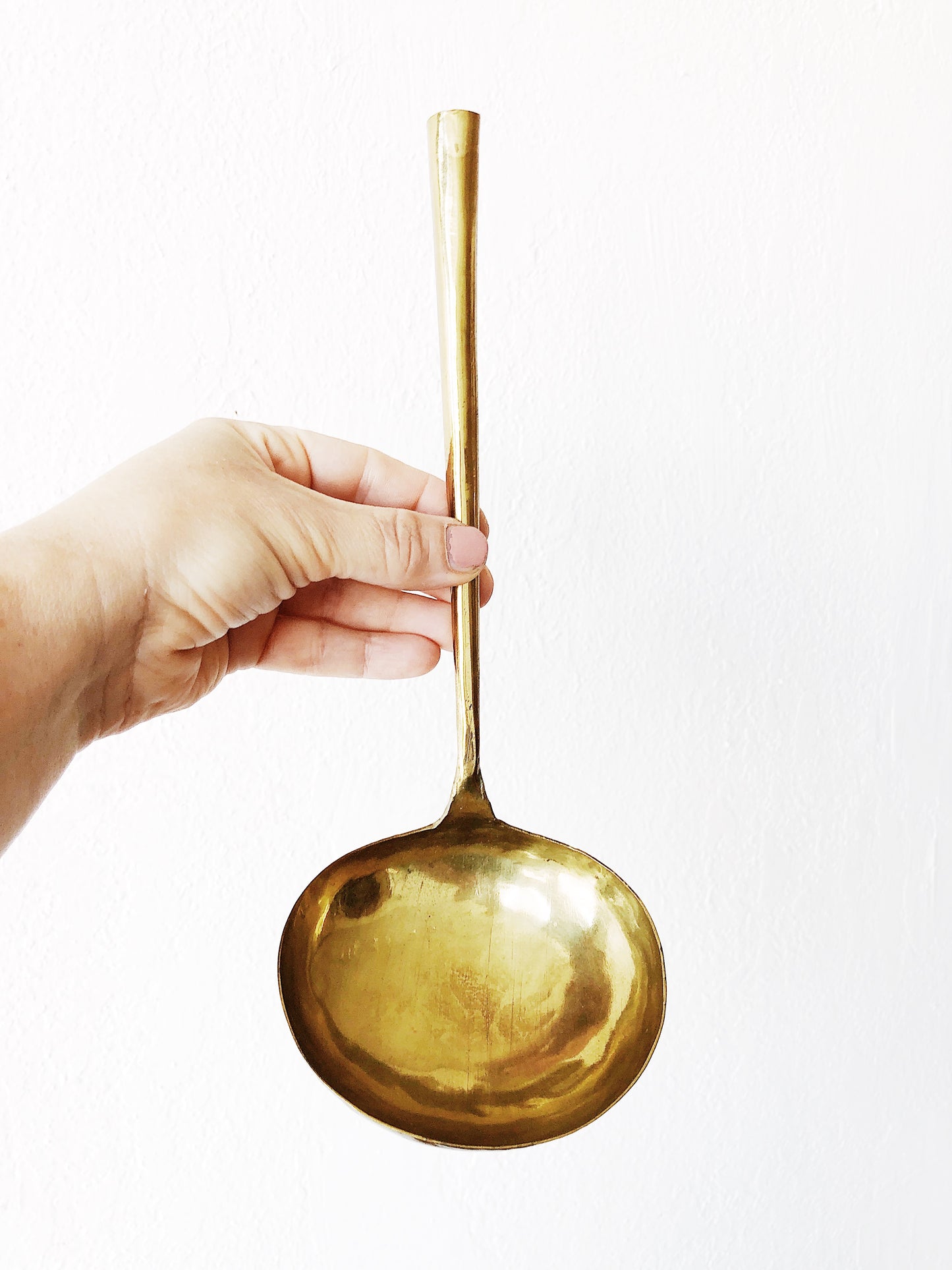 Hand hammered liquid brass. Beautiful shape from the delicately formed bowl to the handle. A real joy to hold