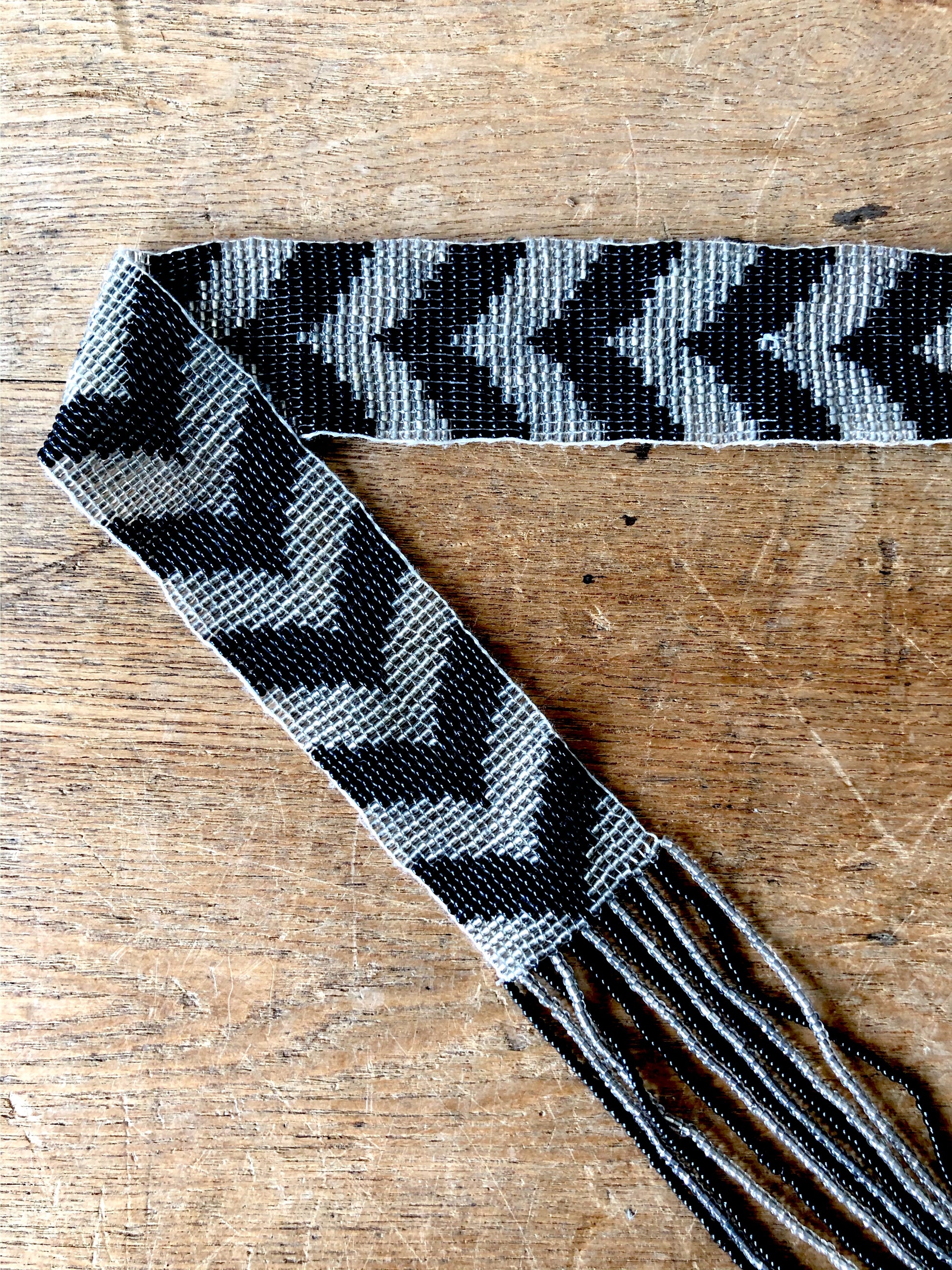 Tiny seed beads sewn in a traditional native pattern. Rests casually across the neck and hangs in front or back. Feels lovely on