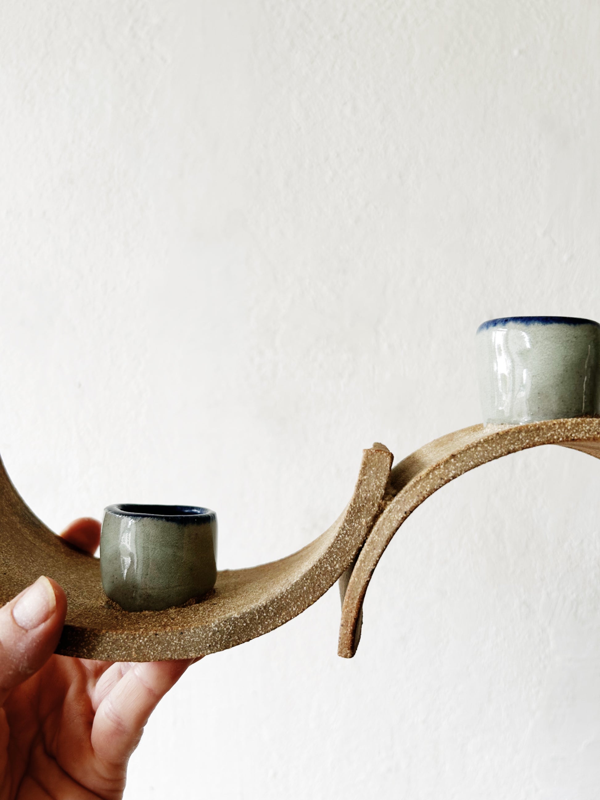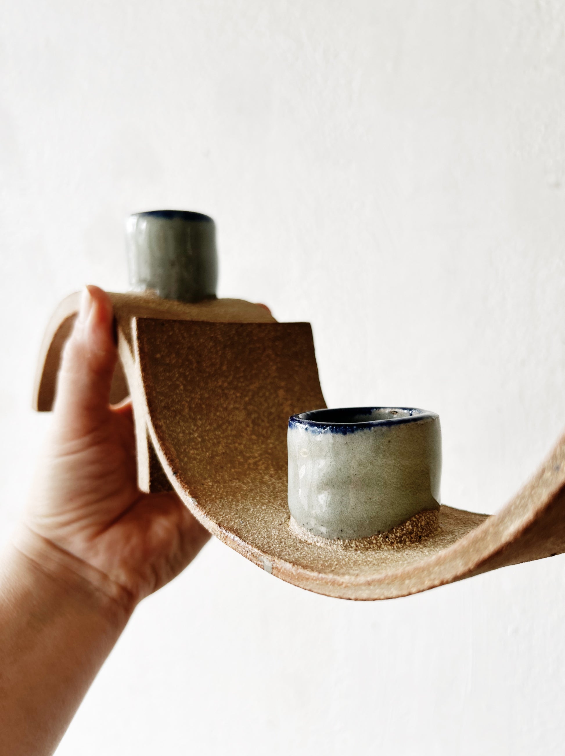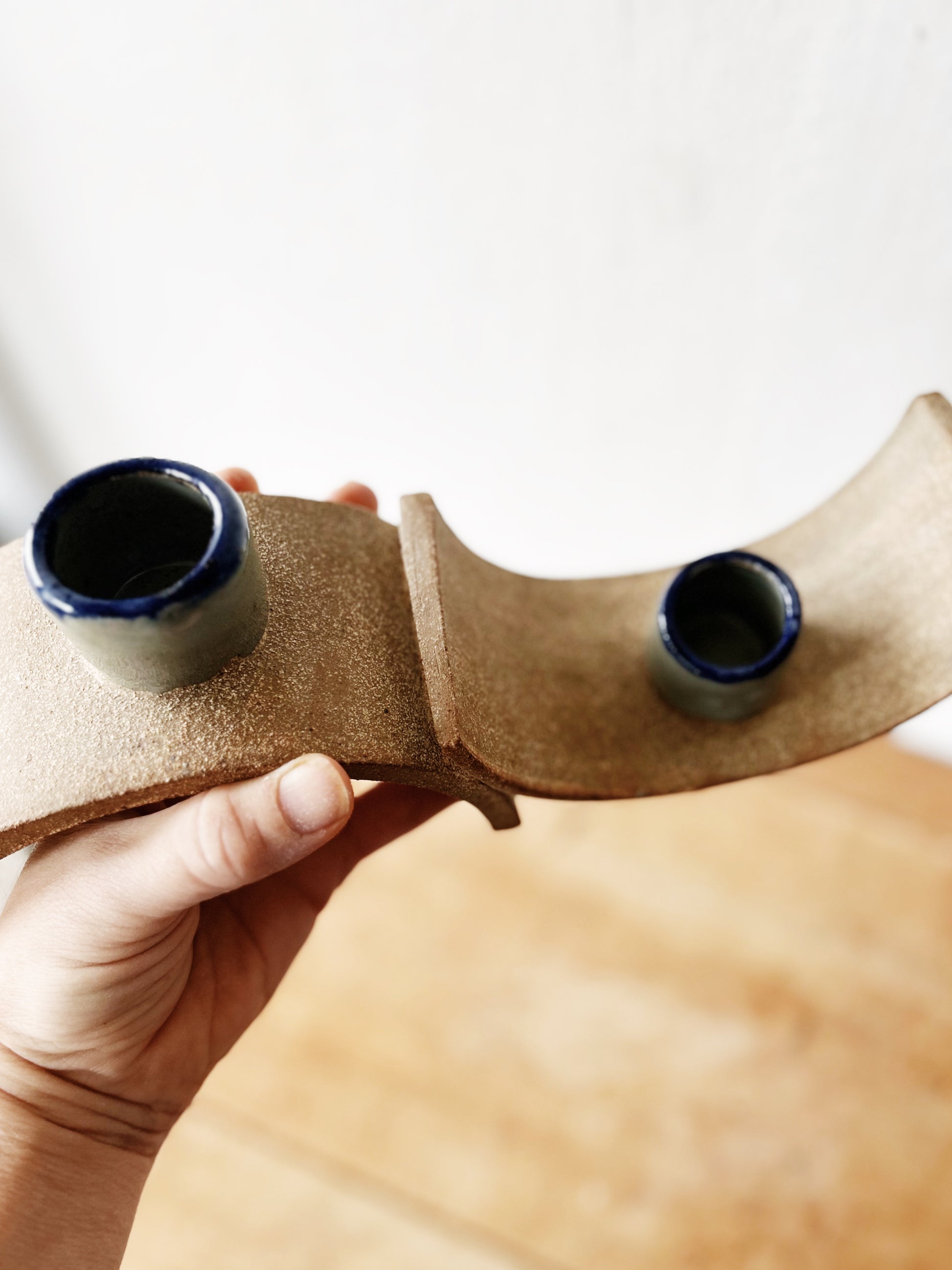 Slab built ceramic candelabra. Takes a nice chunky candle somewhere between a taper and a pillar. Really nicely made. Signed dated