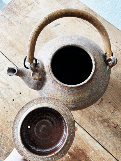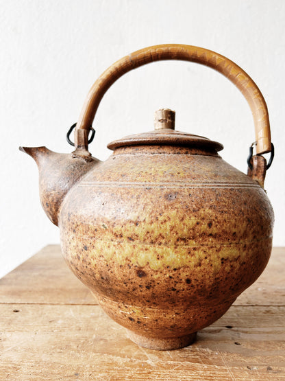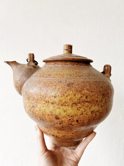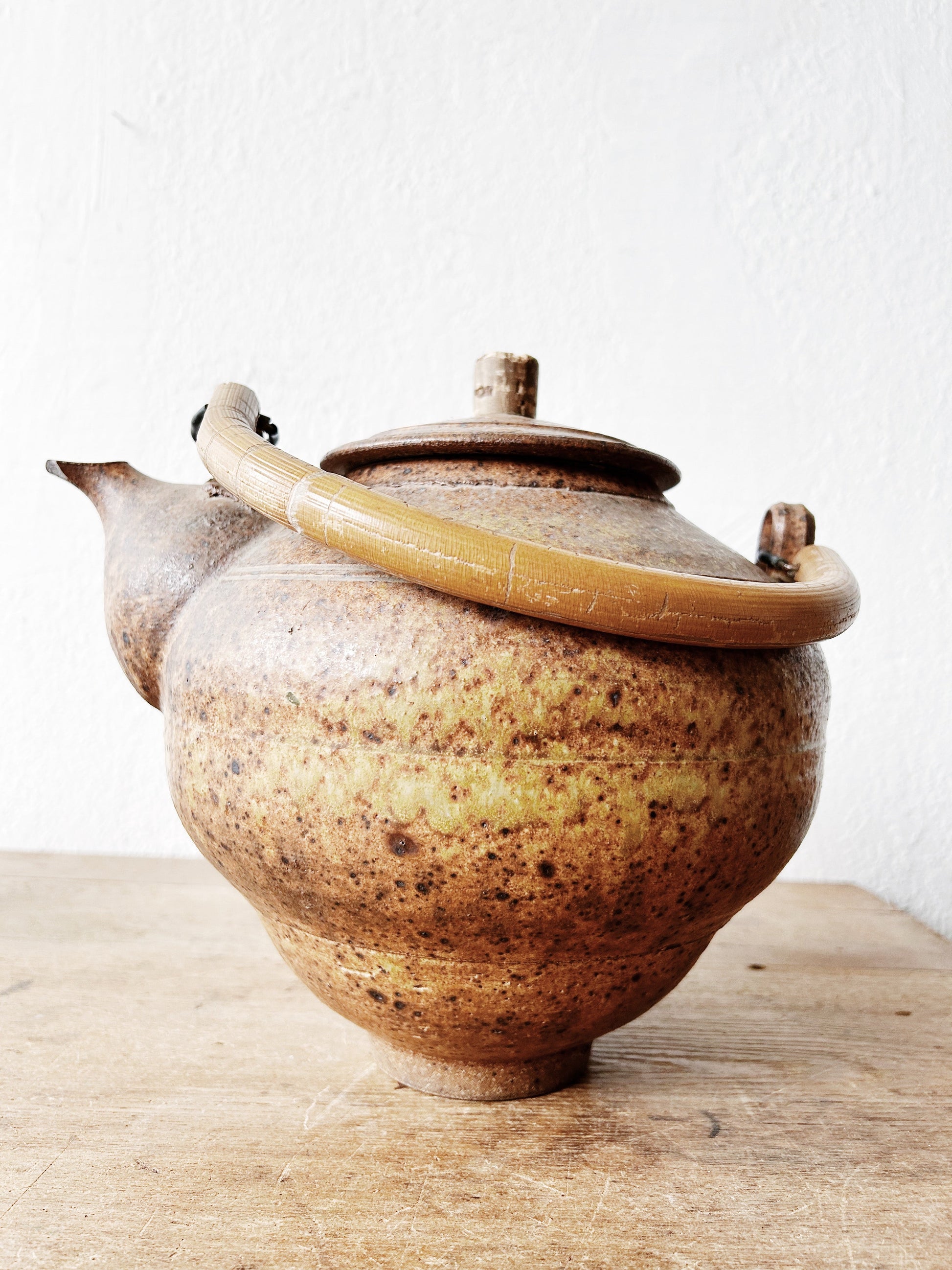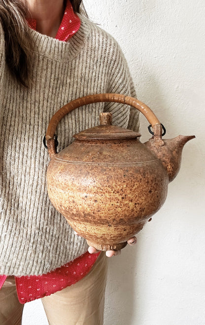 Gorgeous large hand built stoneware teapot with wood handle. In really beautiful condition, aside from a tiny chip under the spout that doesn’t detract or affect usability. clean interior.
