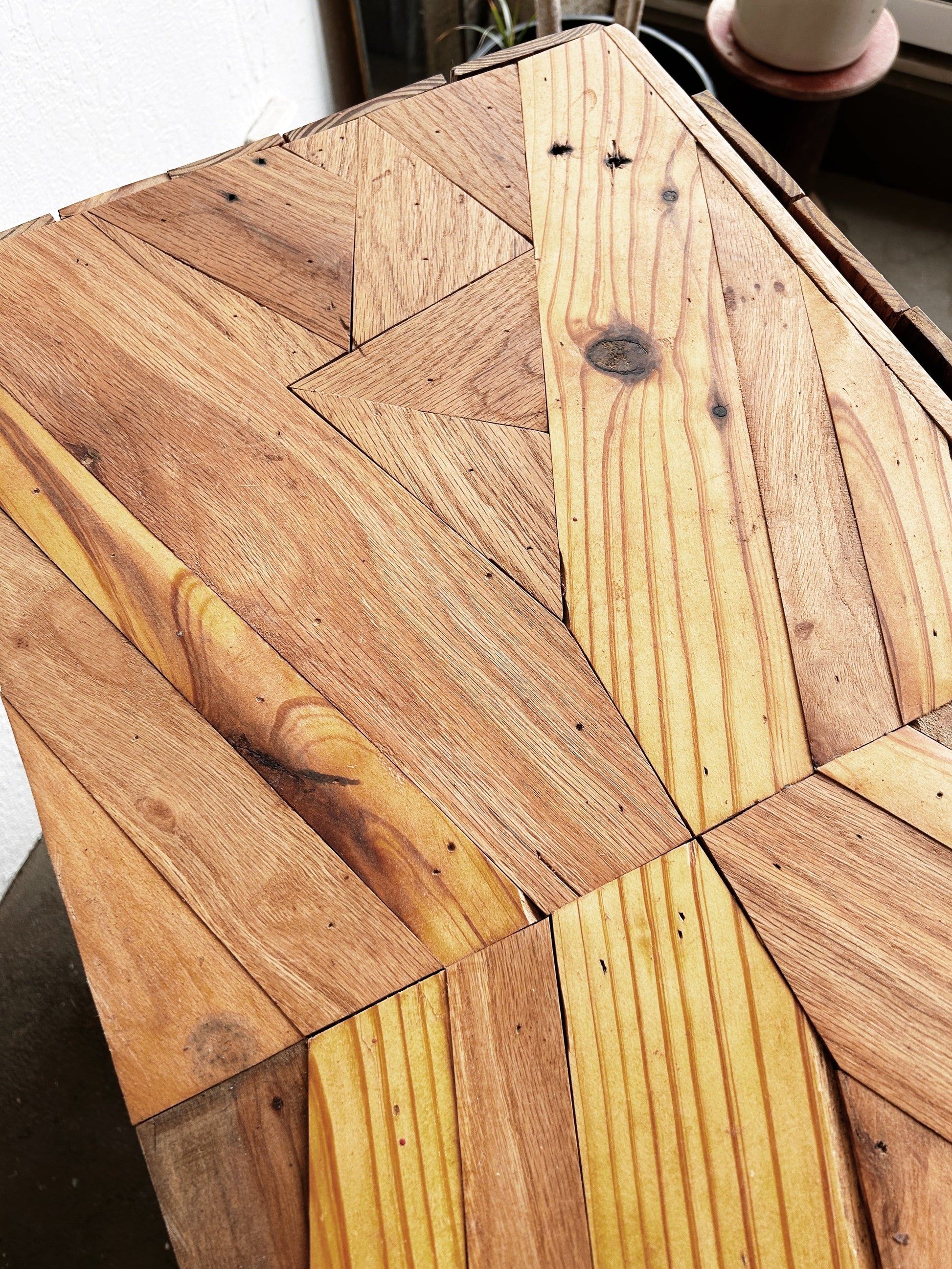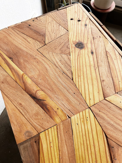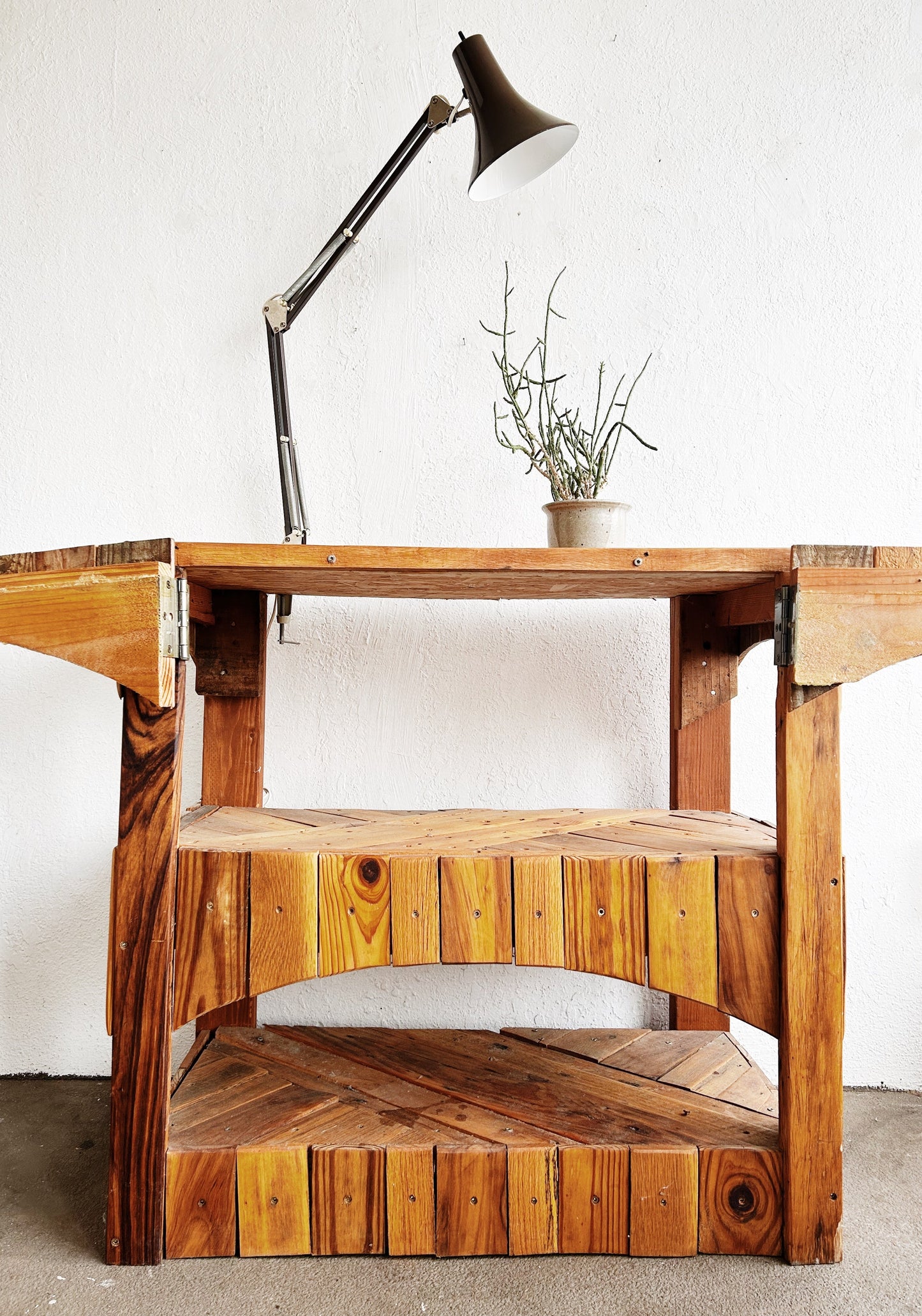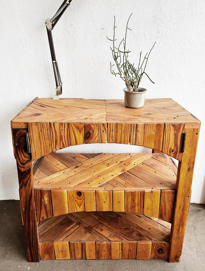 Very cool handmade wood shelf that would make a great bar/ media console or entryway shelf. Super sturdy with great modern craft vibe. I’d remove the little doors if it were mine, and happy to do for you if you’d like. It’s cool either way.