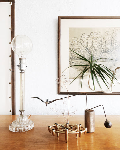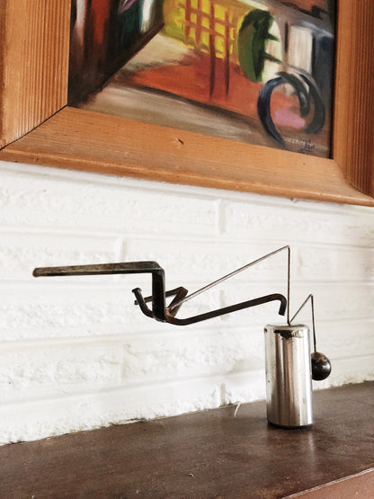 Made of mixed metals, this hand forged sculpture balances perfectly on a steel base. Delicate arm supports a bird, which can spin easily round or stay in place. Great modern sculpture