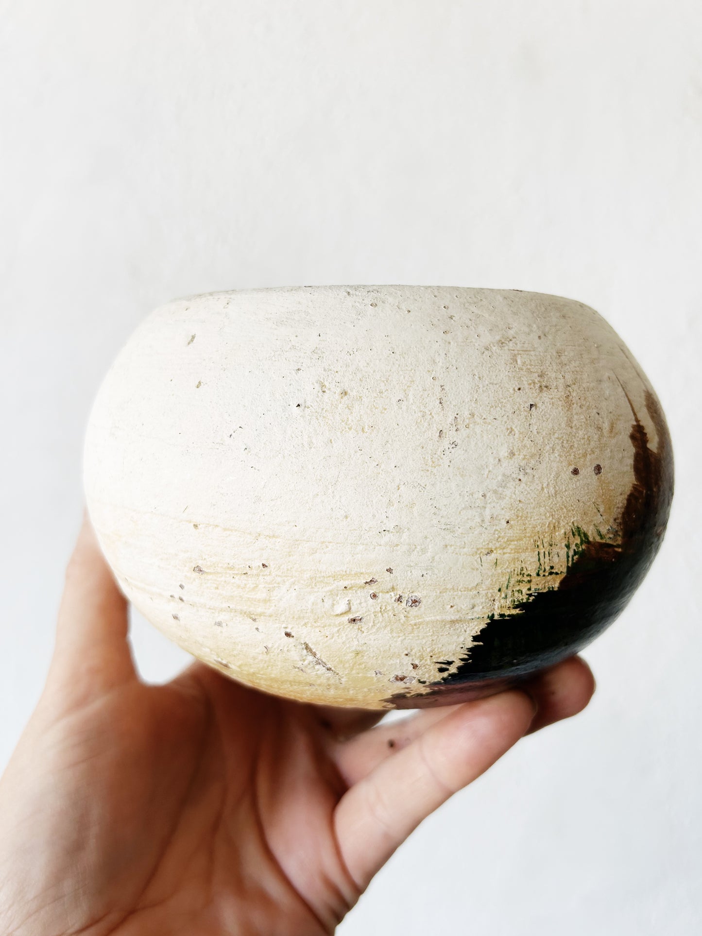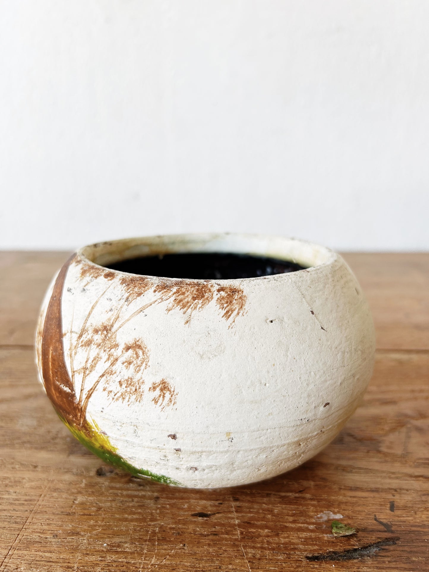 Little round terra cotta pot with drainage. Sweetly hand painted landscape