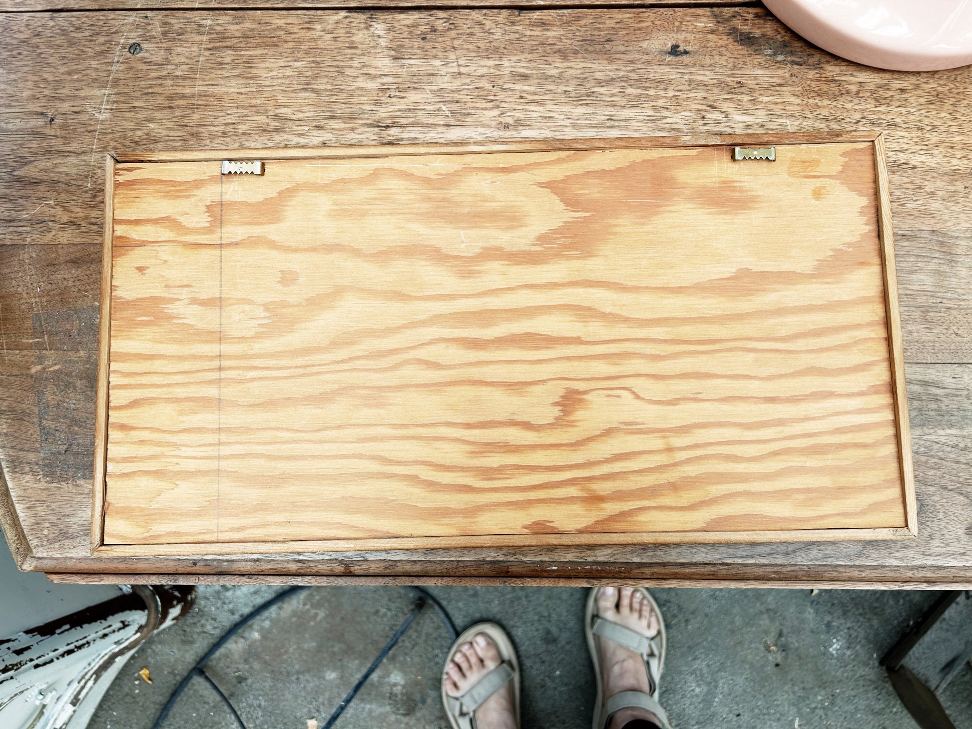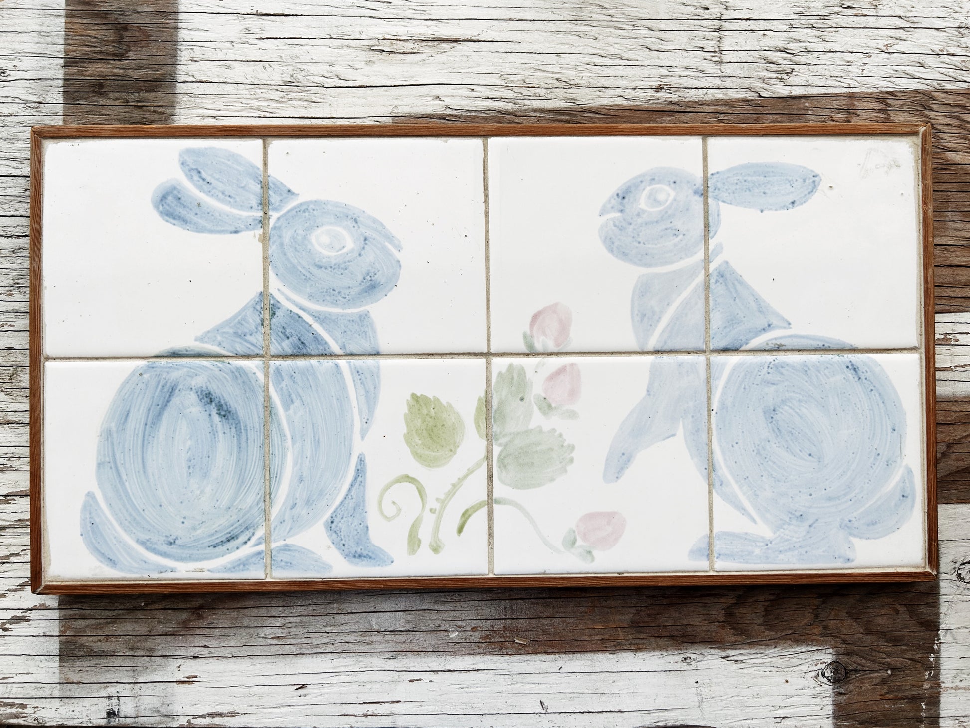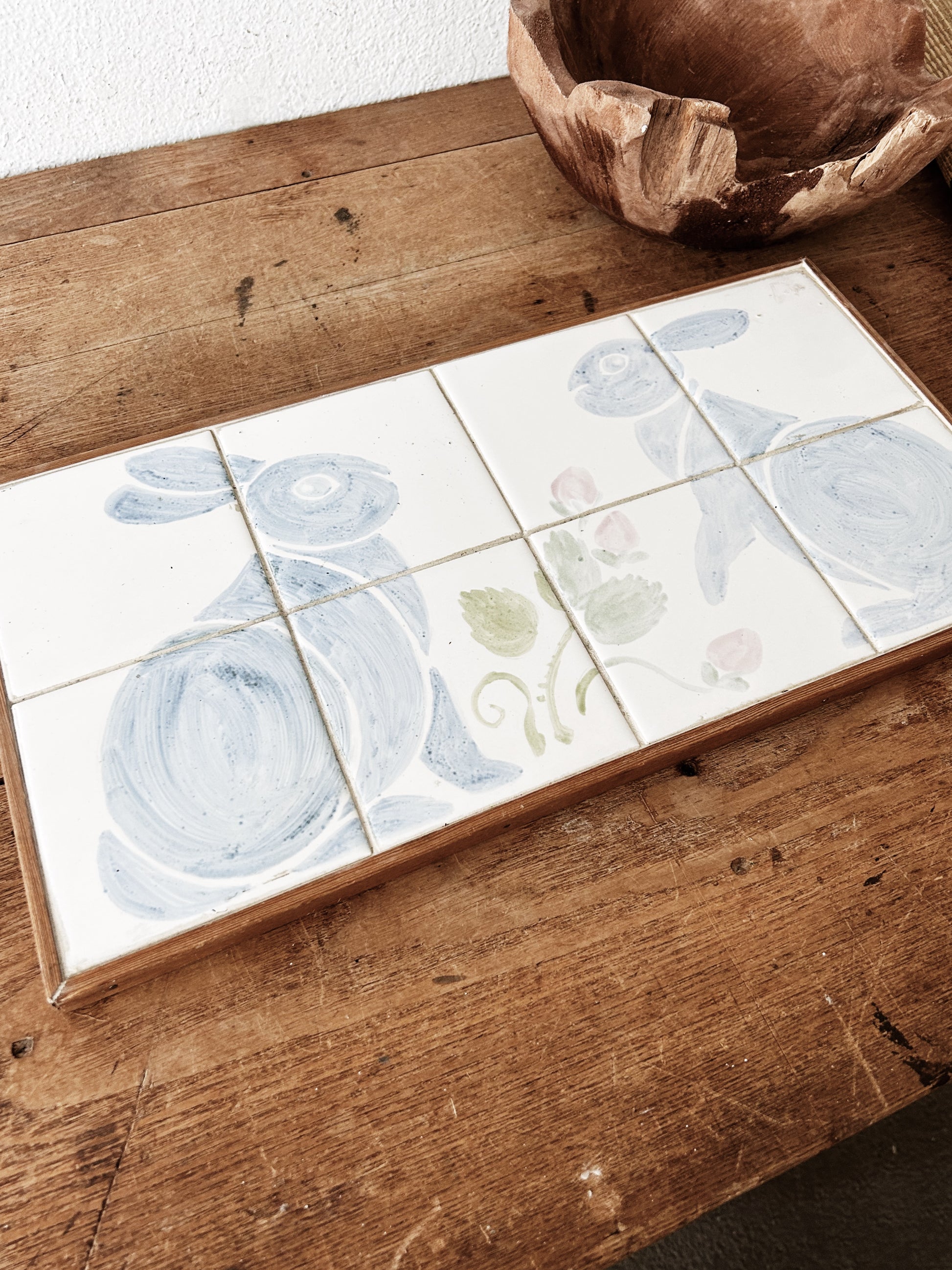 Love this piece. Eight hand painted tiles set in a natural wood frame. It has hangers on back should you choose to hang it.