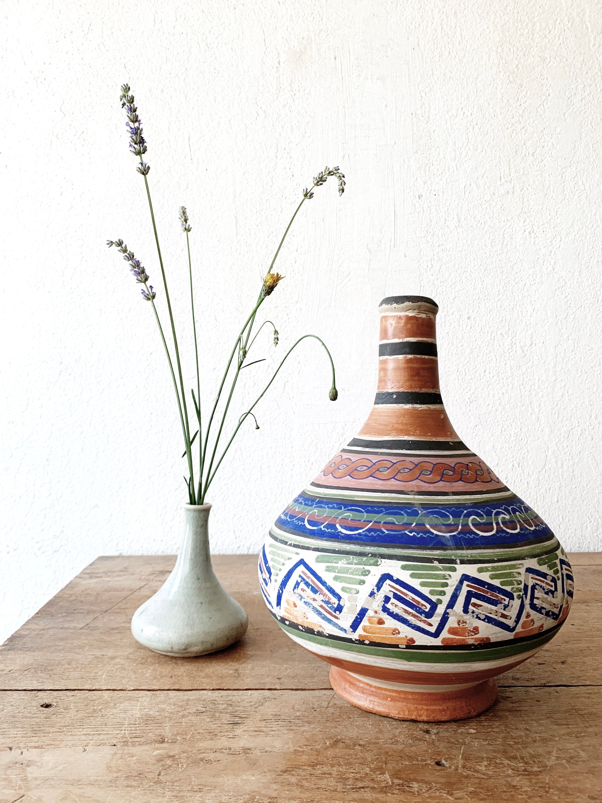 Large hand painted Mexican Clay water jug. Love the colors and patterning on this one, unusual! Lovely simply as an art piece, or for housing a bouquet