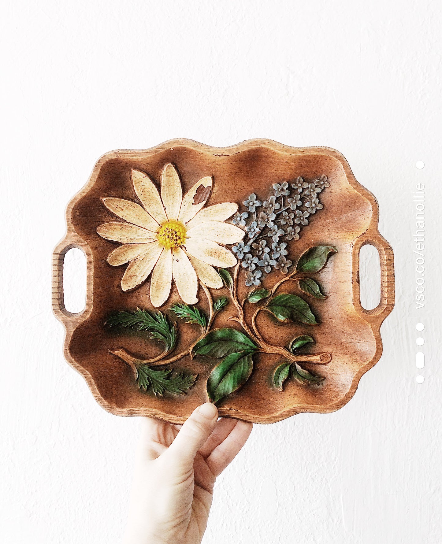 A sweet carved syroco wood tray. Spring flowers are faded and cheery.