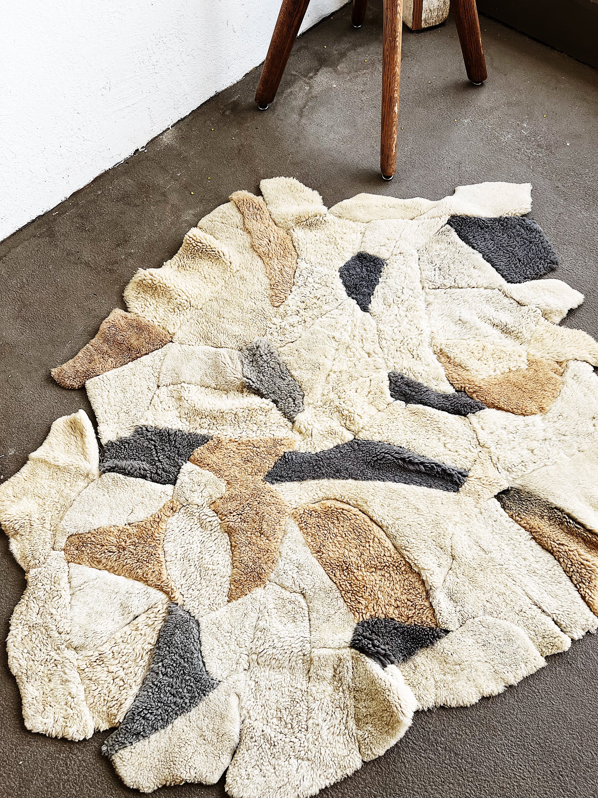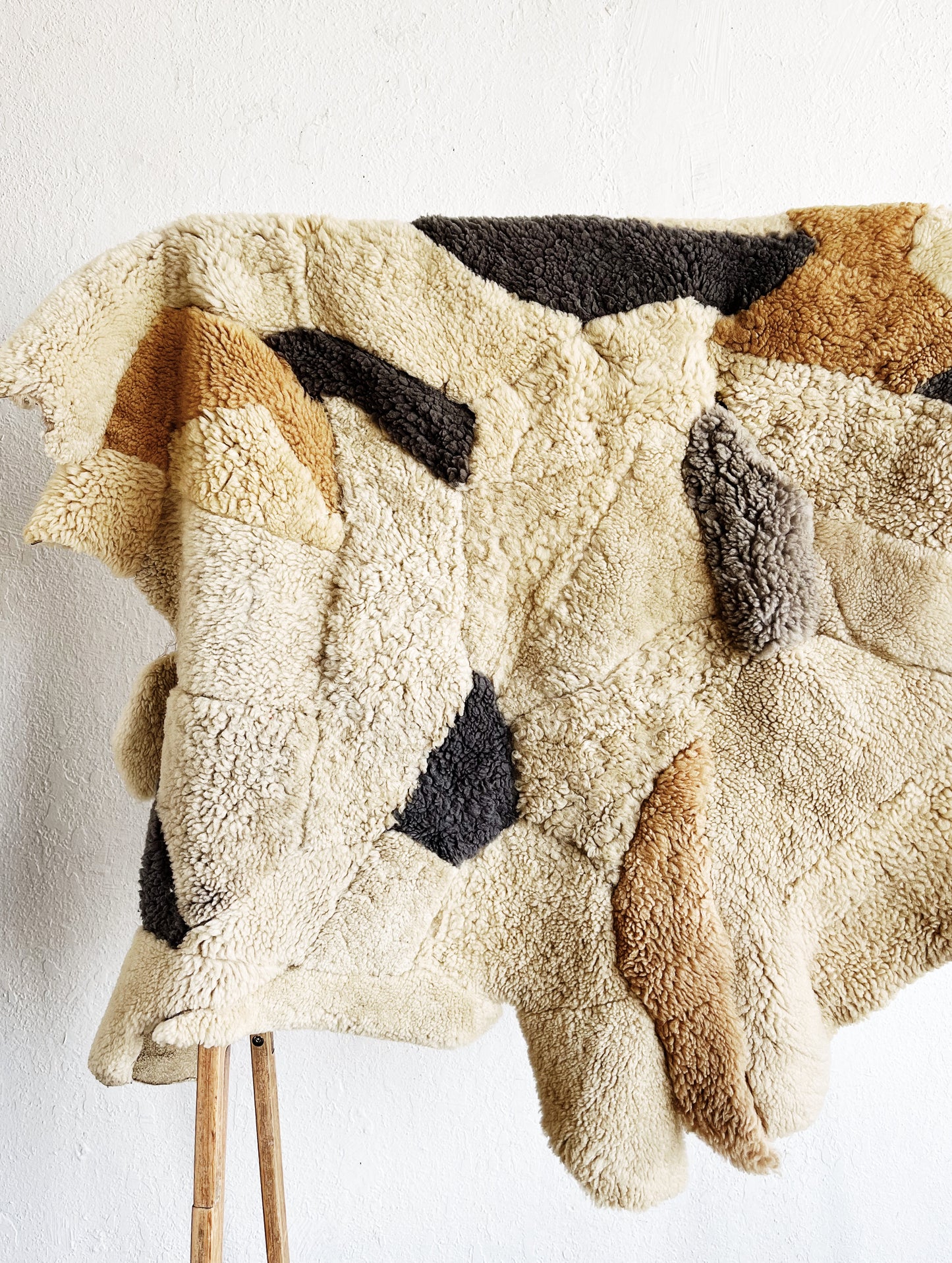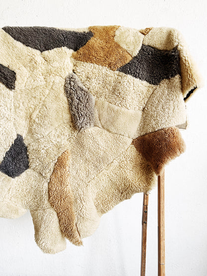 Genuine wool sheepskin, patched with various types of wool. Hand stitched. Makes for a nice rug, or even thrown over a couch, chair or bench. Clean and in good condition