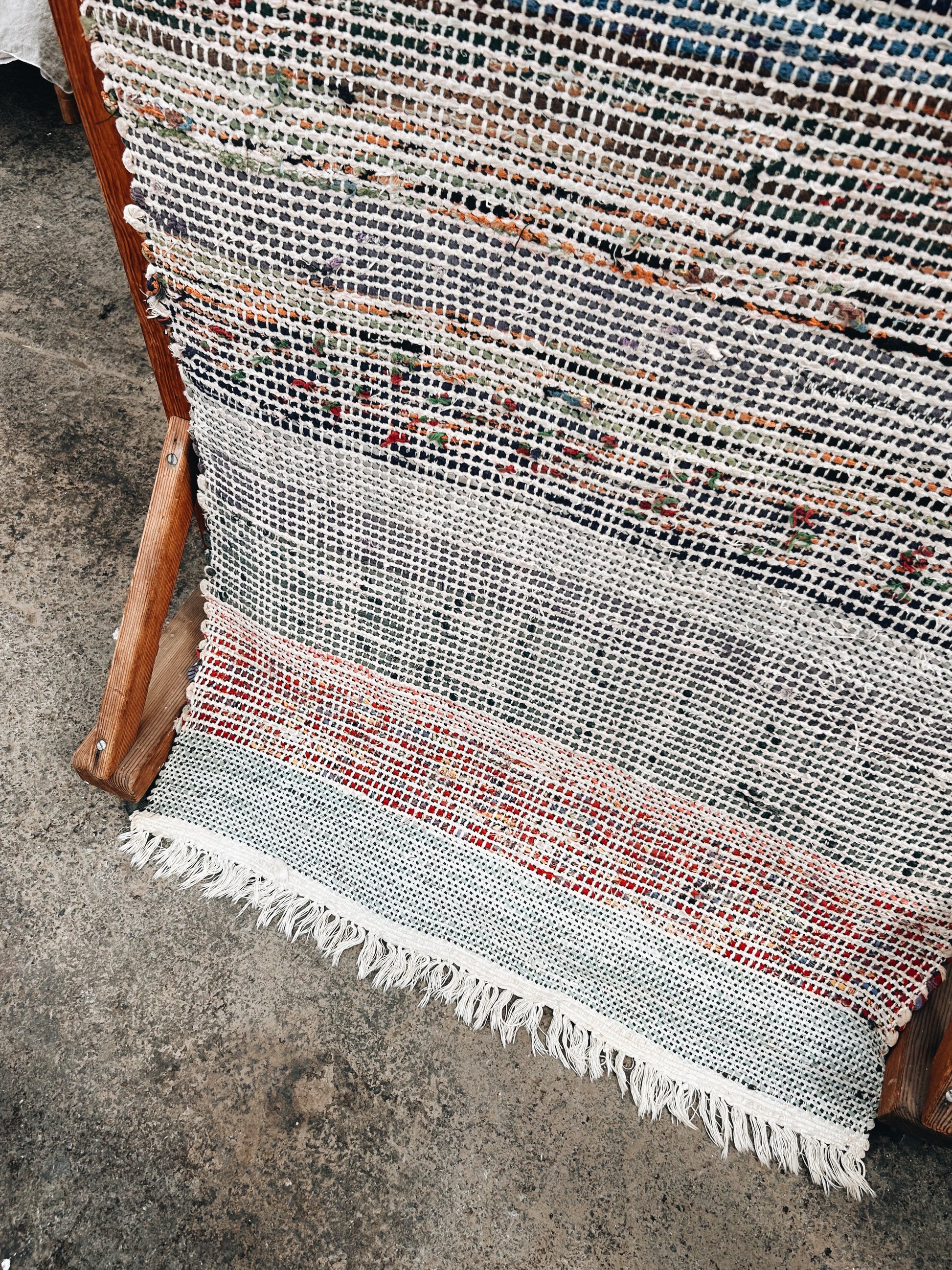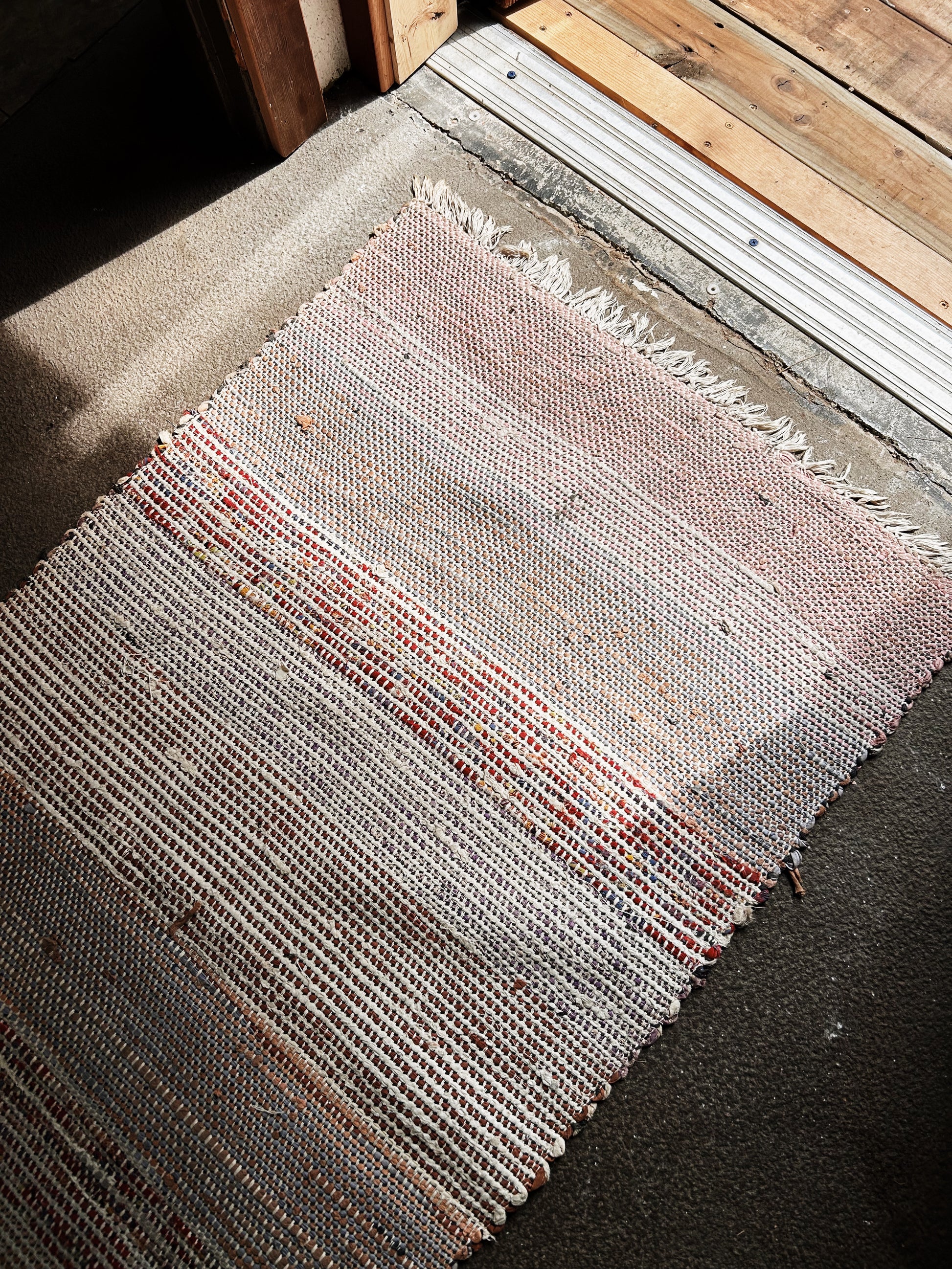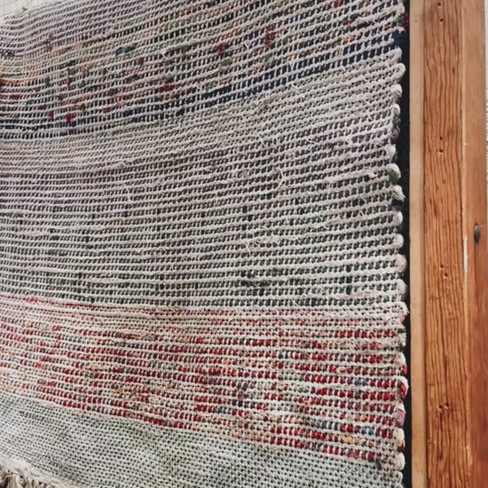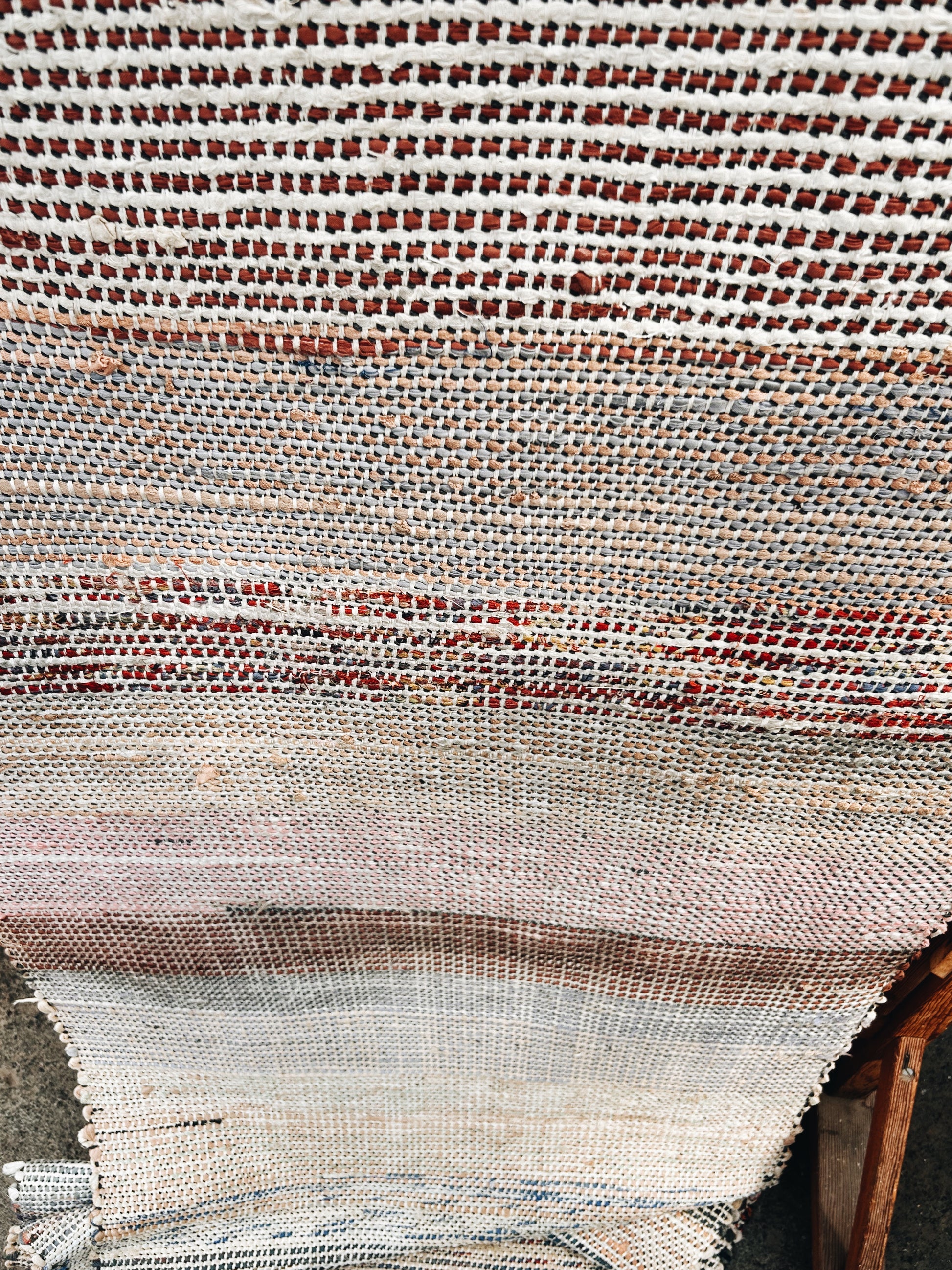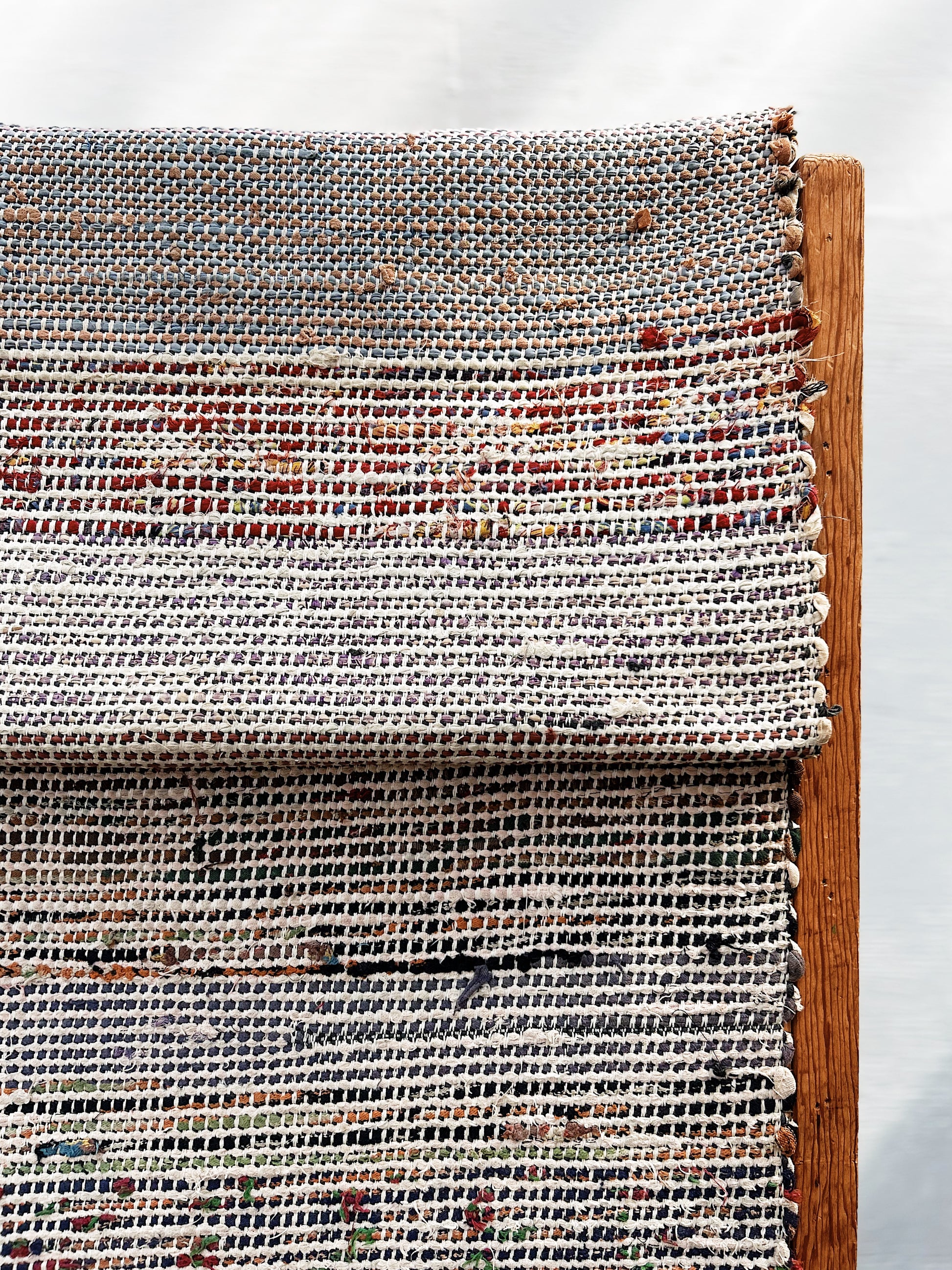 Extra long and stunning cotton rag runner. The colors harmonize and undulate as the rug goes on. Soft and sturdy cotton. For a nice long space or if you're handy, you could cut this in half and sew the pieces together for a wider and shorter piece. In nice condition
