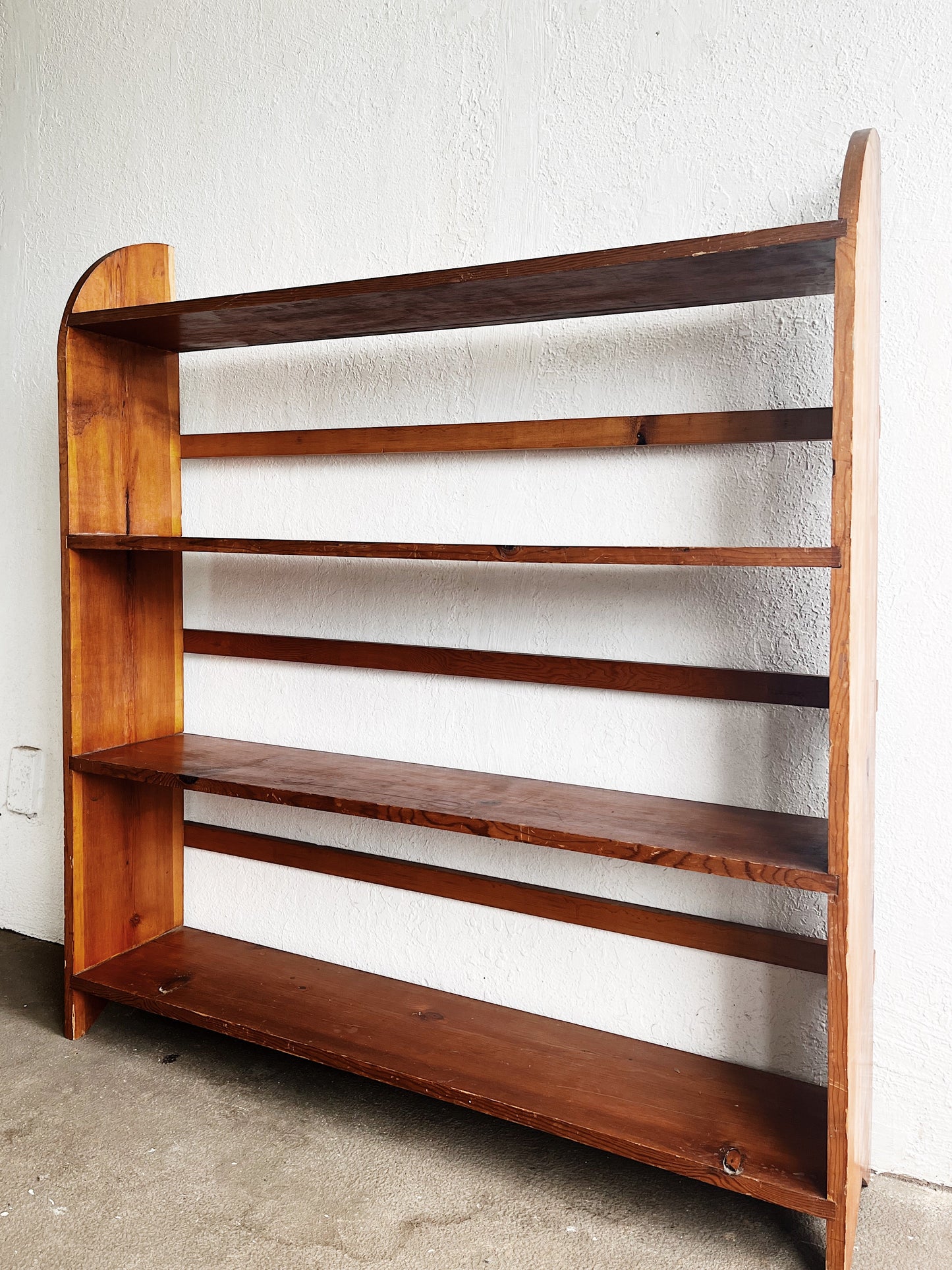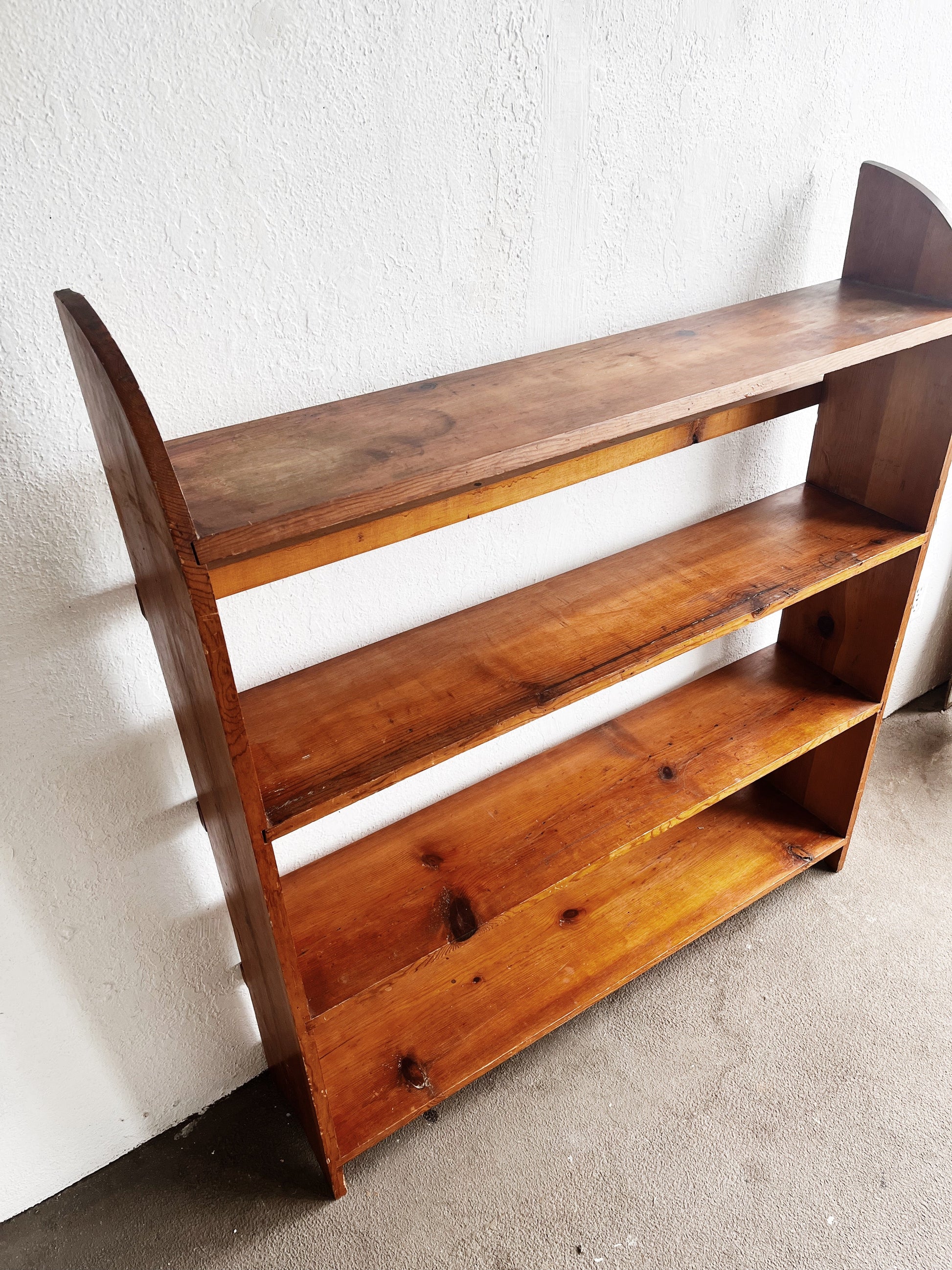 Nice looking vintage handmade bookcase. The wood has taken on a rich and mellow tone. Nice details in the rounded corners and cross bracing. Sturdy with a small amount of age related surface wear, as shown.