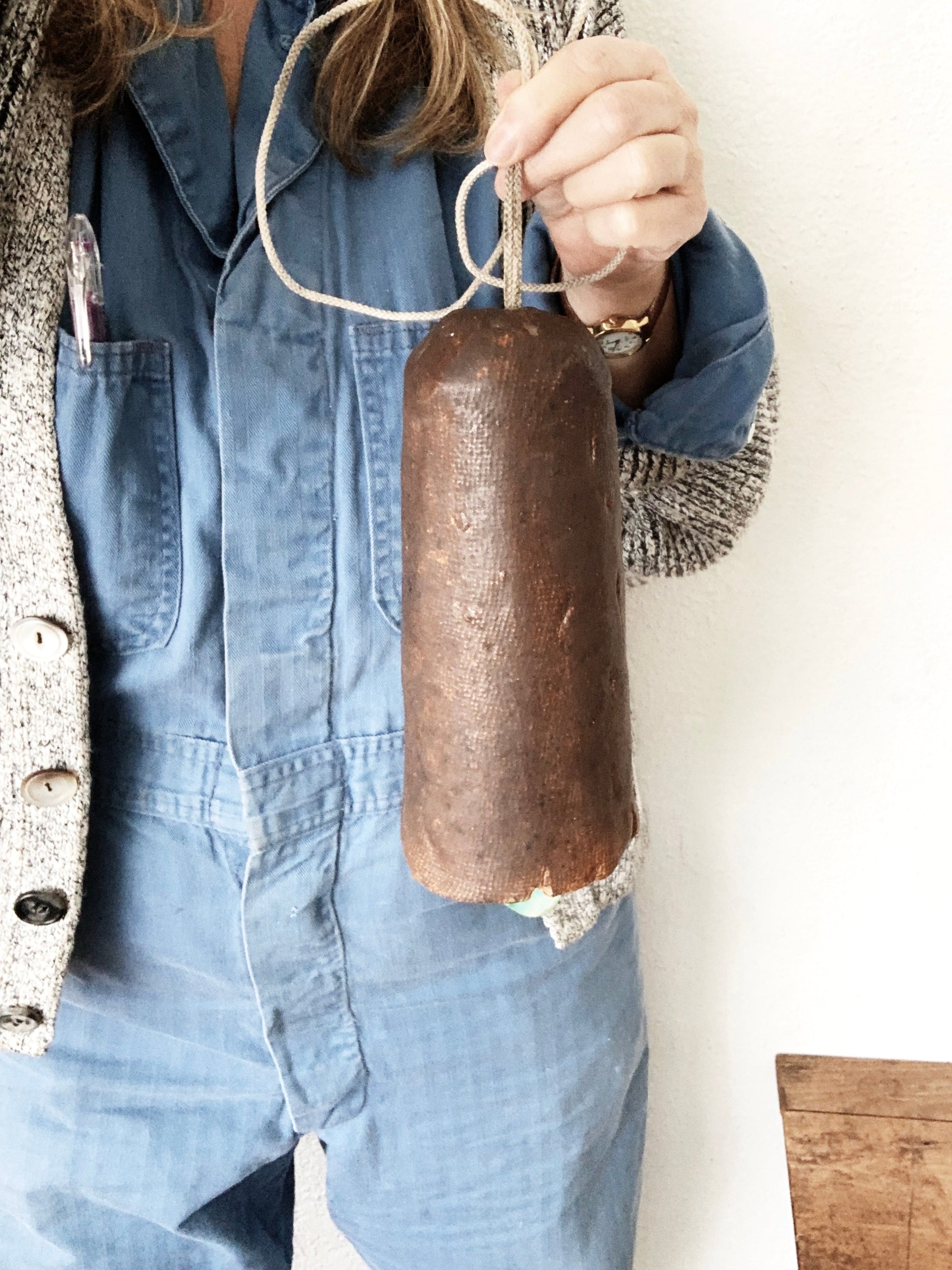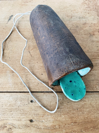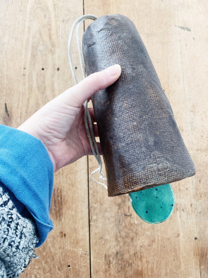 Large earthy hand built bell with turquoise glazed chime. Signed. Strung on cotton cord. 9”
