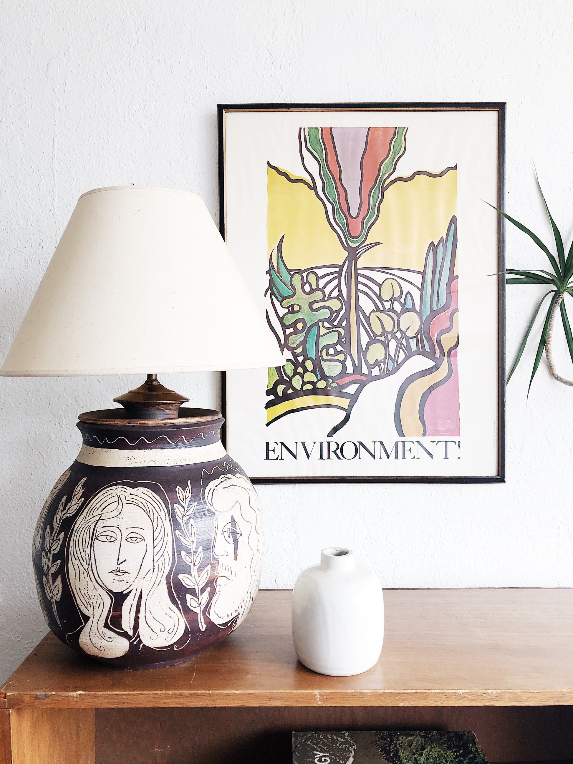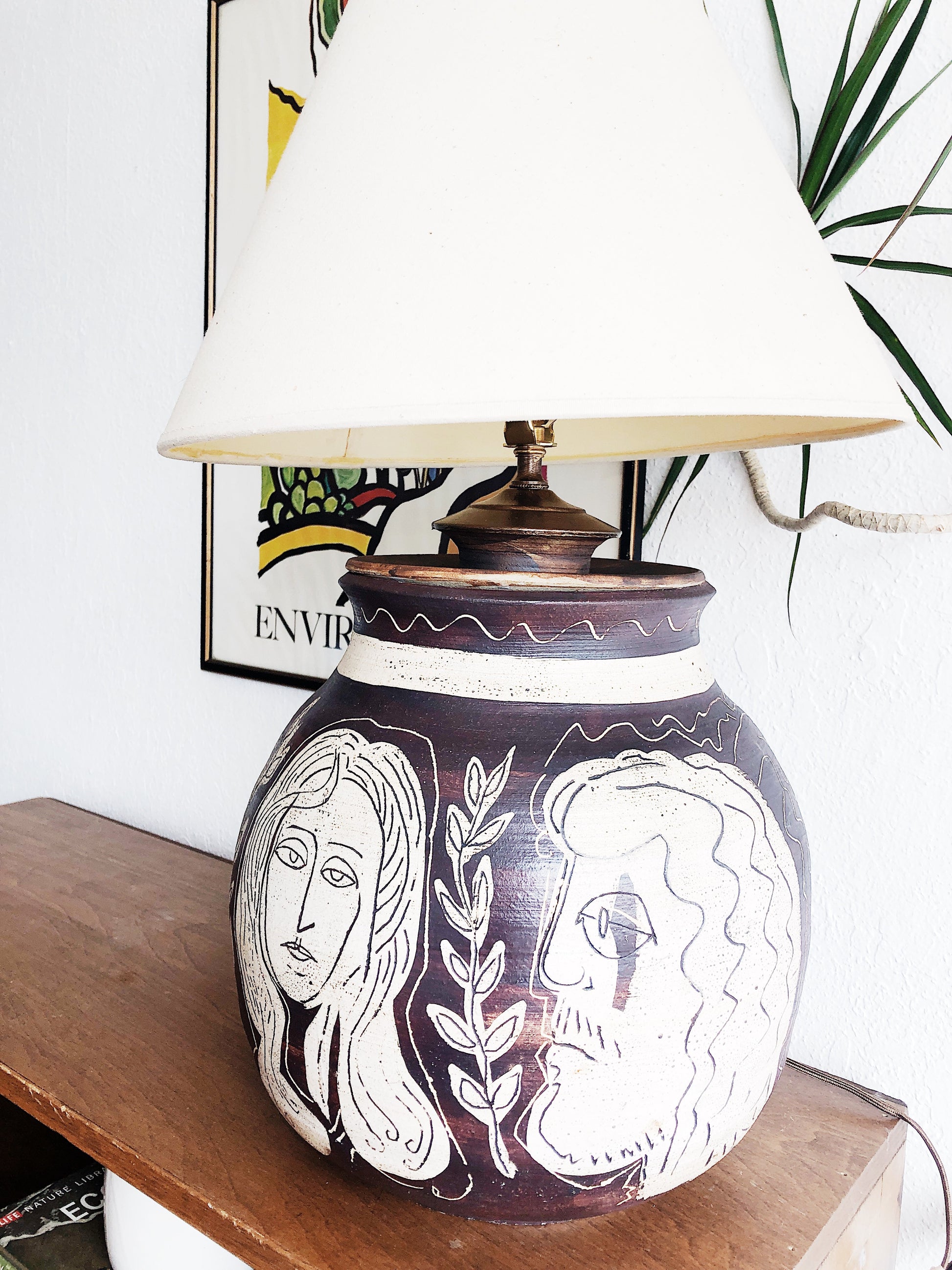 What a piece! Handmade originally as a giant canister, and then fashioned into a lamp. The design is unique all the way around. Part Greek god and goddess, part folk. Original wiring. It’s simply amazing