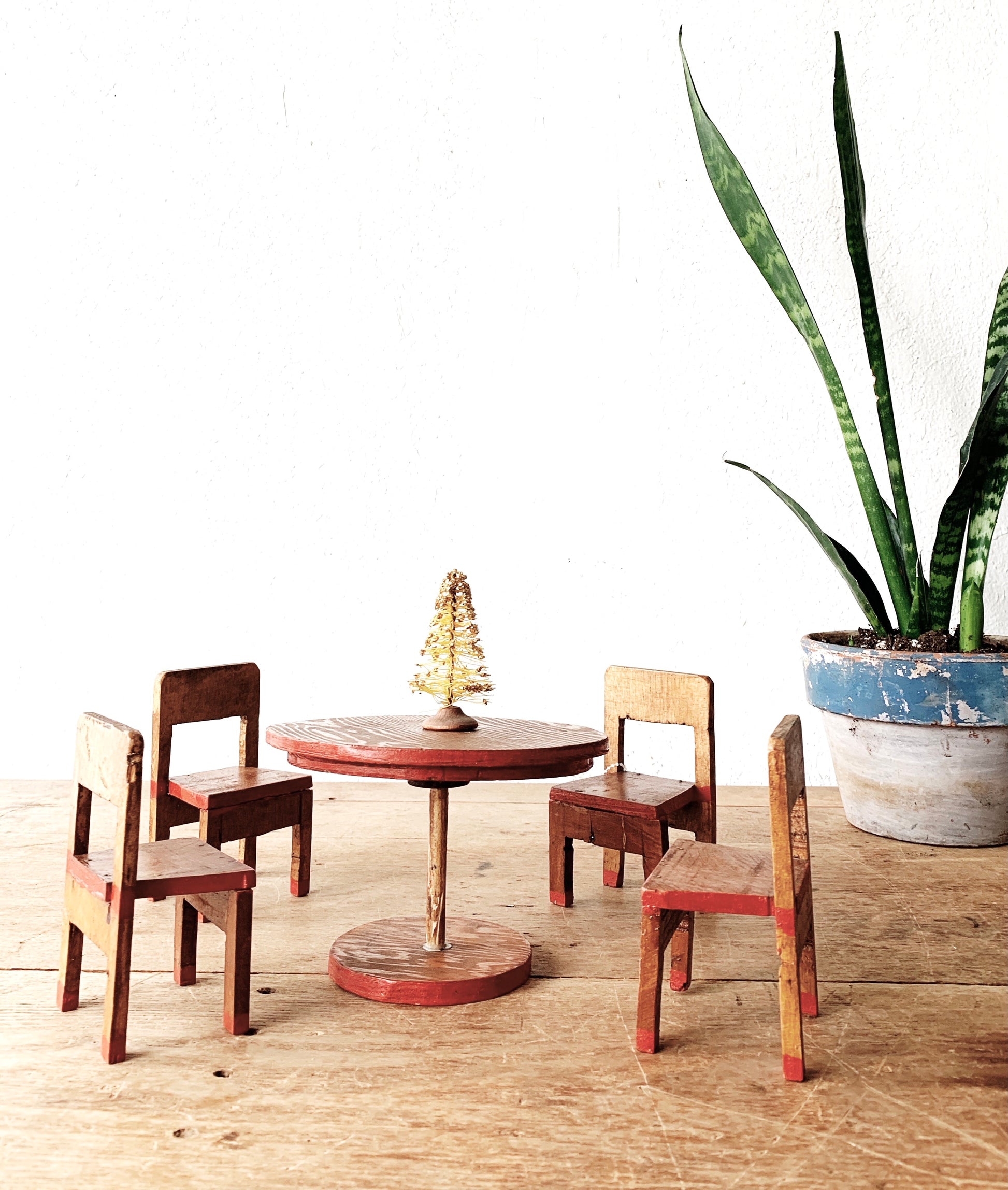 A wonderful vintage handmade set of four chairs, round table and small flocked tree. Fun for adults too! :)