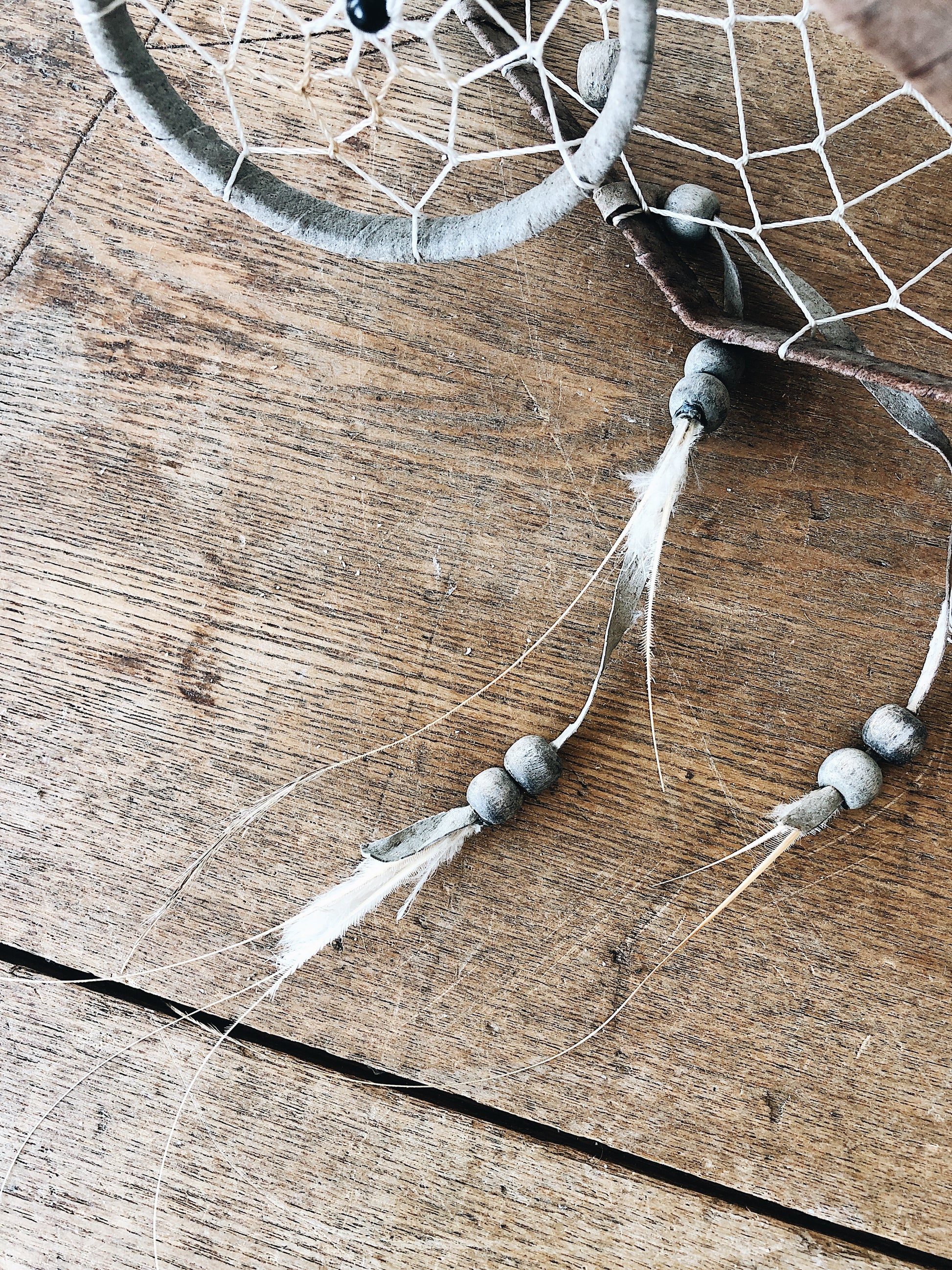 Copper chimes with handmade net and leather dream catchers above. Delicate wispy Feathers and wood beads too! Lovely sound
