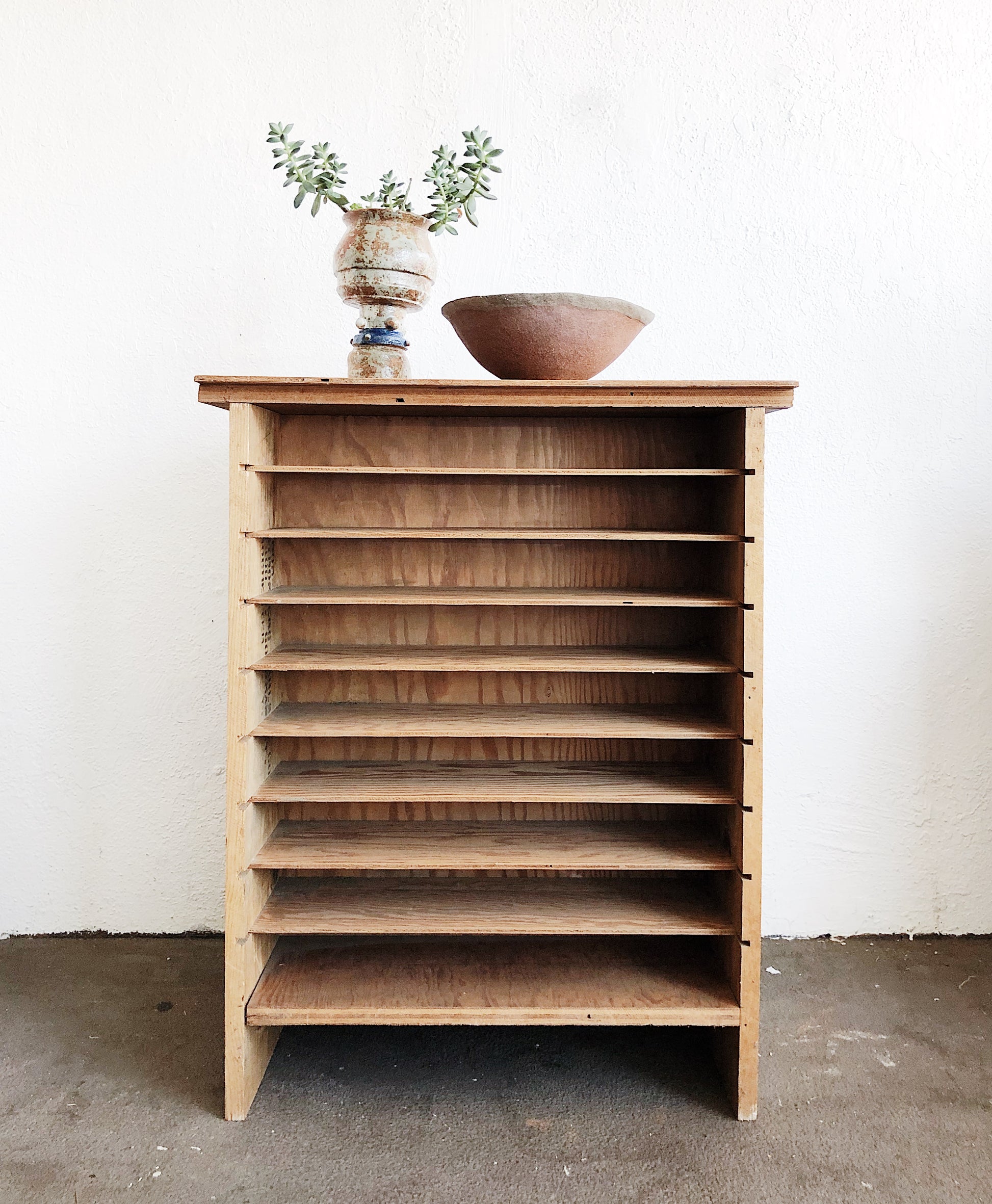 A handmade vintage flat file / narrow shelf unit. Double sided. One side is open. The other side has a door. Ply. Very sturdy and well made