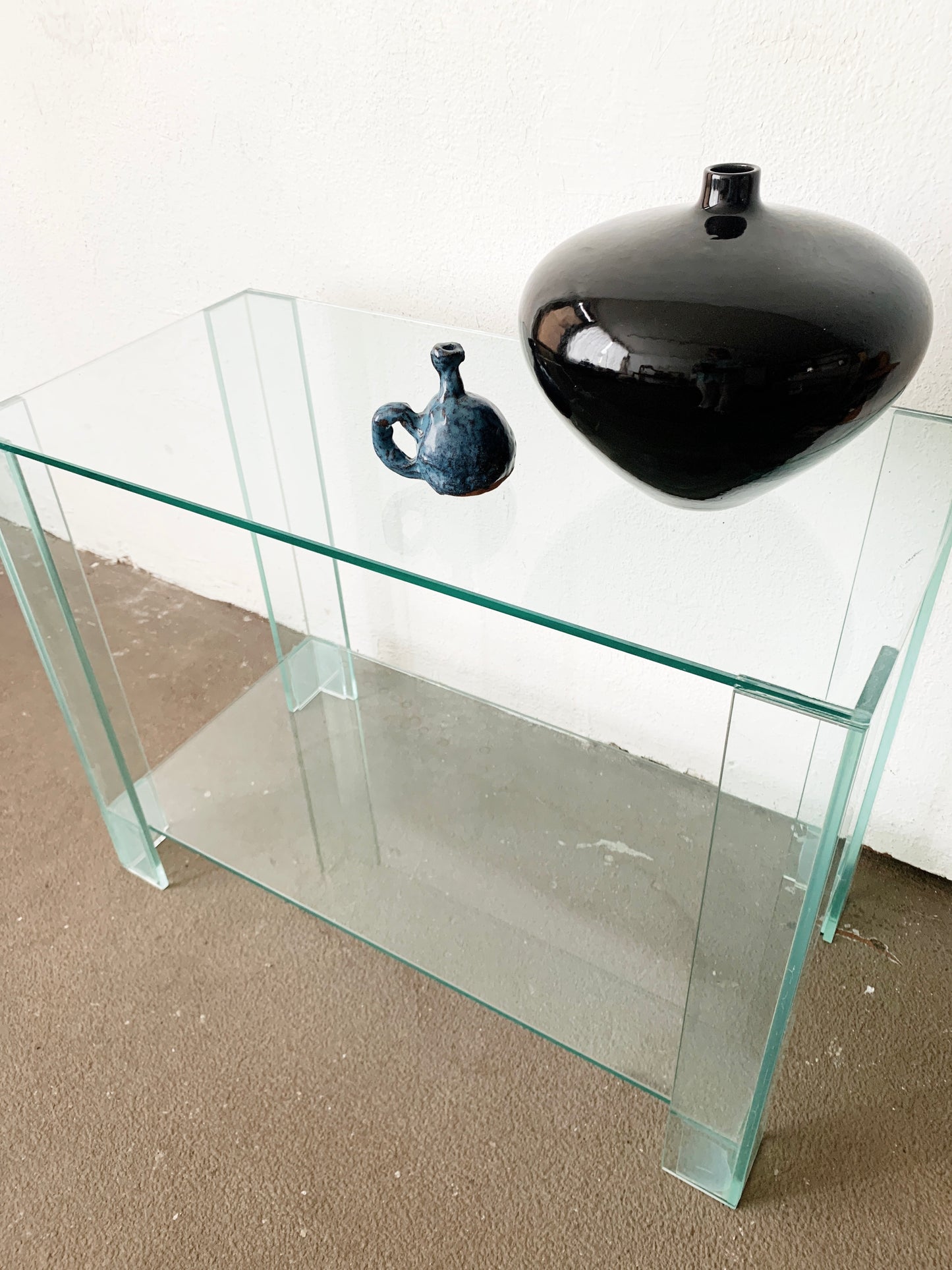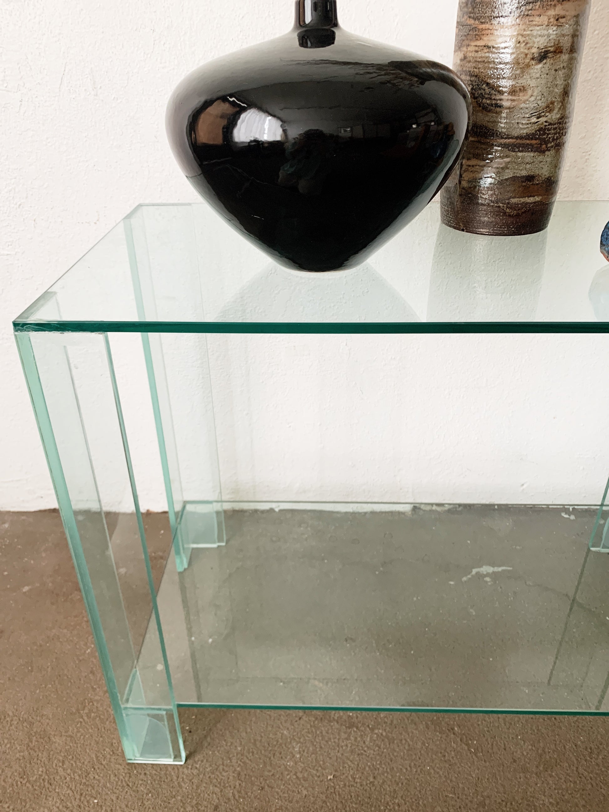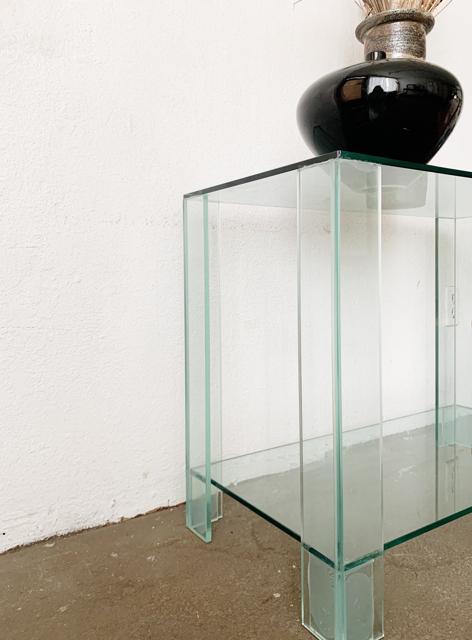Vintage handmade glass console table made by a retired Portland glass artist. It’s weighty and the glass is thick. Parsons style console for local pickup.