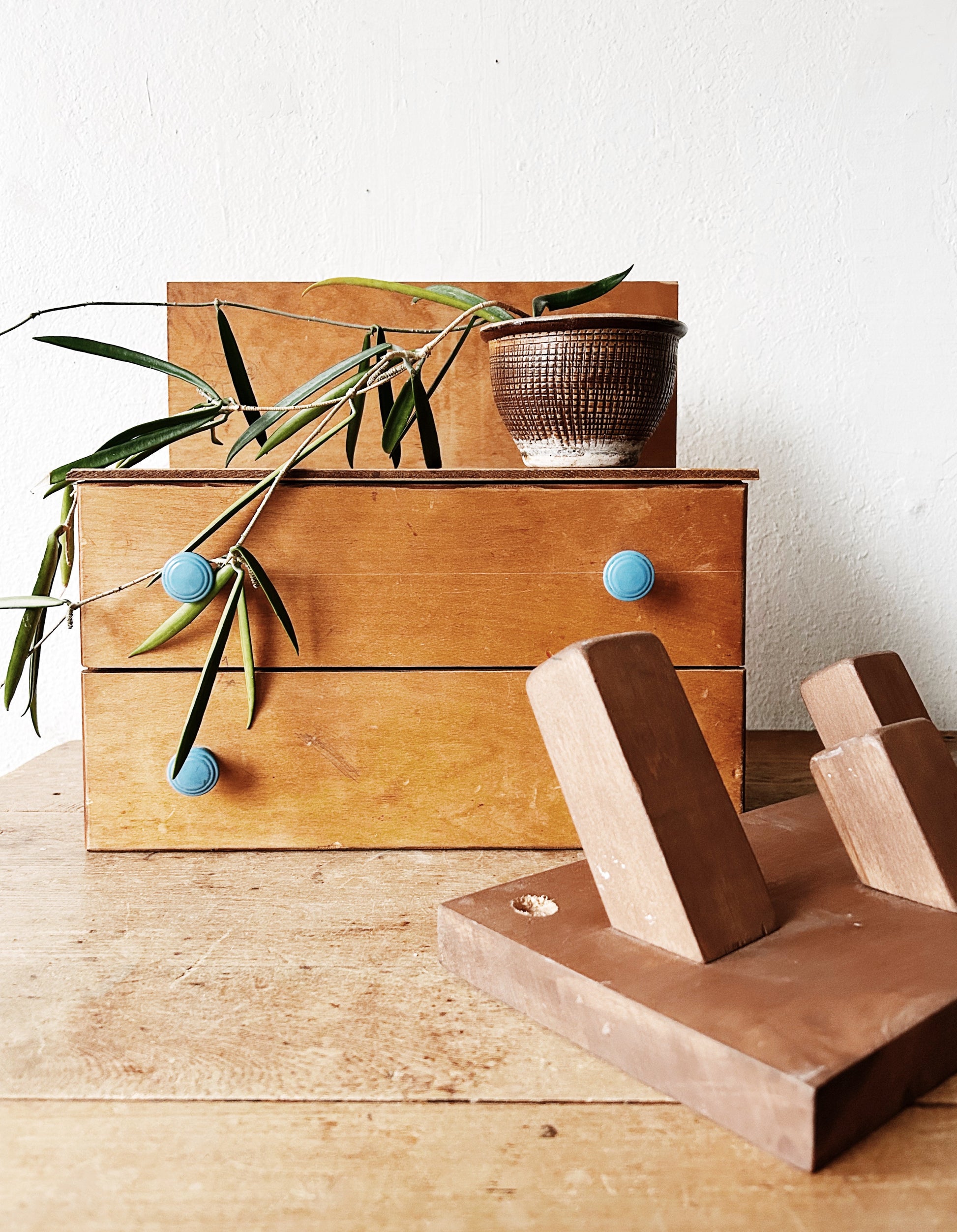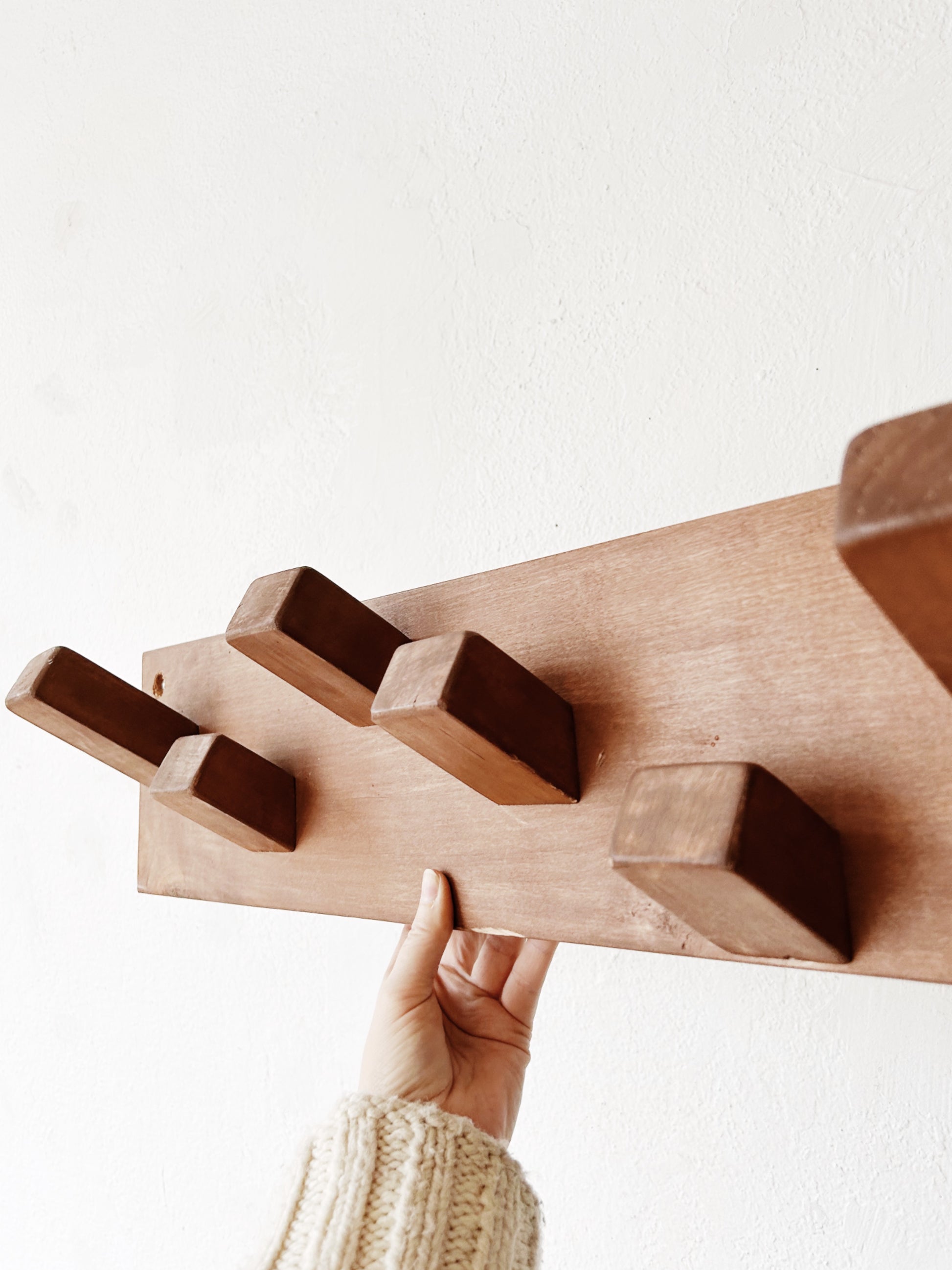 A unique blocky peg rack, vintage handmade. Such a great look, and useful. Sturdy enough for coats, towels etc. Integrated holes on each end for hanging.