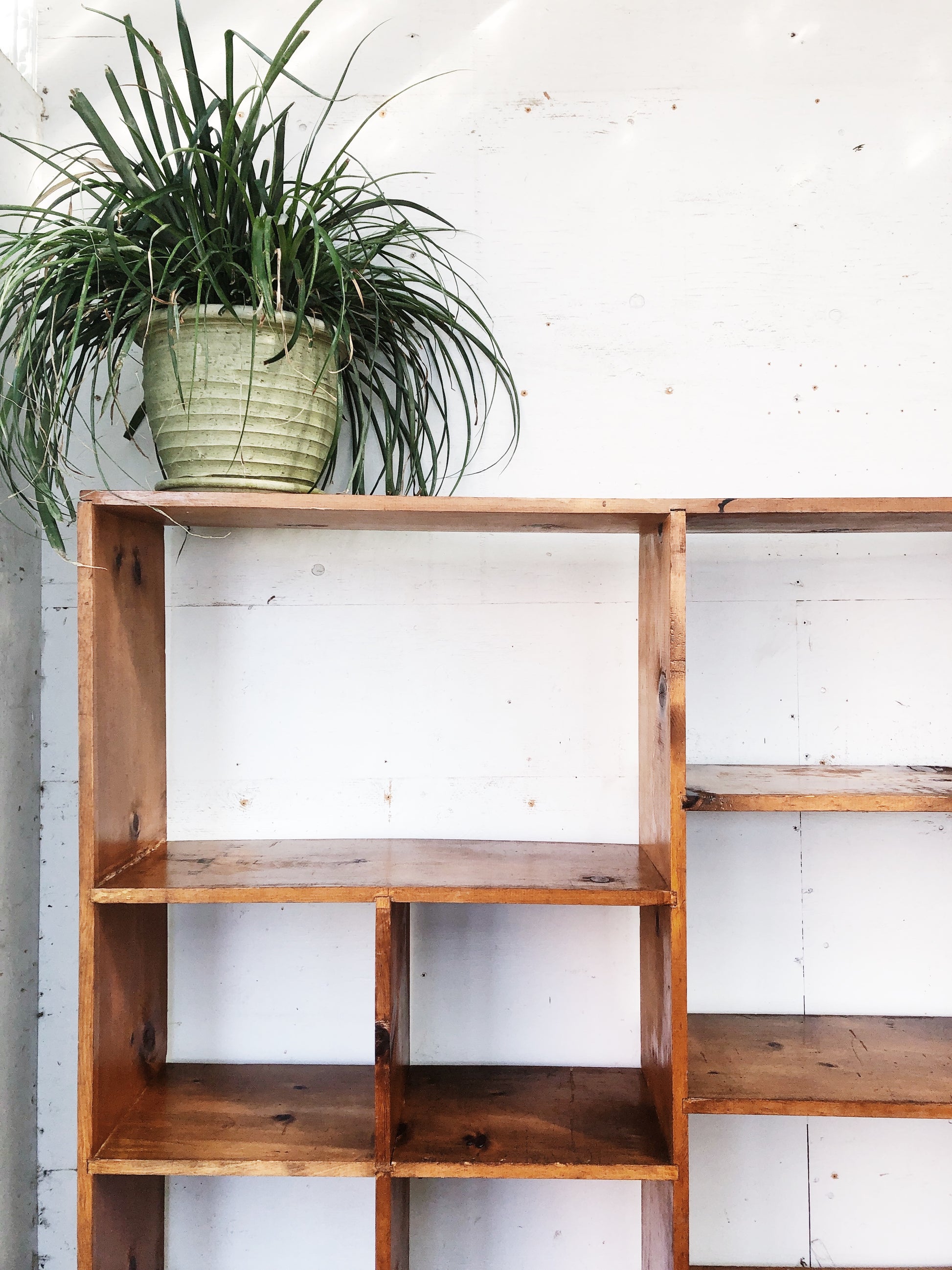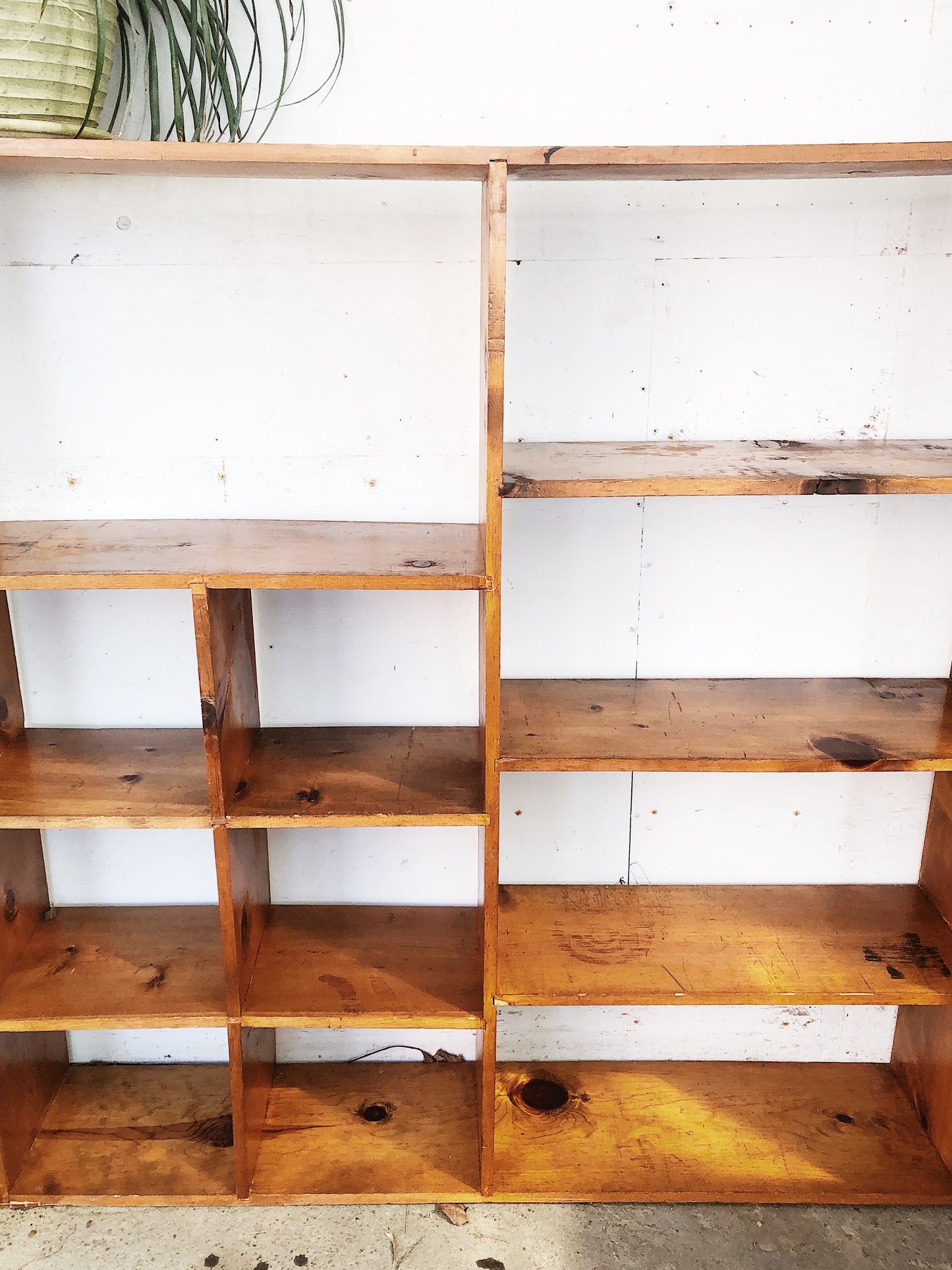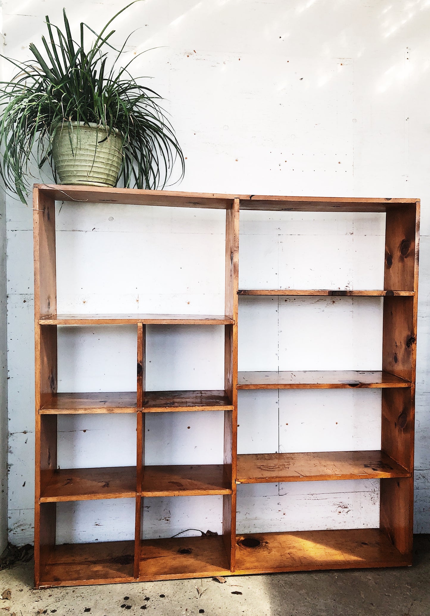 A large knotty pine shelf, handmade. Lots of different sized cubbies for display. Love the look of the wood. Would make a nice room divider