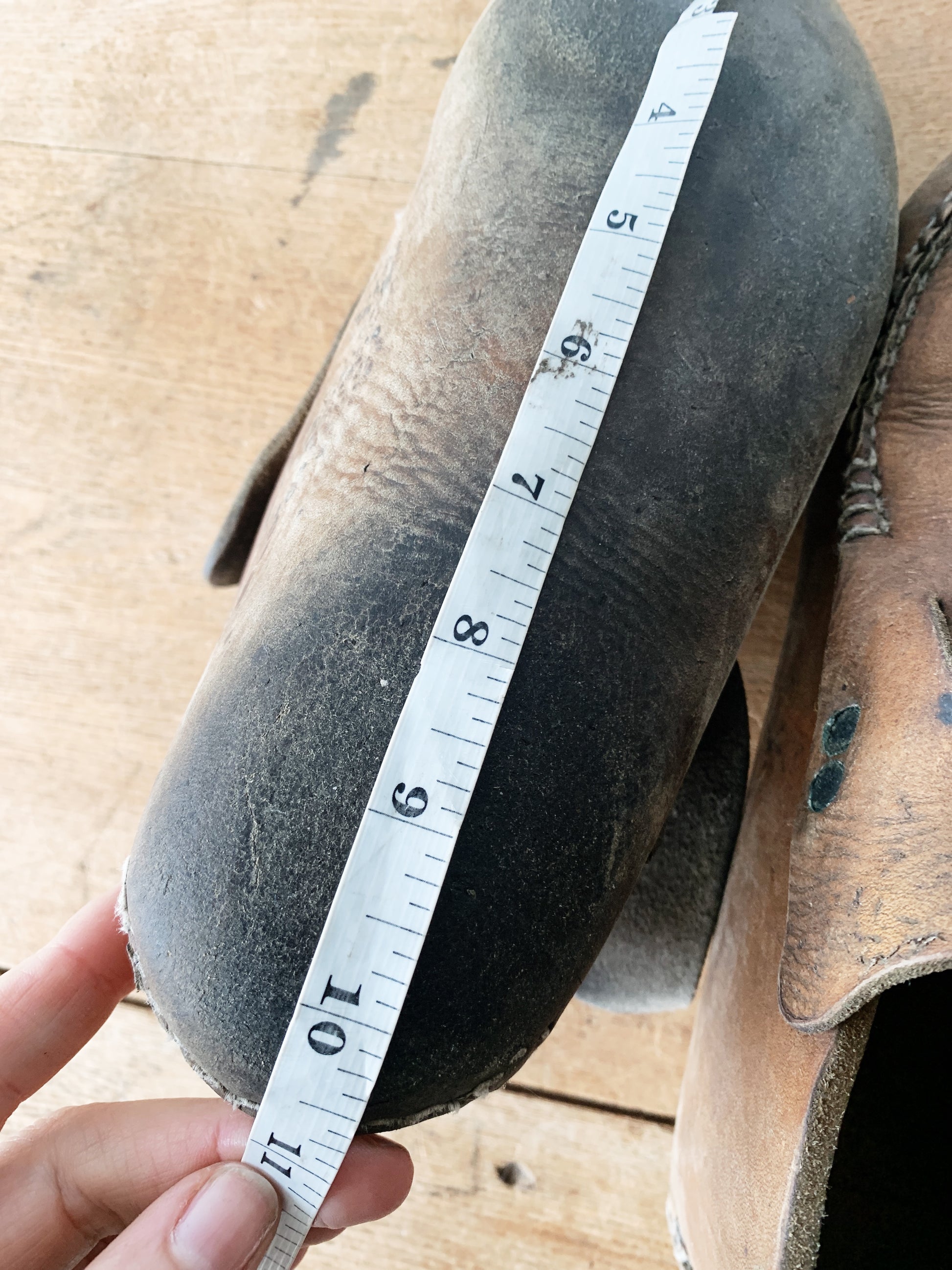 A great pair of handmade moccasins with thick hand stitched leather. Thank expertly made. They are well worn but no cuts, holes etc. vVery sturdy with many many years of life left in them!
