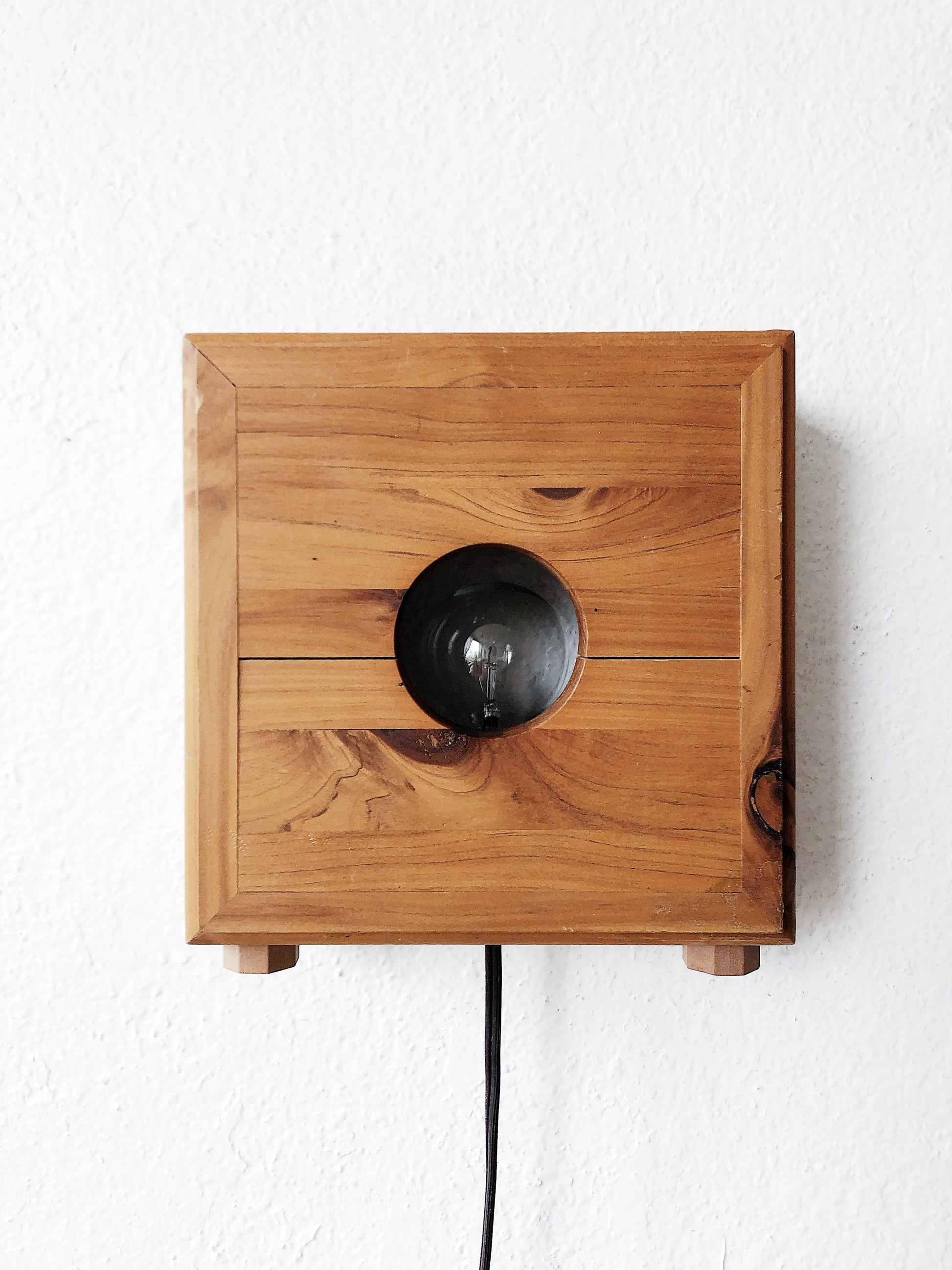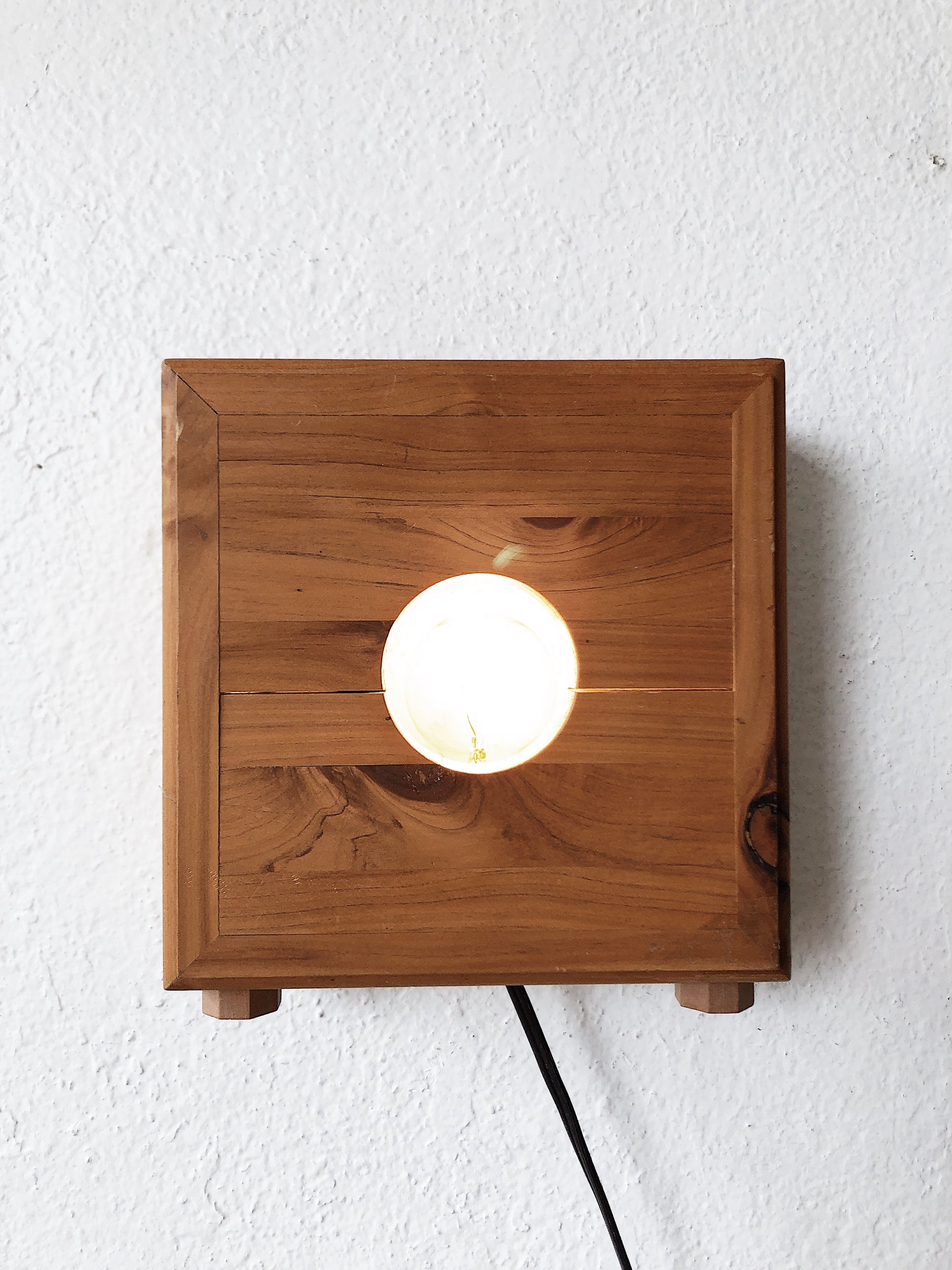 Seriously great vintage handmade box light. Has a nice craft modern look. The wood is beautiful and has little peg feet. Takes a chandelier base bulb. Included