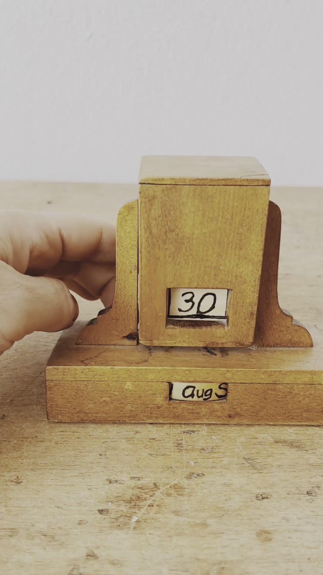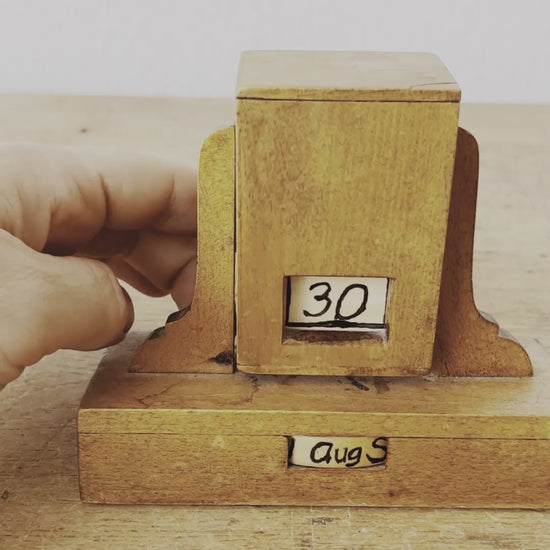 Unique object with ingenious perpetual flip mechanism. Dial in your month and flip for the day of week. All wood construction