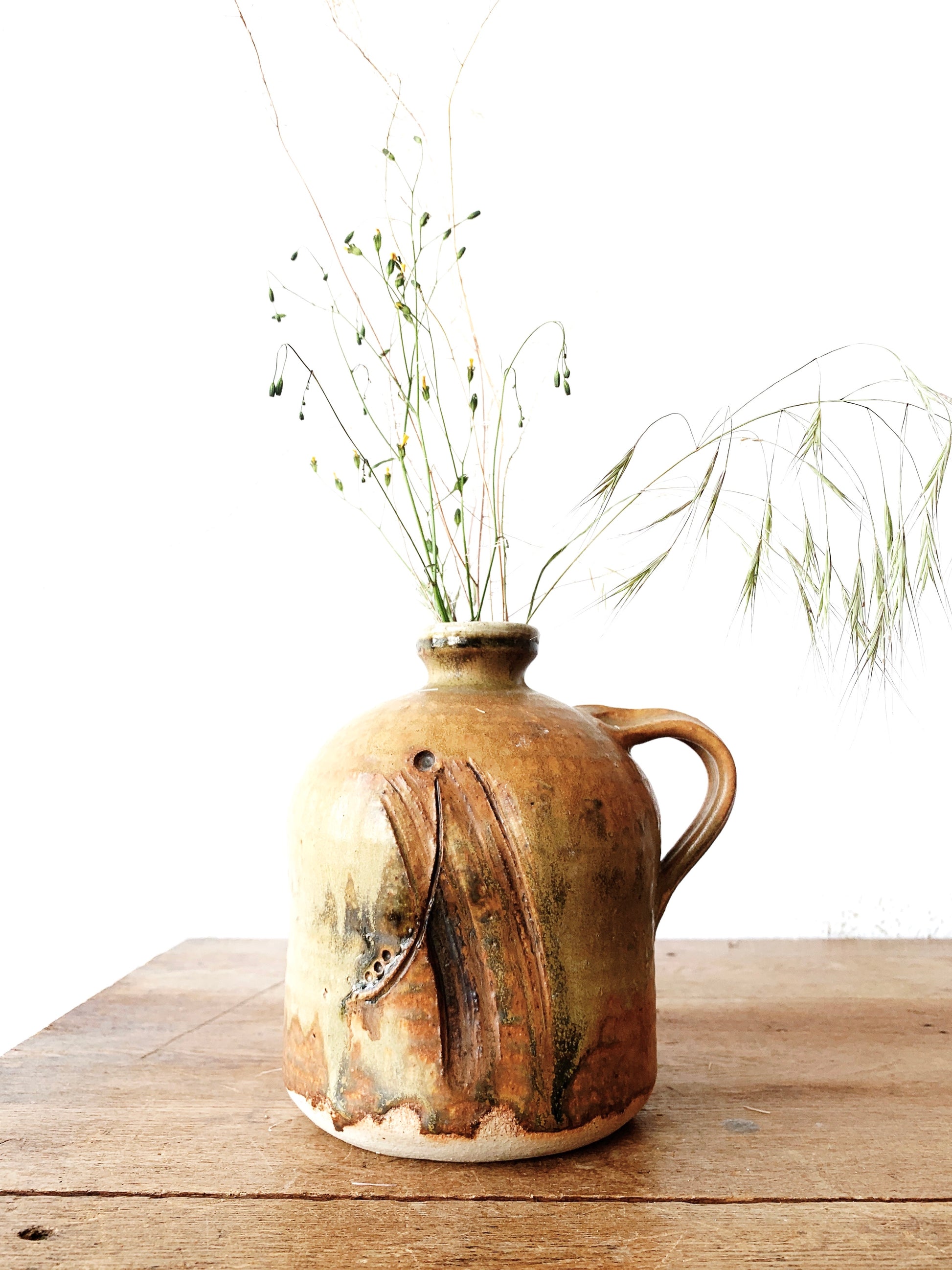 Vintage handmade pottery jug with pretty ochre and terra cotta glaze.