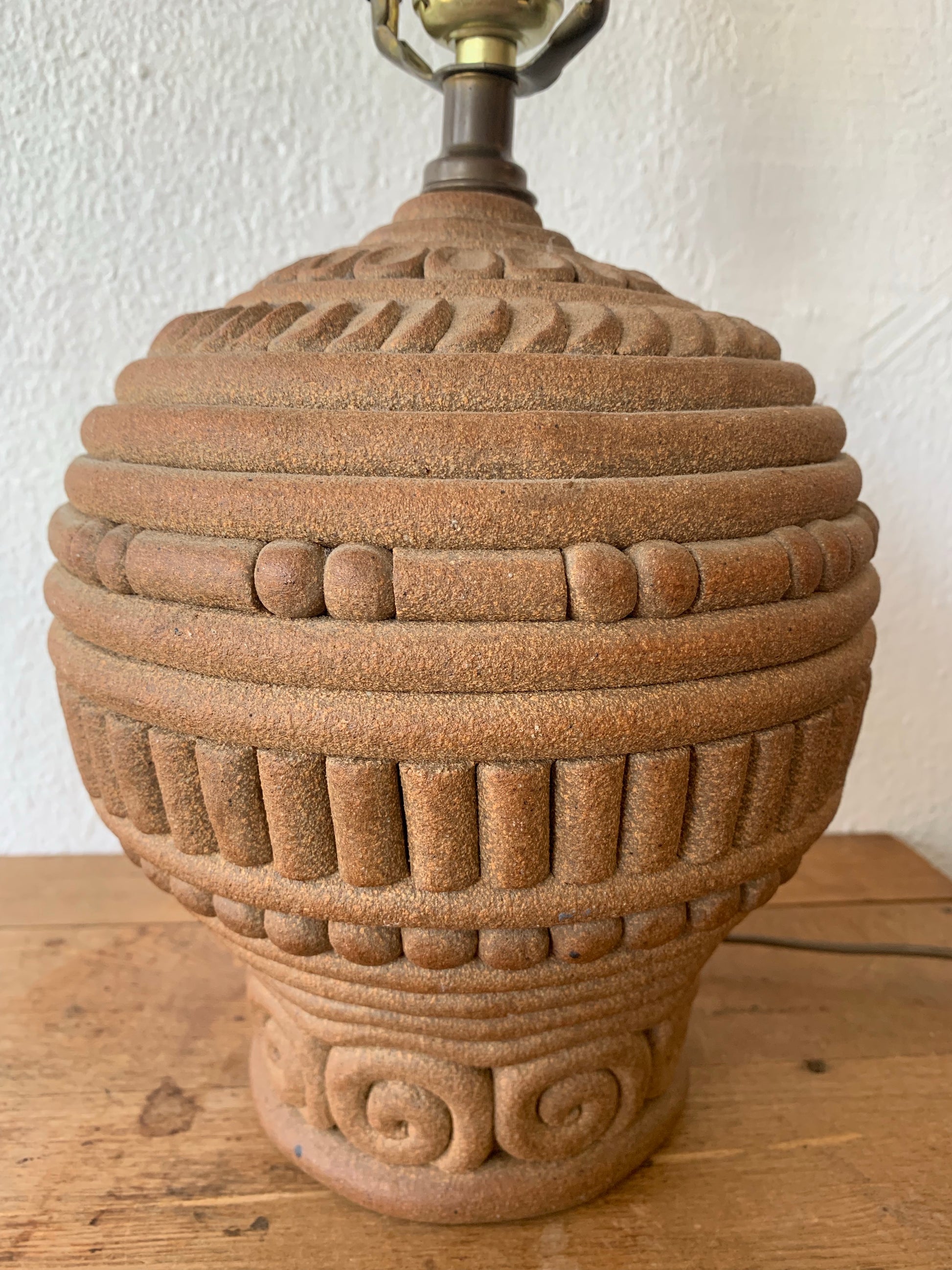 Vintage handmade pottery lamp with fantastic hand built coil work. Just awesome. Weighty too. Original cord, brass harp with finial. Works great.