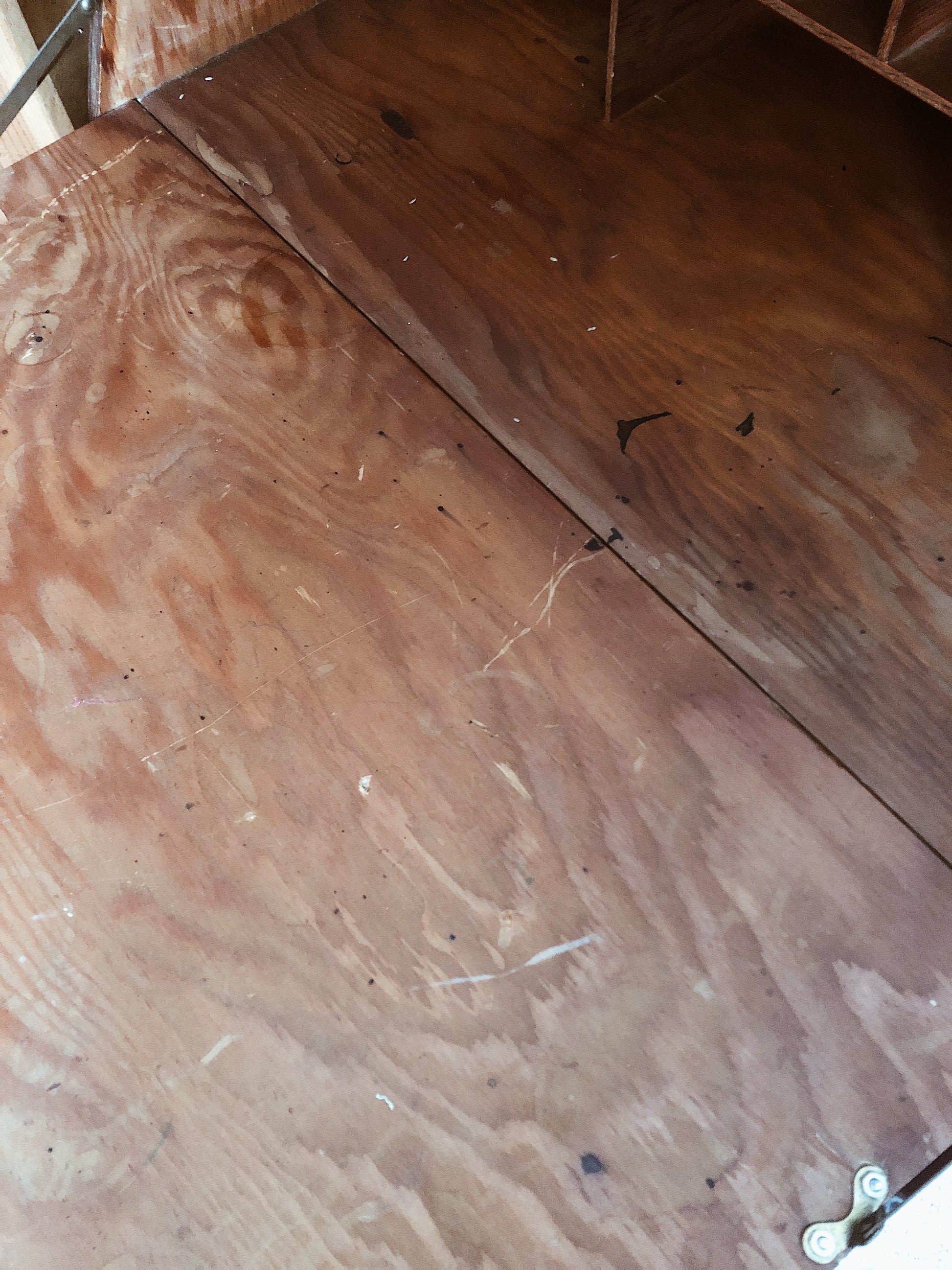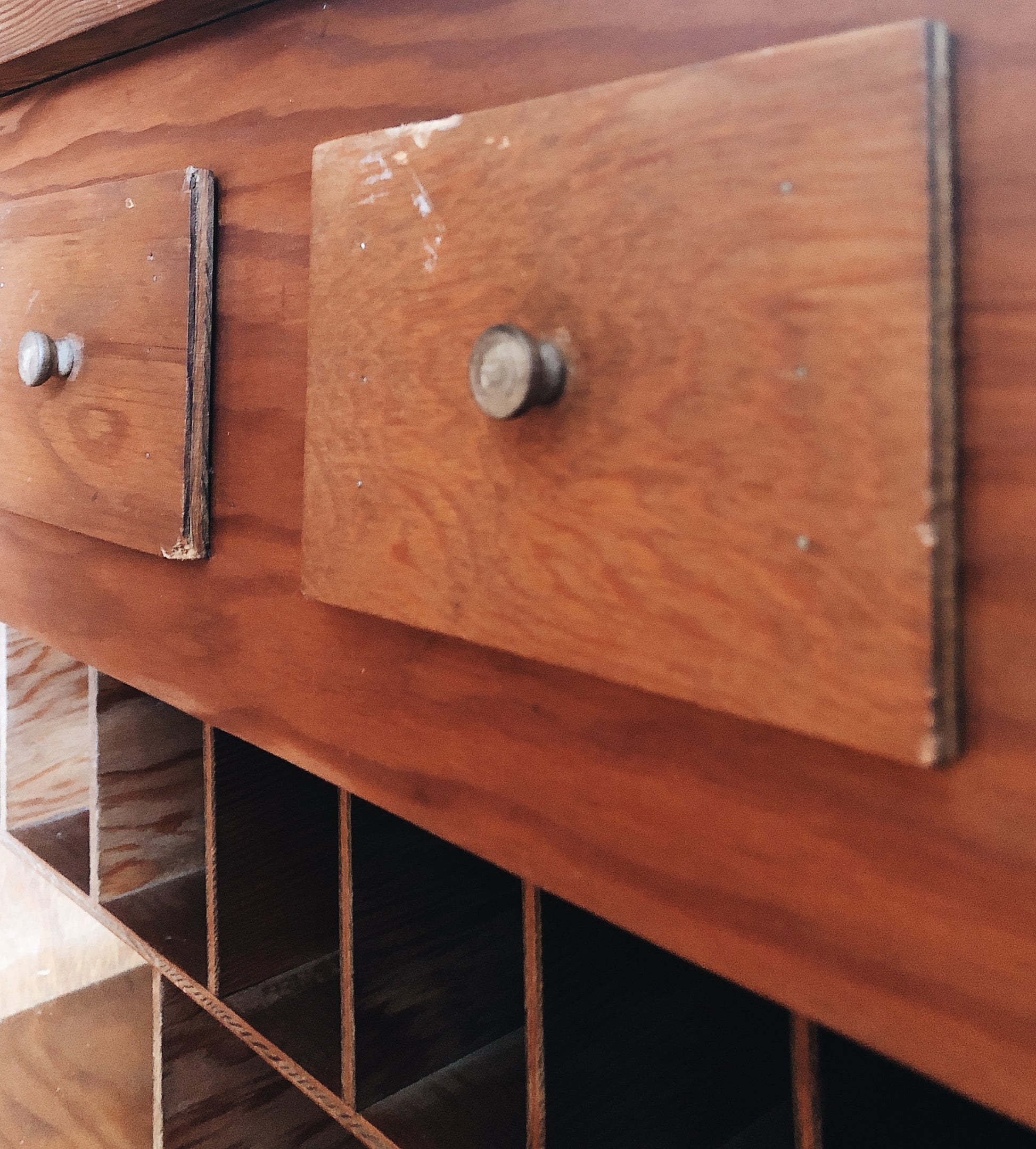 Condition: rustic condition. Some paint stain on desk surface and minor nicks throughout. All drawers slide easily.