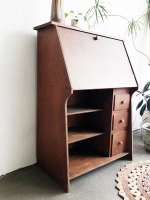 Handmade secretary desk. A very well made folk vintage piece made from stained ply. Solid and sturdy. Tiny drawers and bigger drawers and shelves and surfaces. Just a perfect rustic piece.