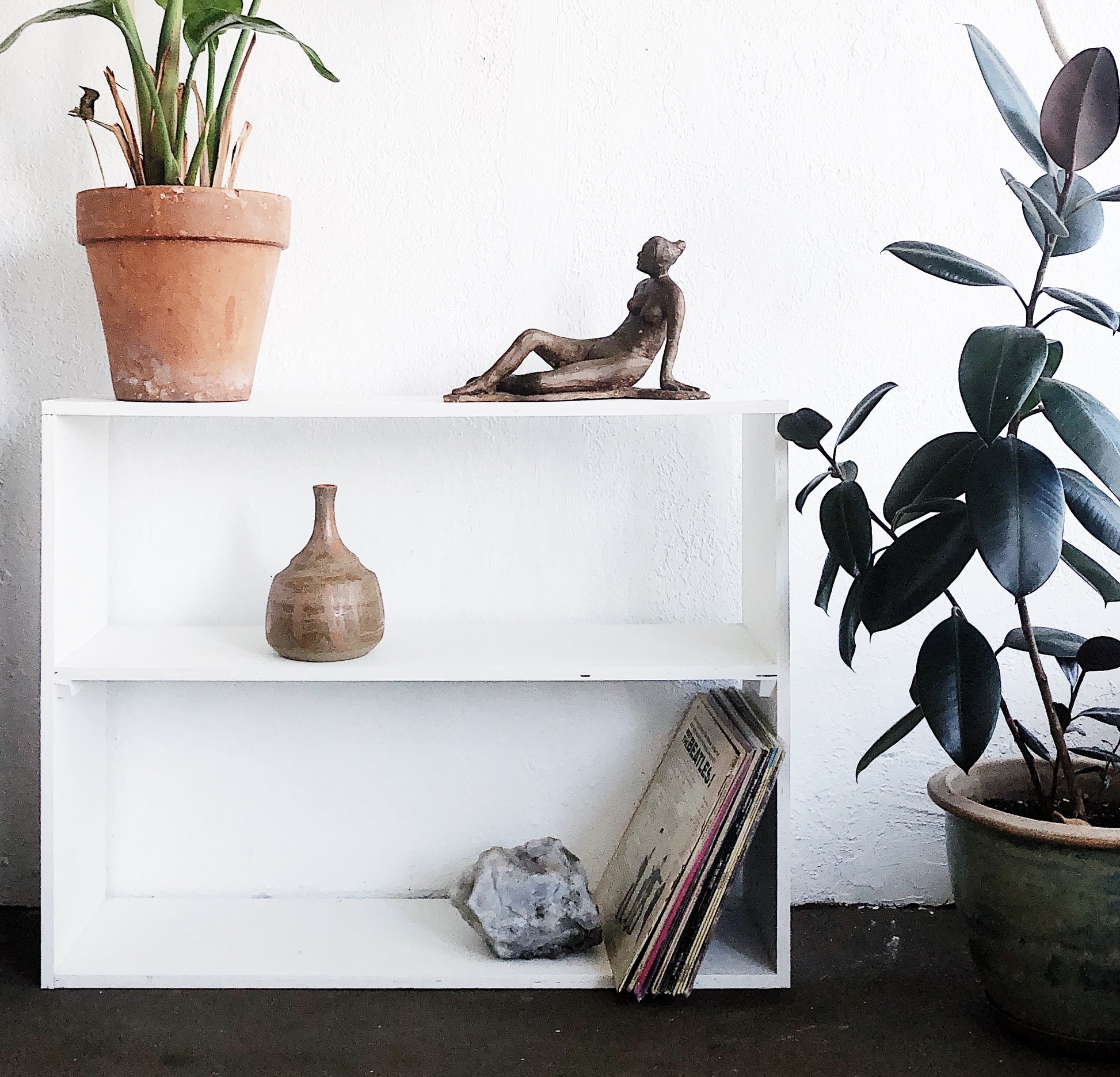 Very simple, and that’s the way we like it. This handmade shelf is very utilitarian while looking good as well. handmade of birch ply and painted white. Open back. Nicely sized and sturdy