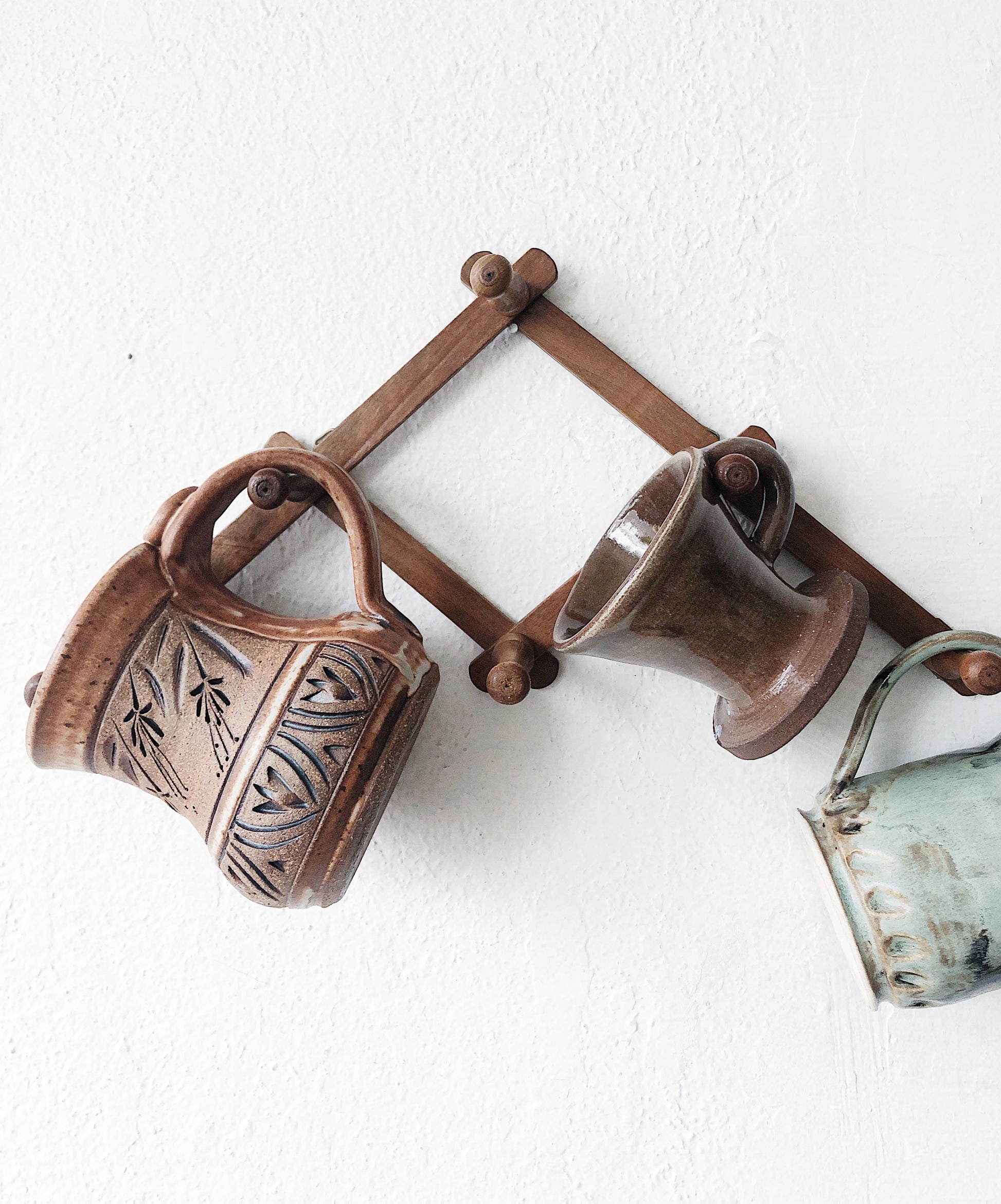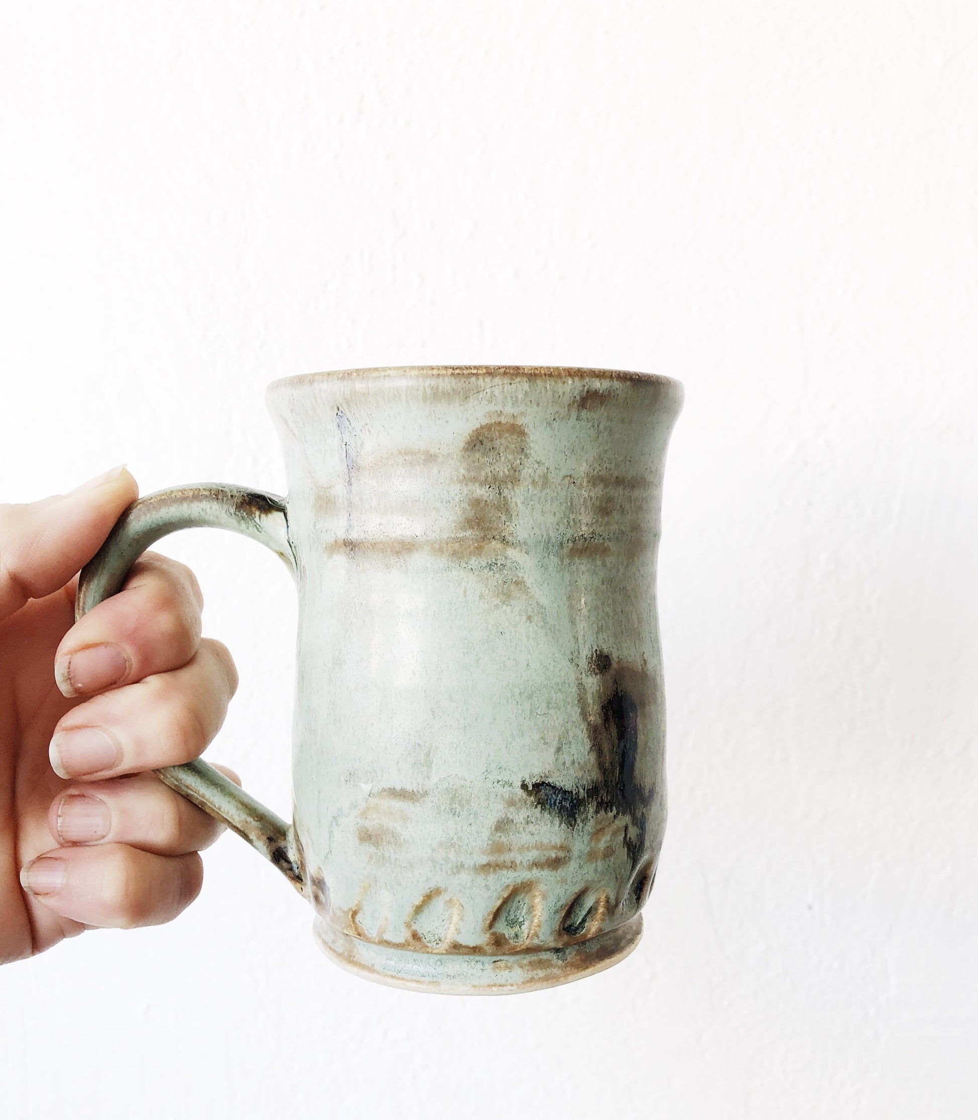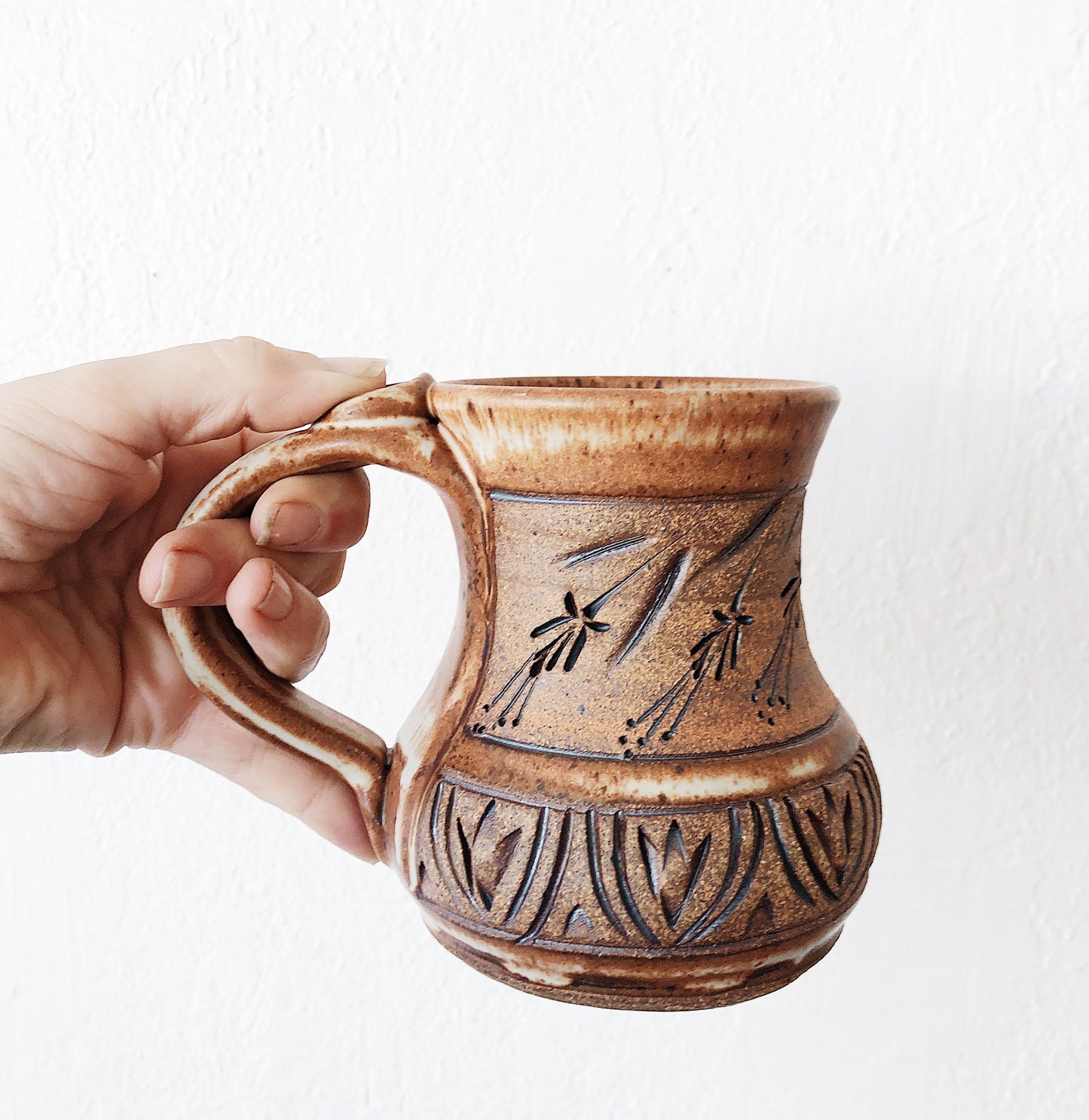 Vintage Stoneware mugs that would make a beautiful mid matched set. Oversized! Fantastic flat glazes, one with gorgeous incising