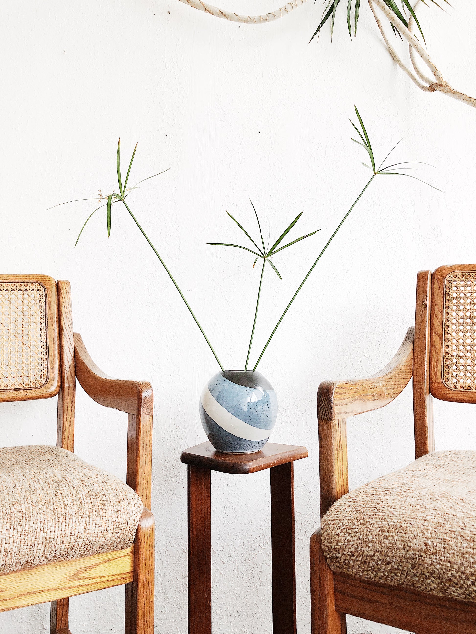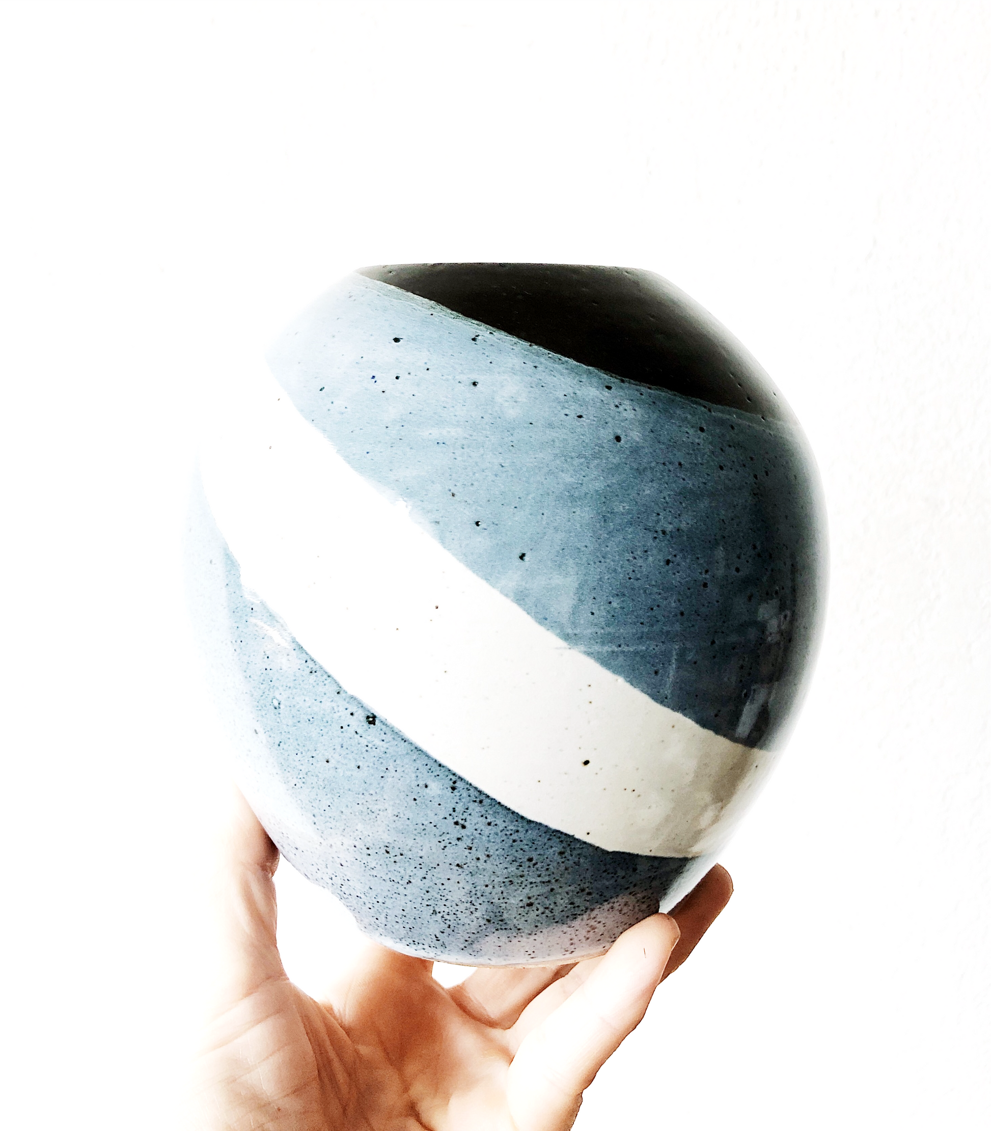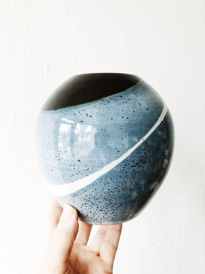 Fantastic swirl vase in great colors. As an aside... This reminds us of Georgia O’Keeffe paintings, especially blue cross and blue black and grey.