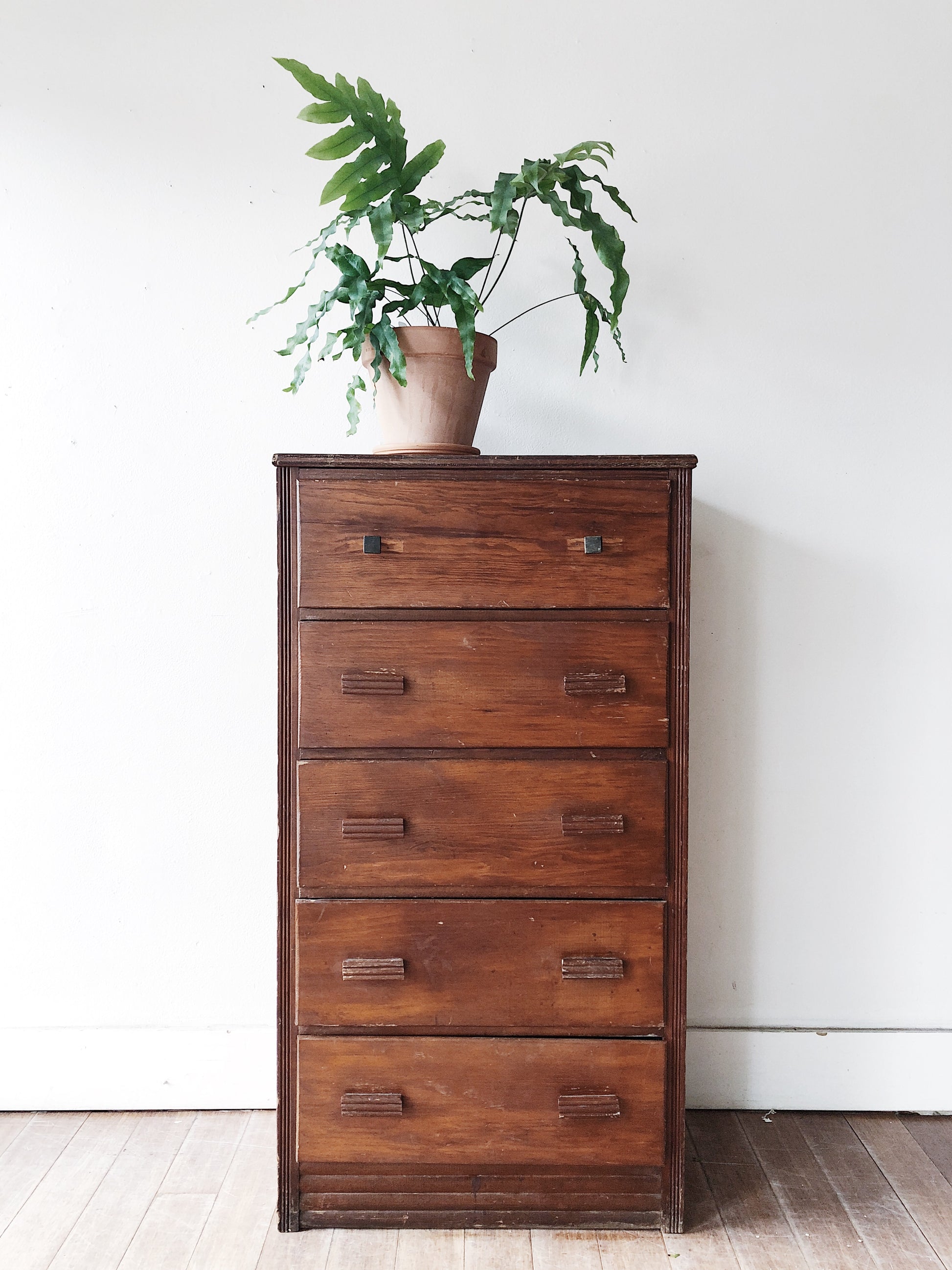 Lovely patina on this handmade dresser. Especially loving the pulls. Warm and clean lined at the same time. Drawers slide easily. A few insignificant flaws here and there that come with age.