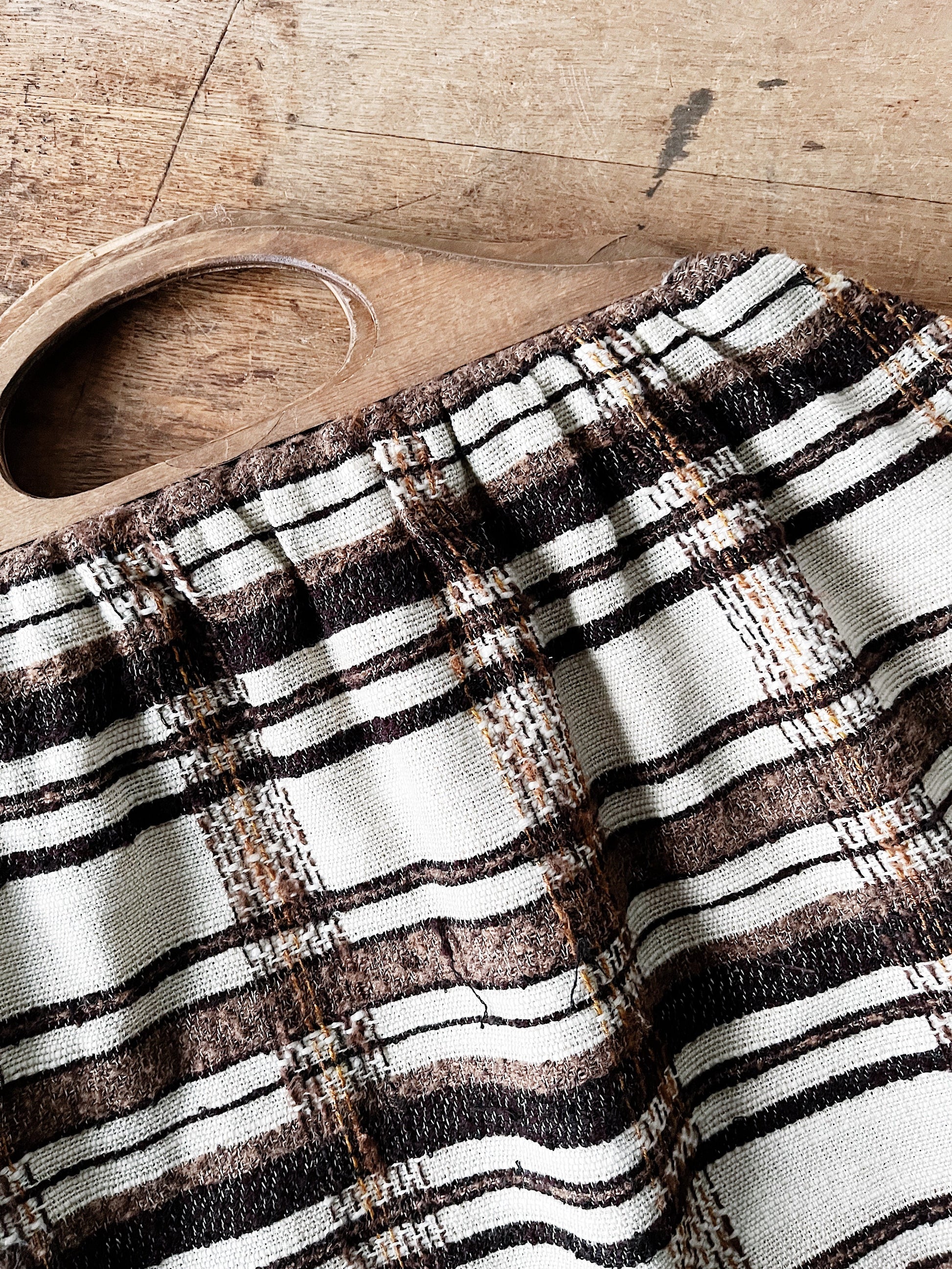 Lined with raw silk, plaid vintage woven fabric. Wood handles. Oversized to fit all your crafting supplies. Works as a daily handbag too