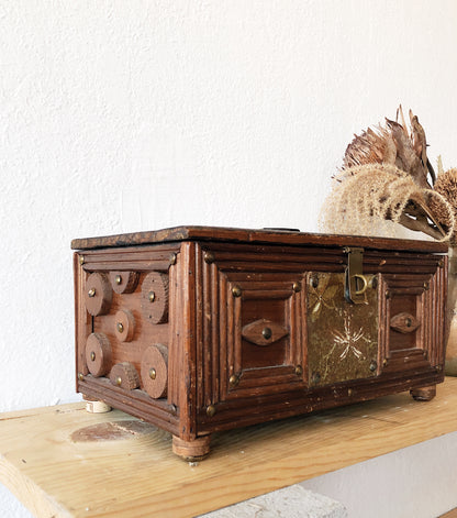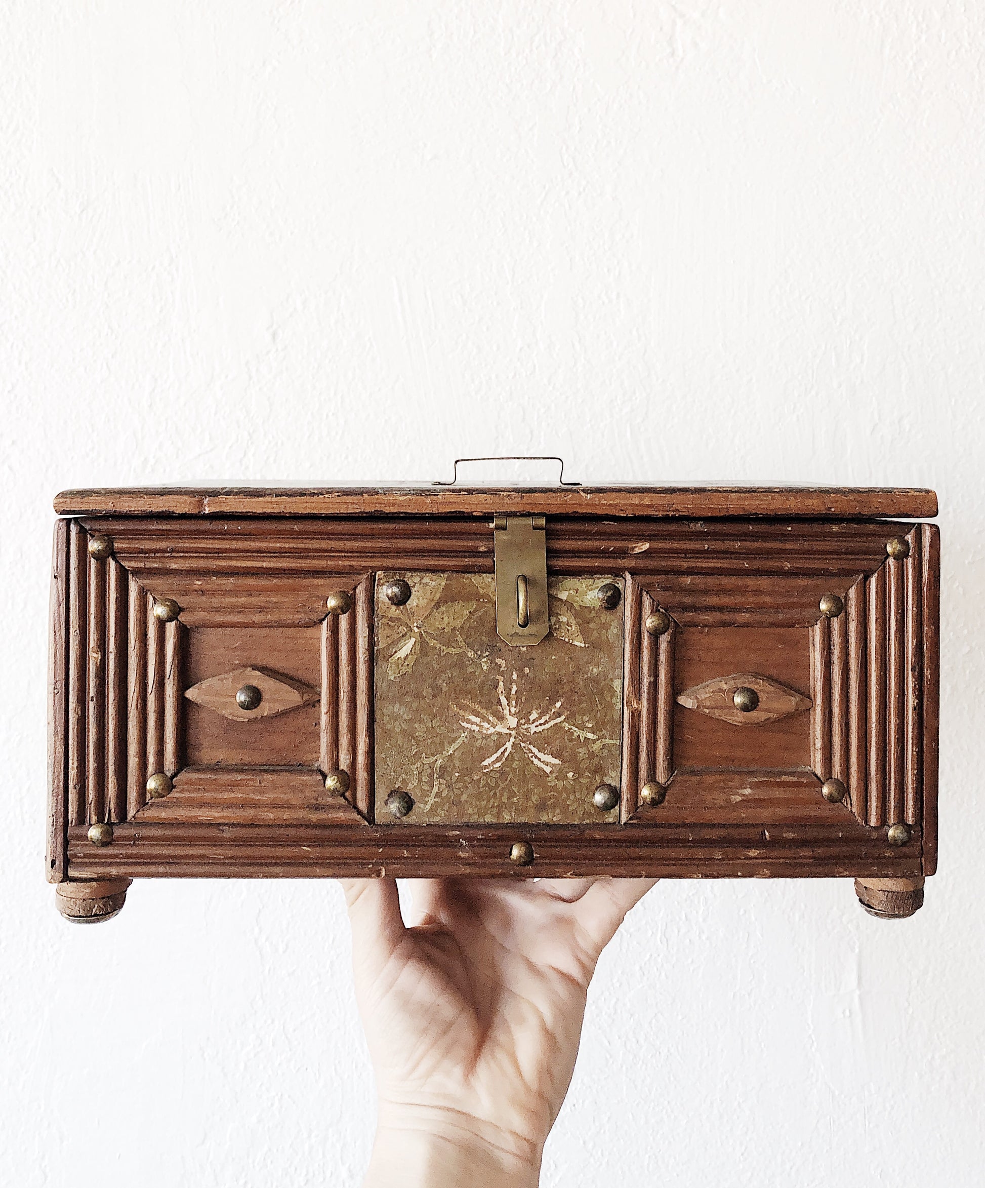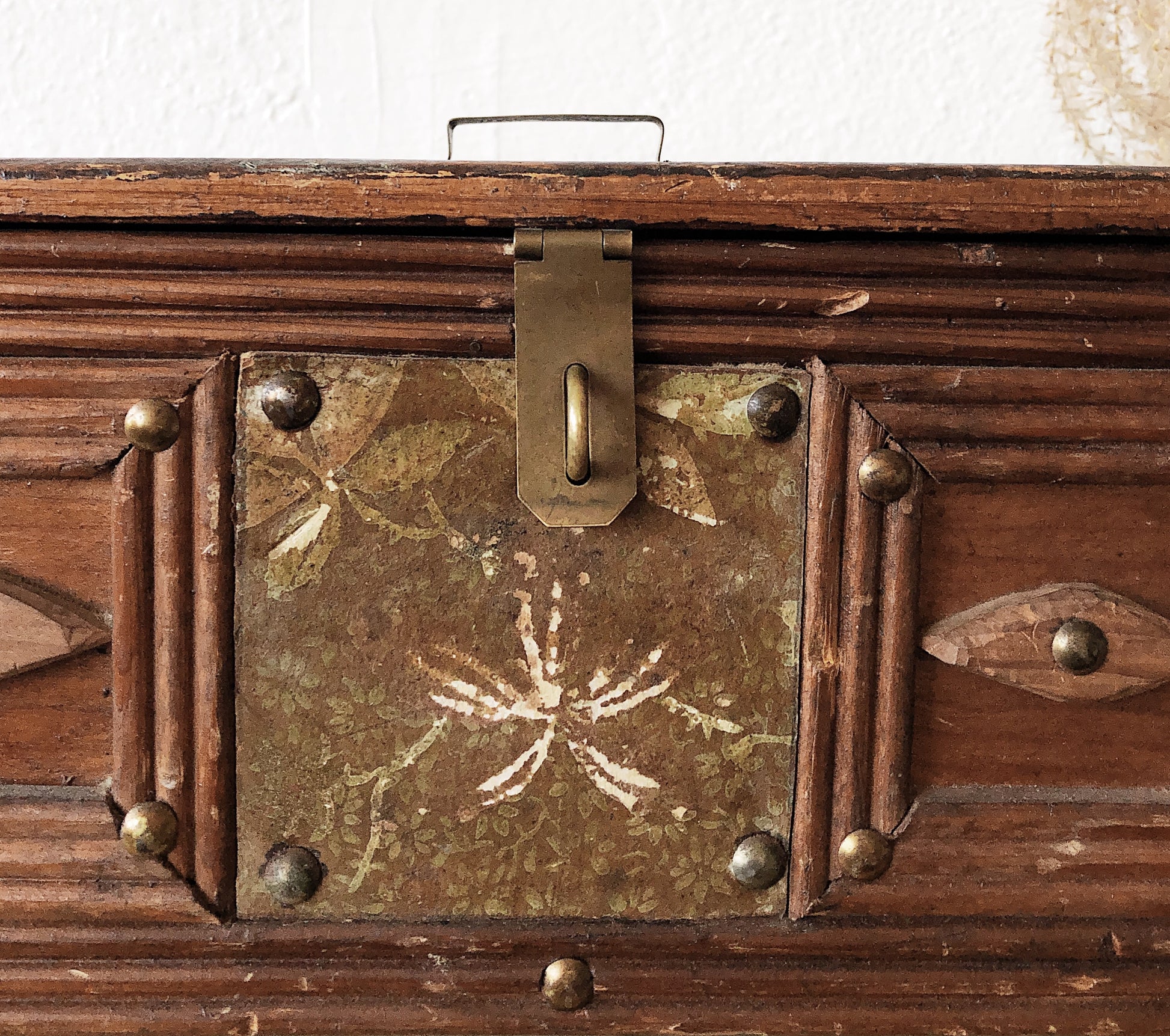 We love finding things with makers marks on them. This vintage tramp art box is a beauty. Look at that antique lino scrap in the center! Antique brass and copper hardware. Primitive folk look. For all your love notes and such