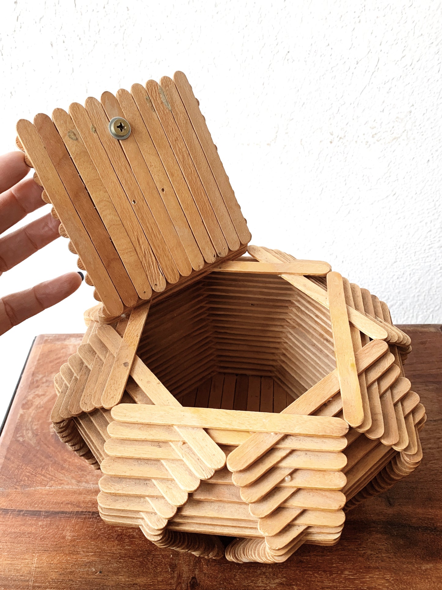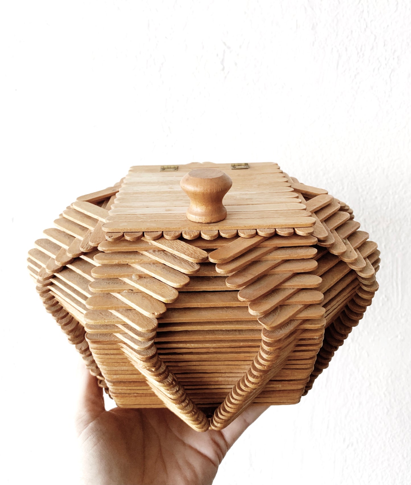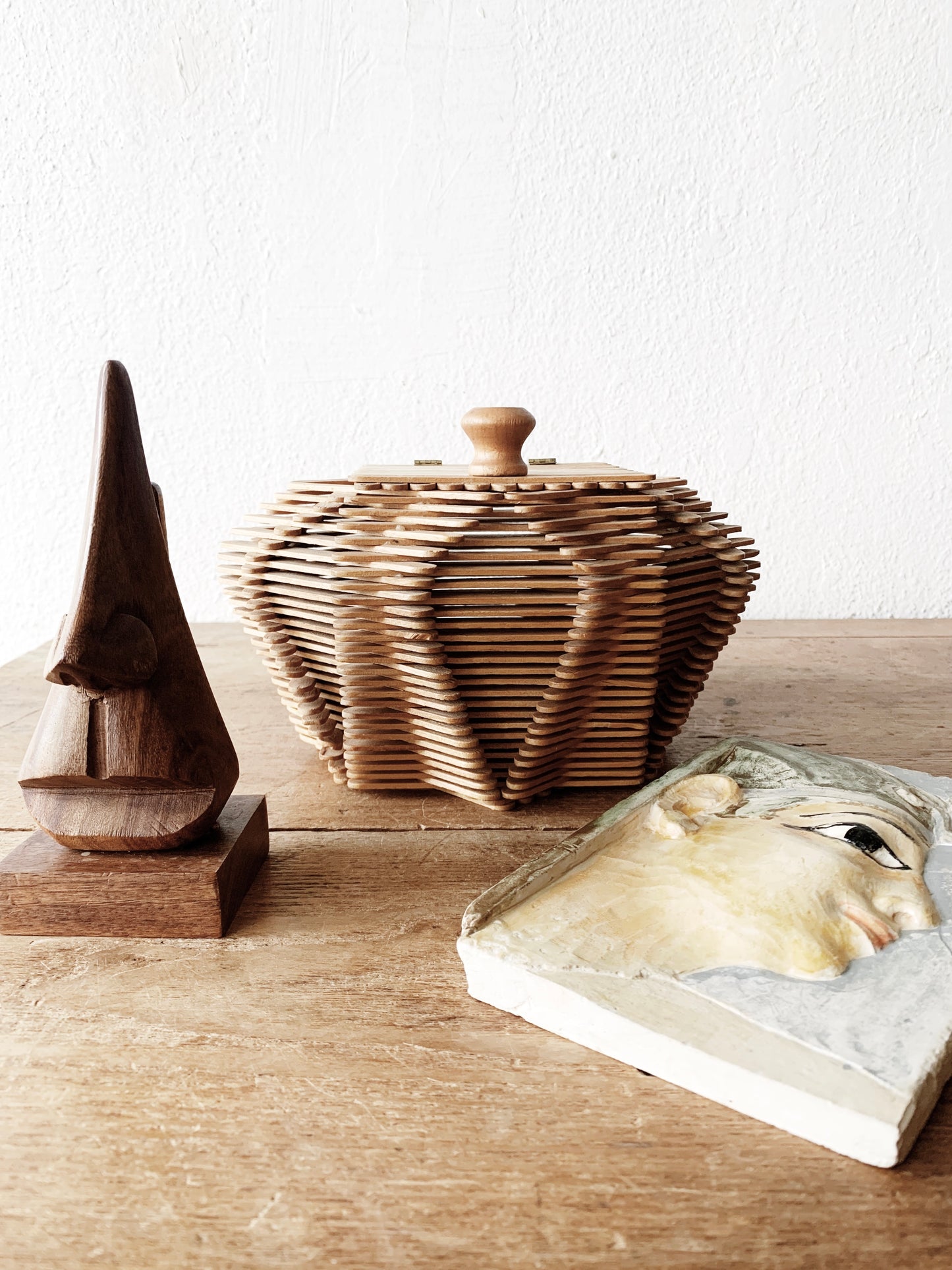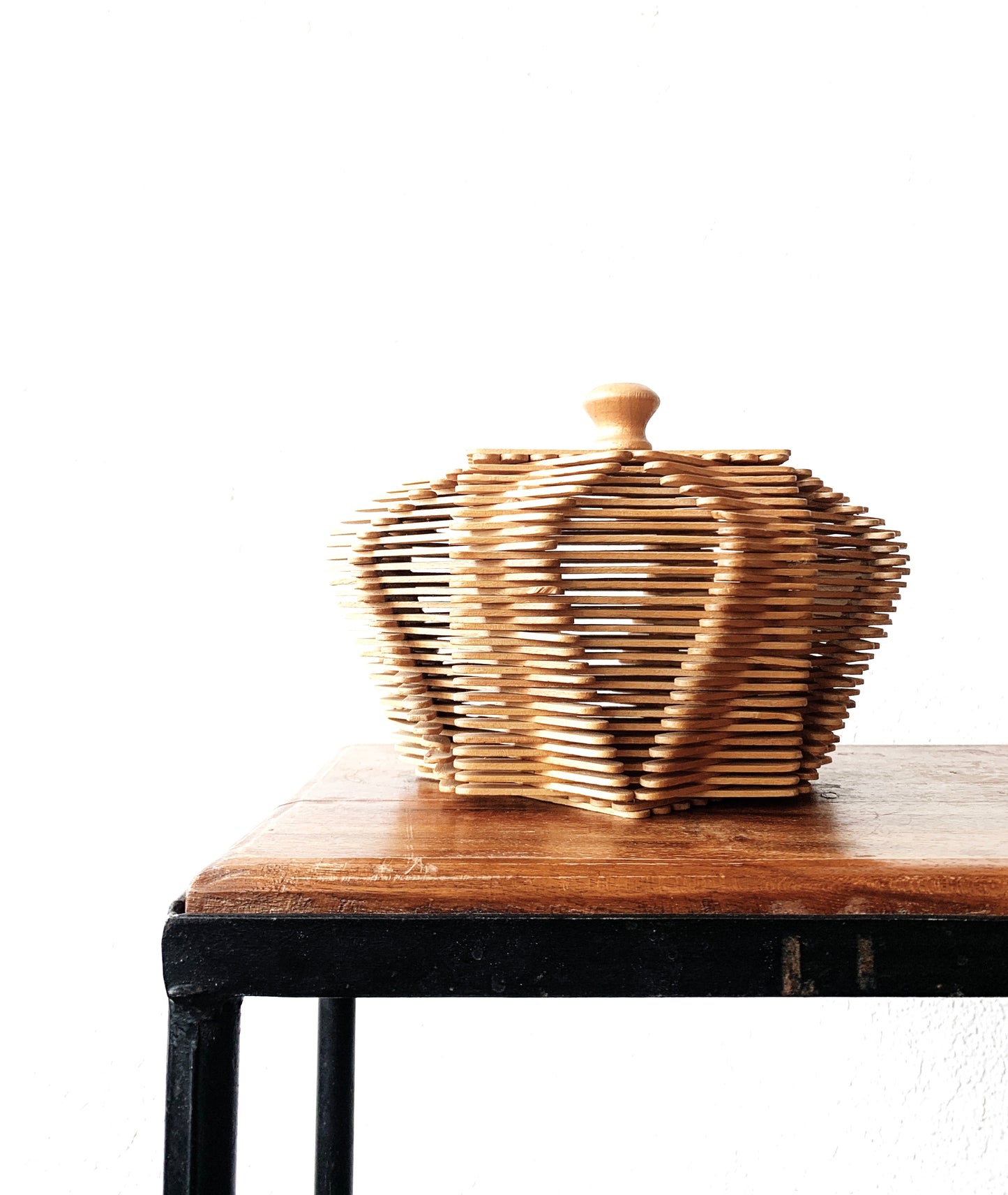Vintage tramp art style lidded vessel. Sturdy, great looking, and useful. Little brass hinges a d wks knob on the lid. Fun piece