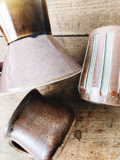 Extra wide base on this vintage pottery travel mug. The colors are so yummy. Feels good in the hand with that trigger finger handle. Other mugs shown are listed separately