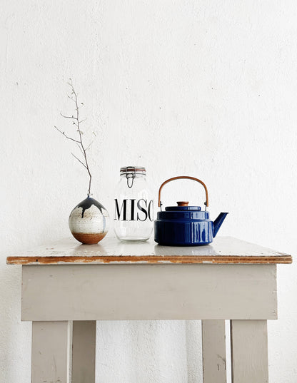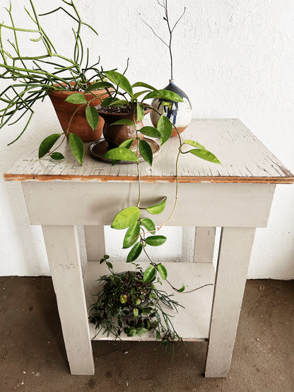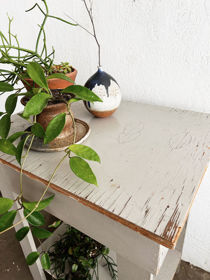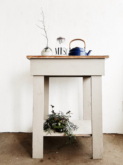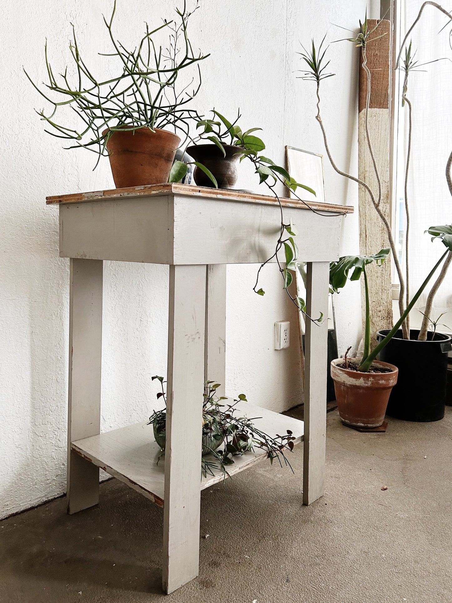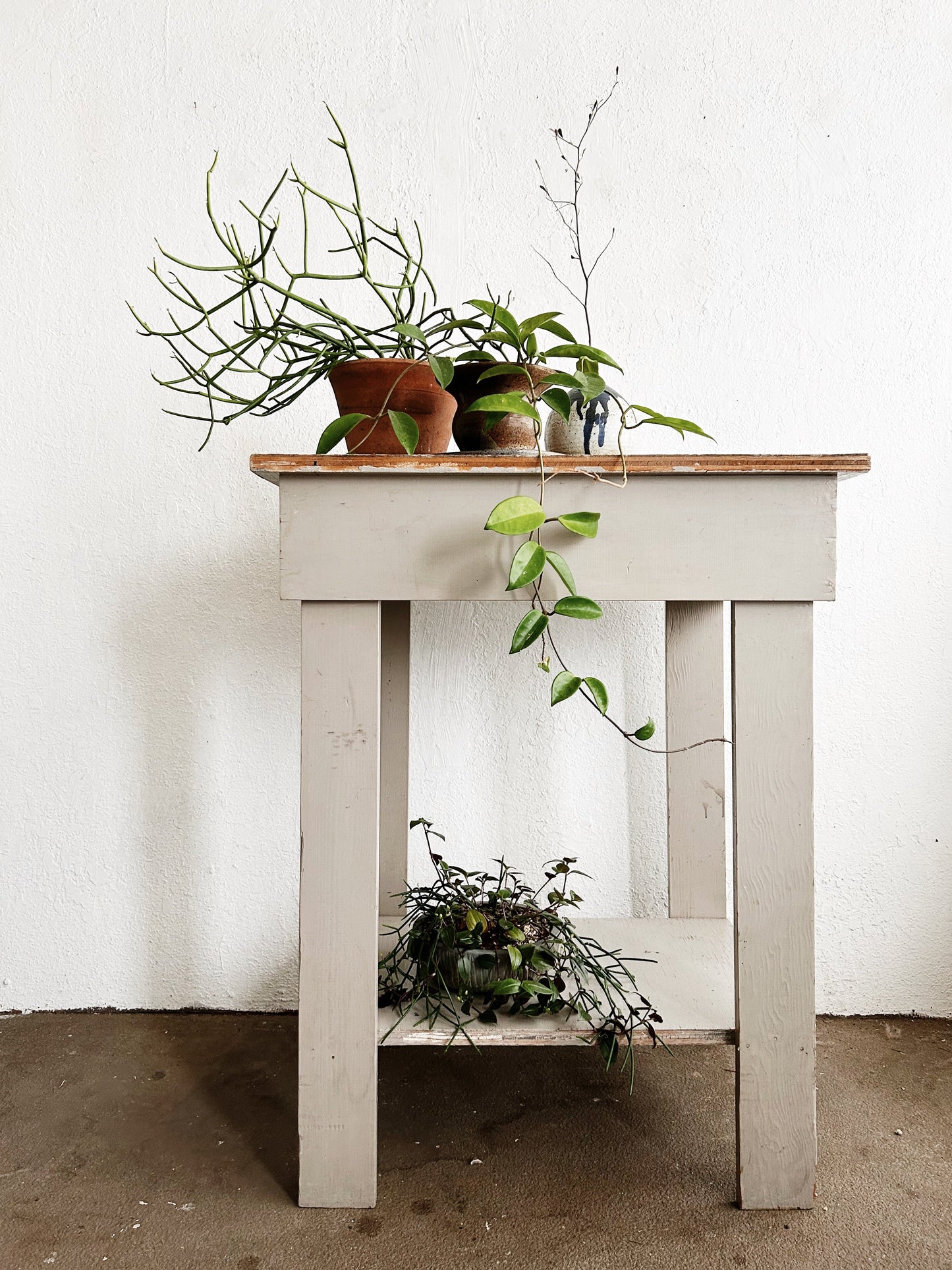 Rustic and sturdy, tall handmade wood table painted chalky grey. Love this in the kitchen or as a potting table. Great work table height!