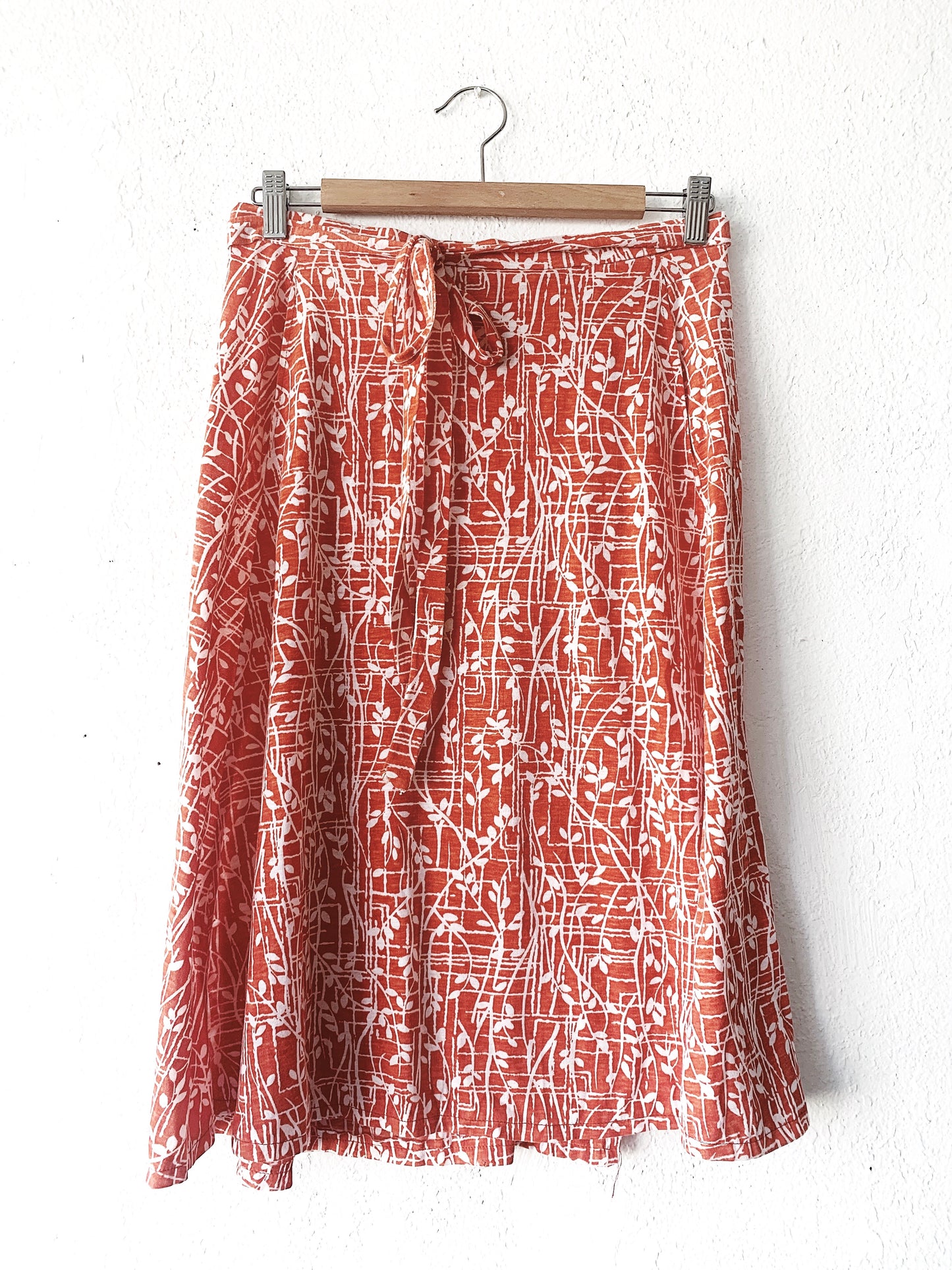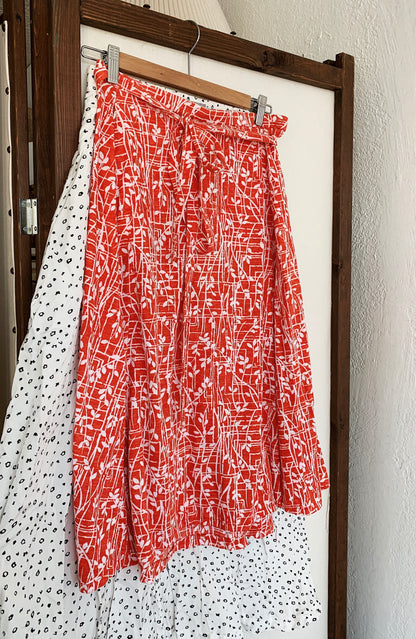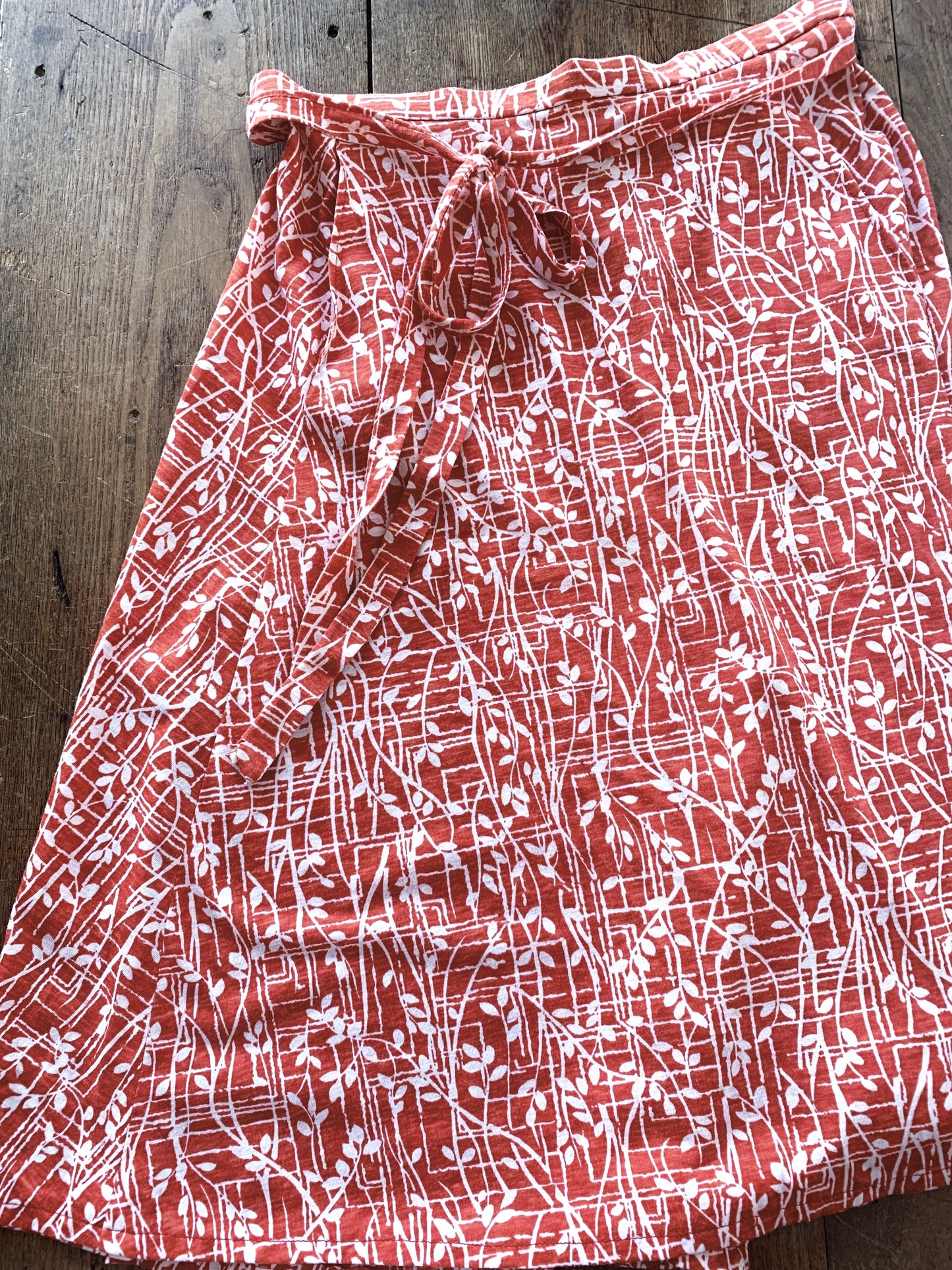 Pretty jersey knit handmade vintage wrap skirt with pockets. Cherry red with white floral pattern. Soft and easy to wear.