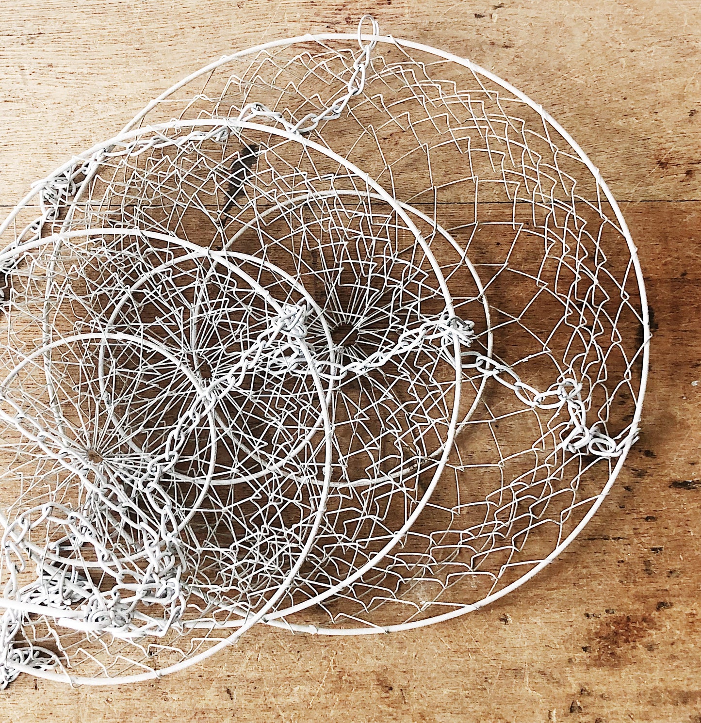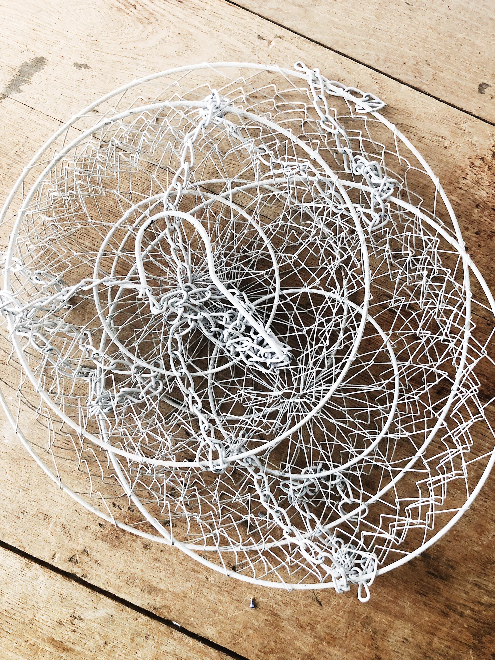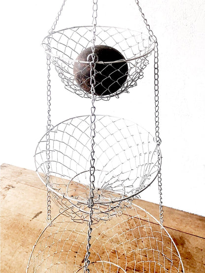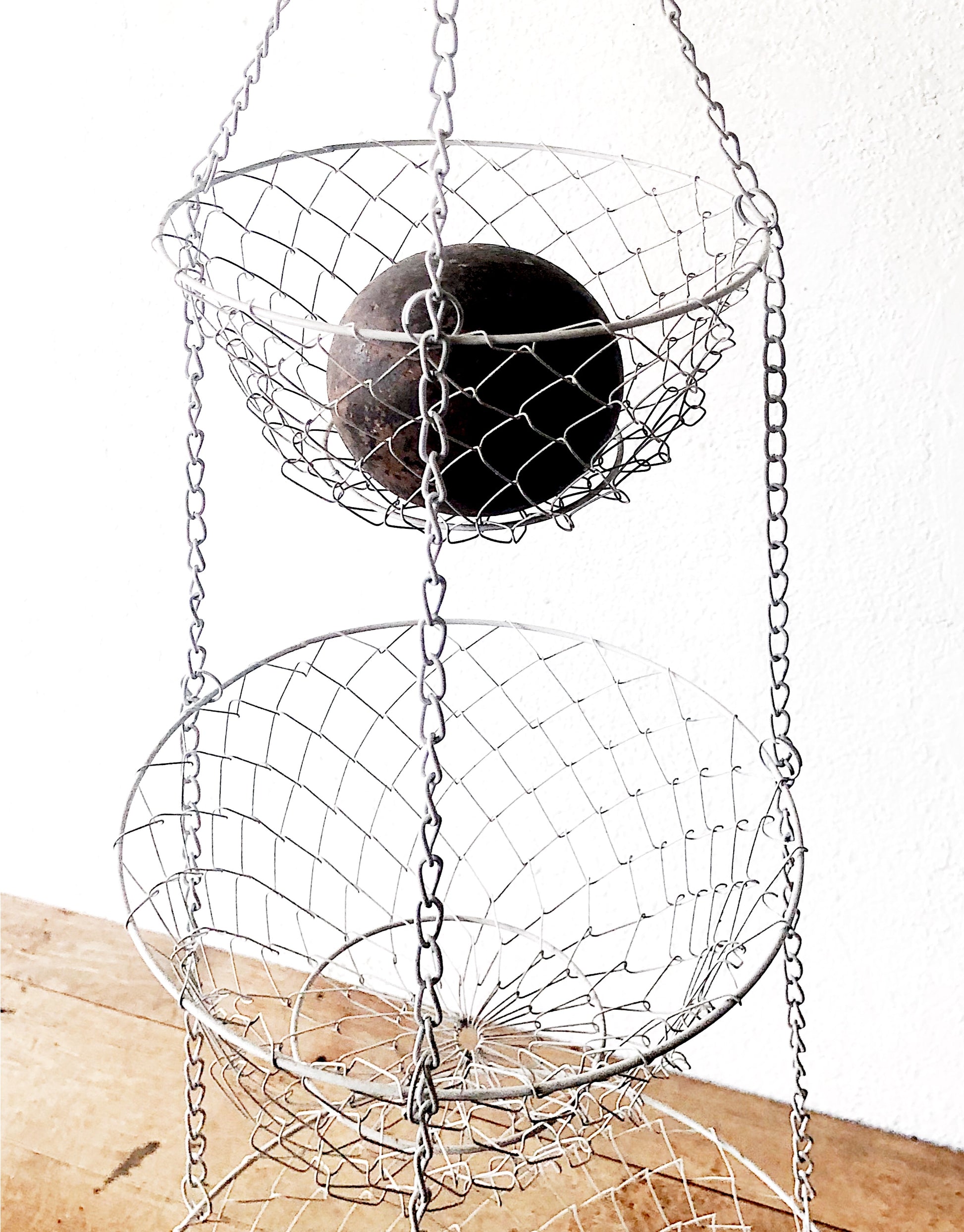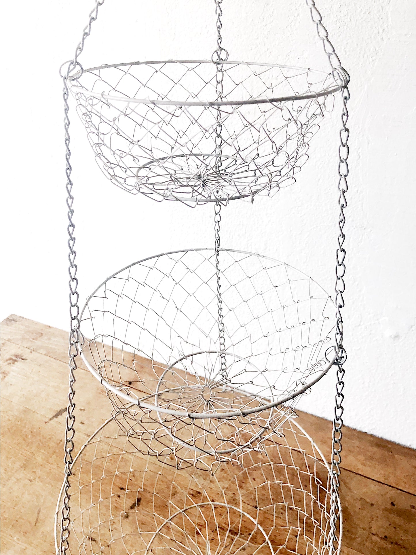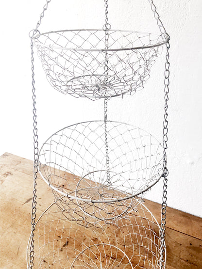 Classic vintage hanging fruit basket in white. These are useful in other rooms too, like the bathroom!