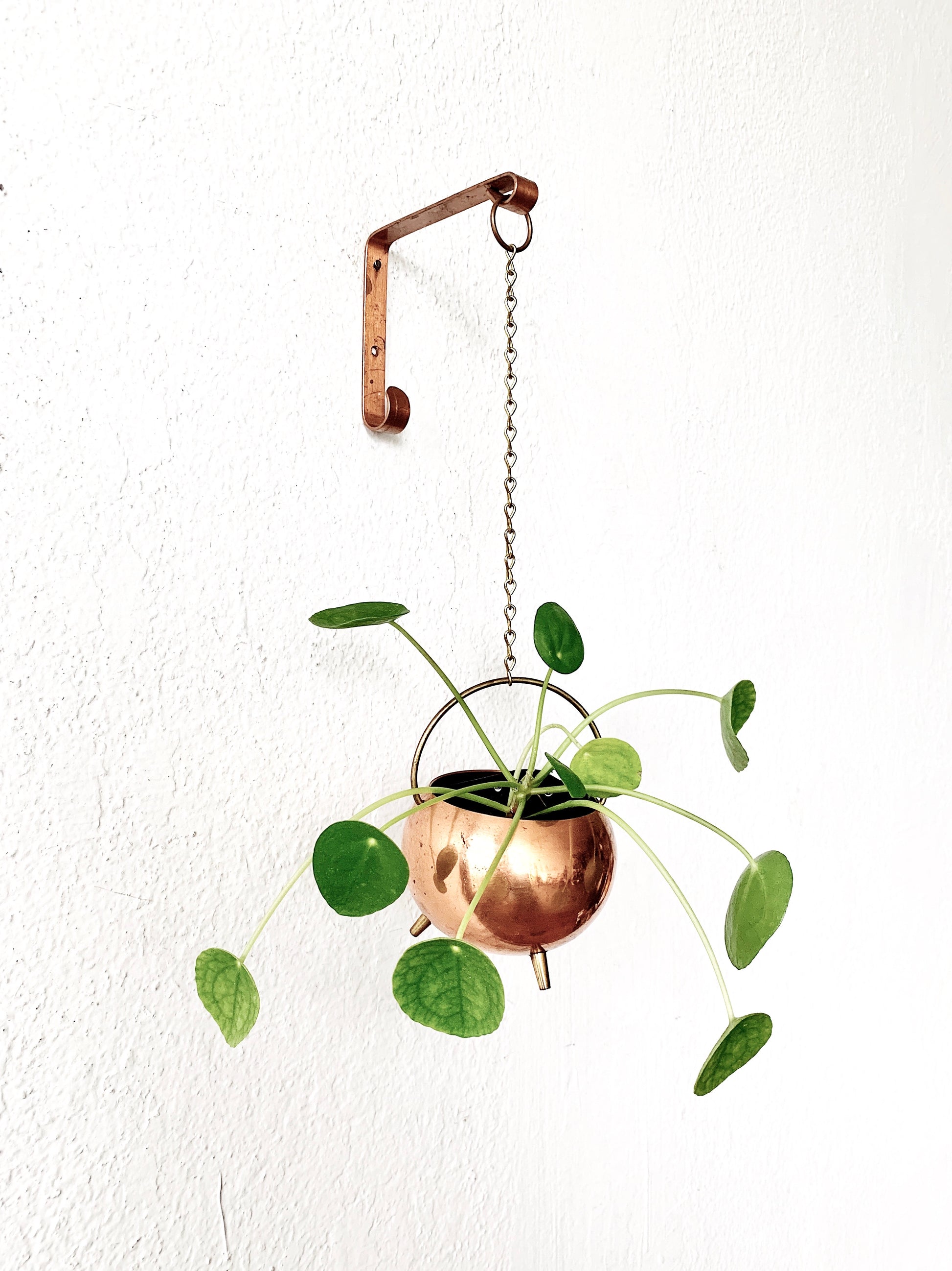 Vintage hanging copper and brass pot with chair and wall bracket.