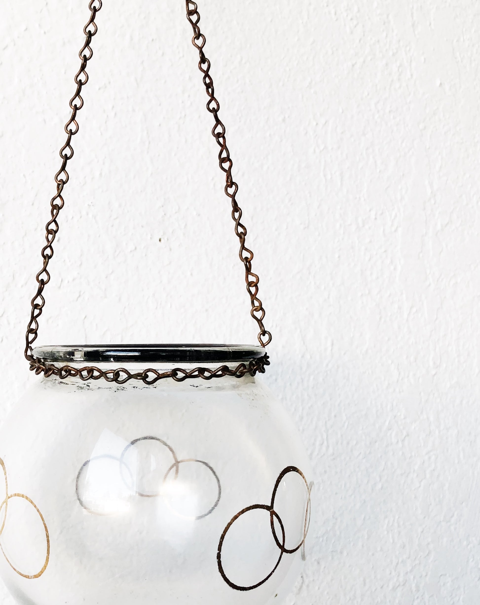 Glass globe with gold leaf circles. Hangs from a delicate aged chain. Plant this out or add a tea light