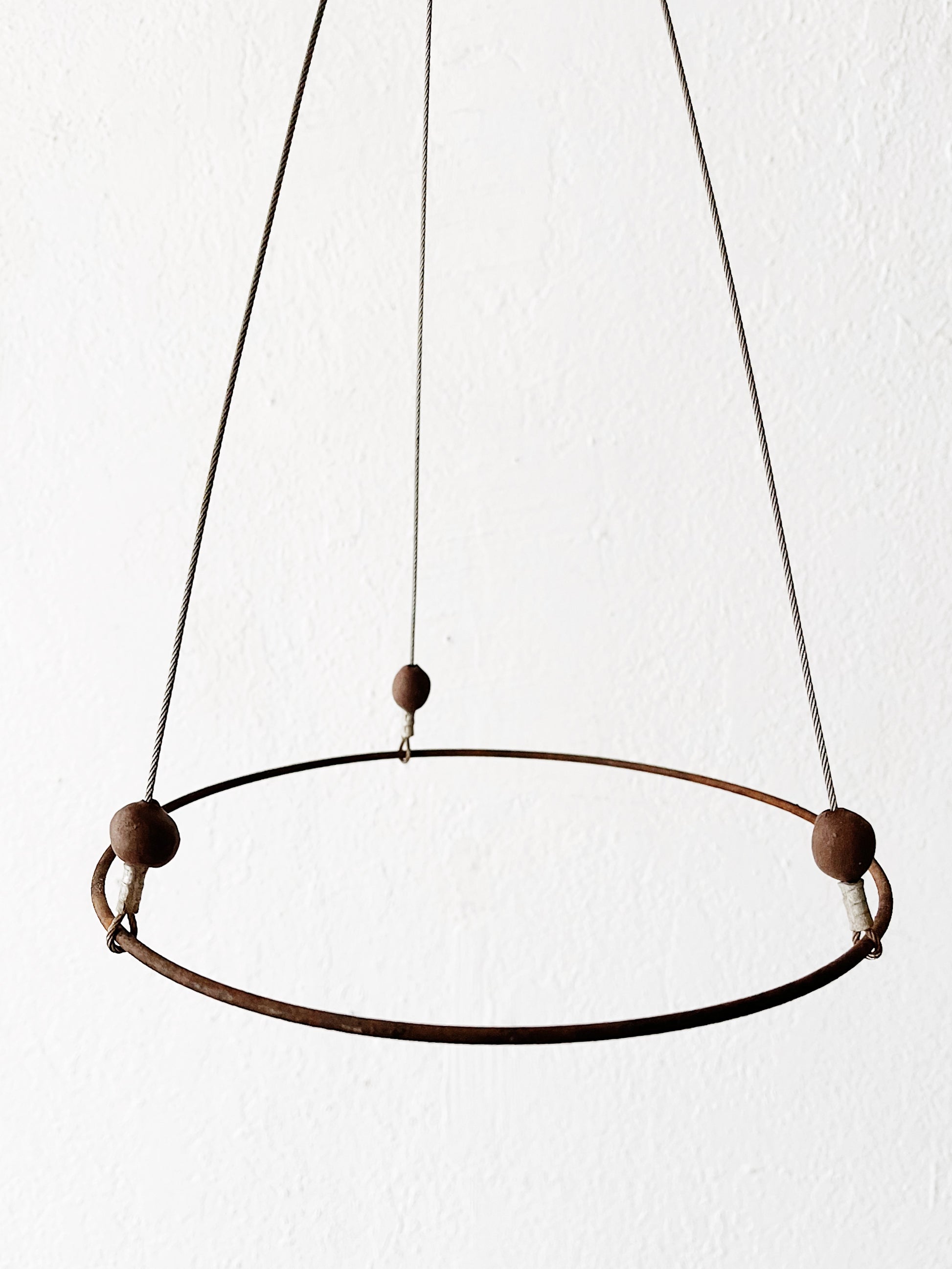Nice combination of natural basket with the wire and wood hanger. All look to be handmade. In lovely condition