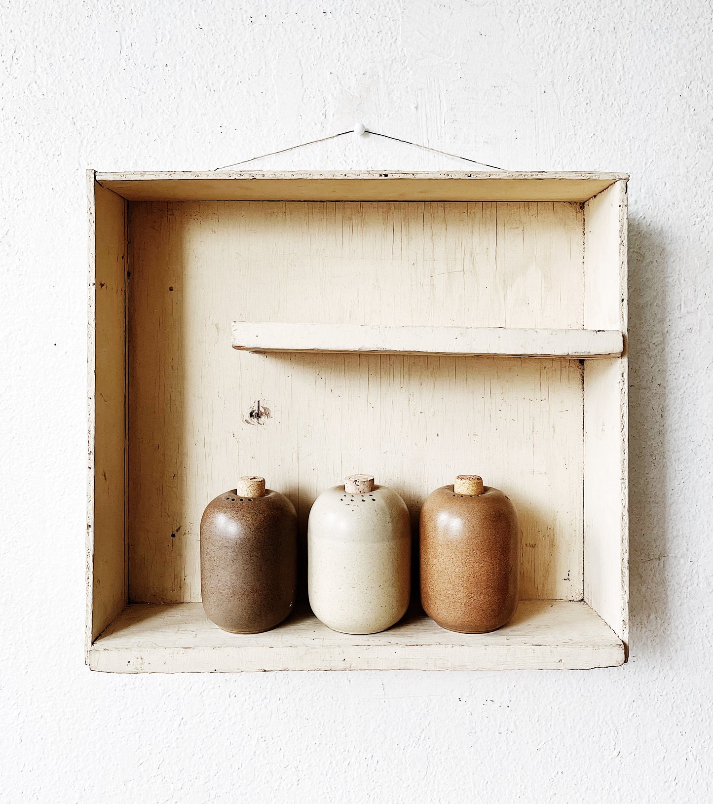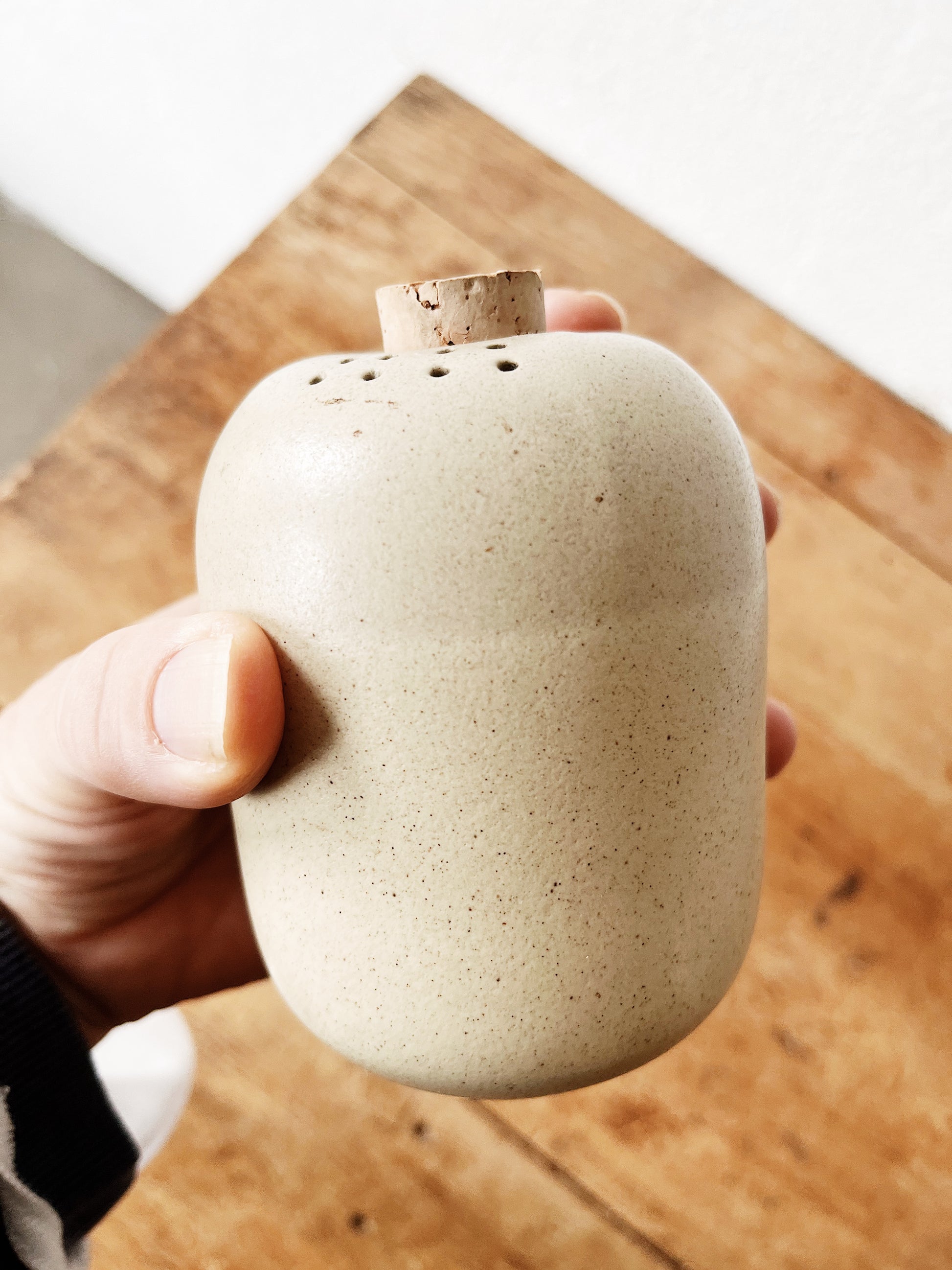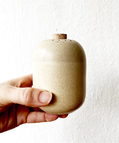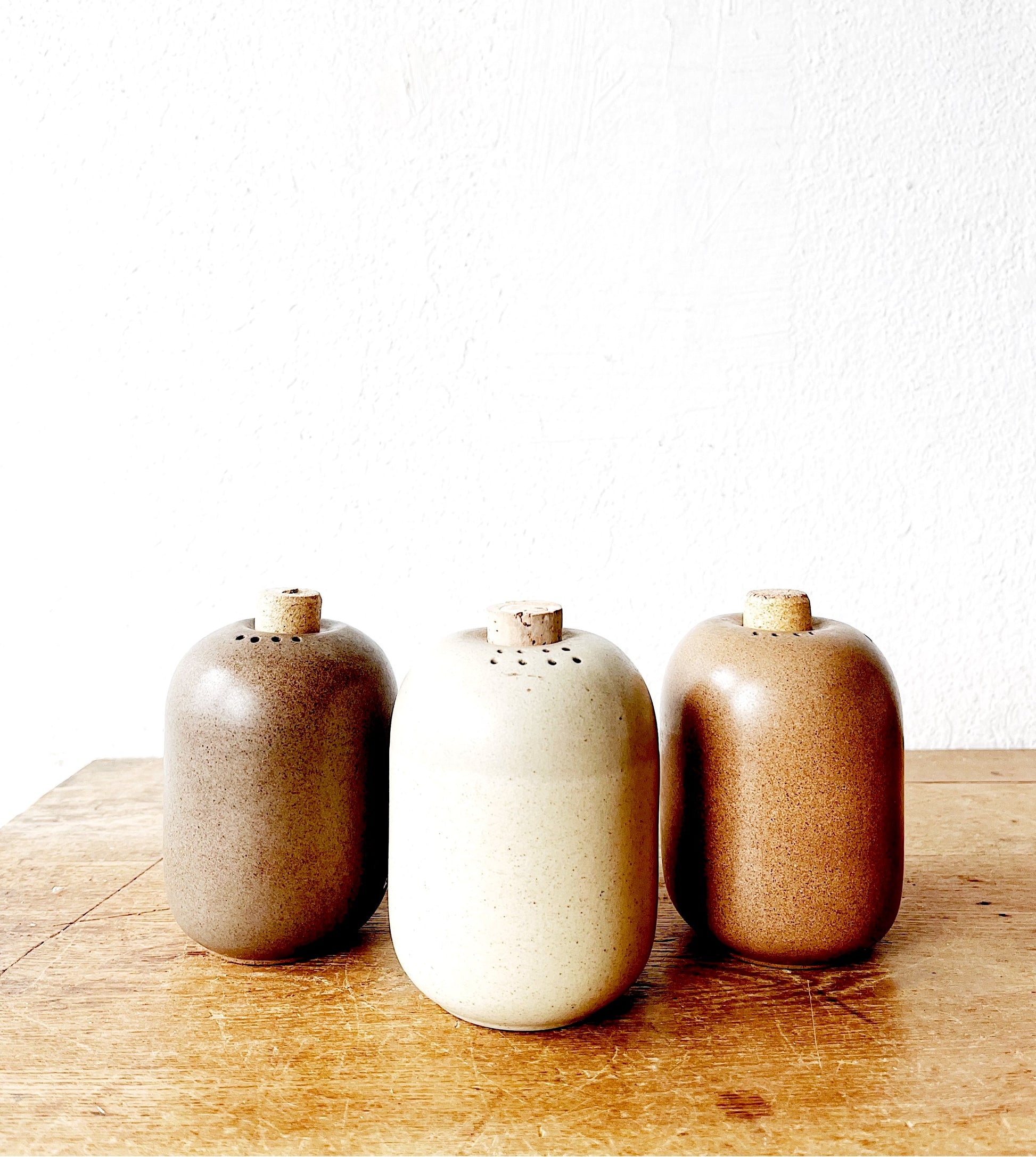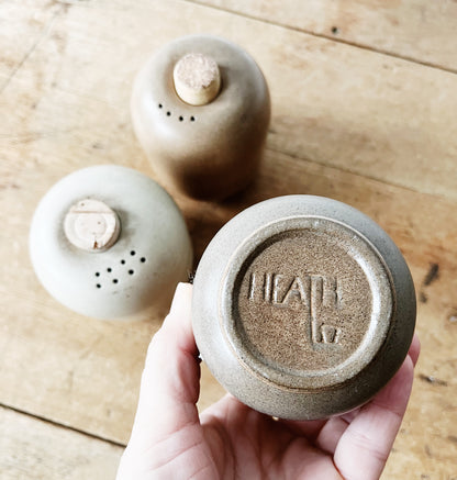Older style of salt and pepper shaker from heath ceramics. Hard to find the vintage style of these. We have three with their corks.
