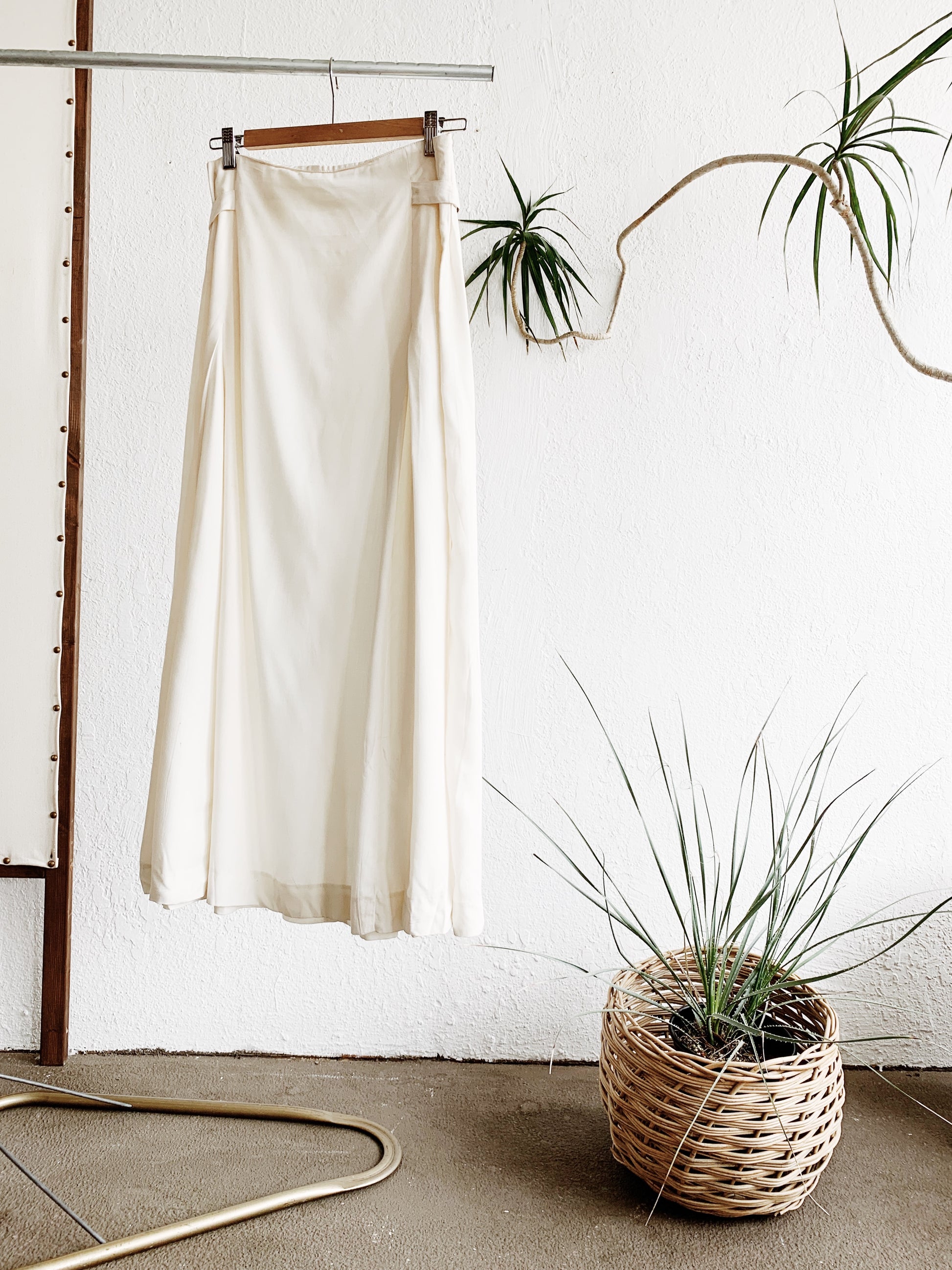 Pretty off white rayon skirt by Outback Red, 90’s. High waisted, back zip and brass side buckles for cinching. Tagged a Size 10.