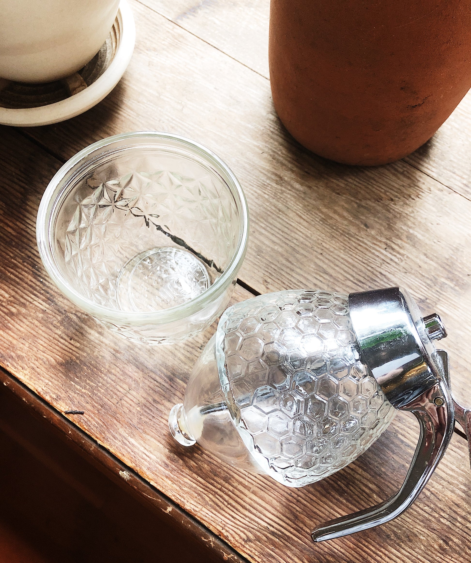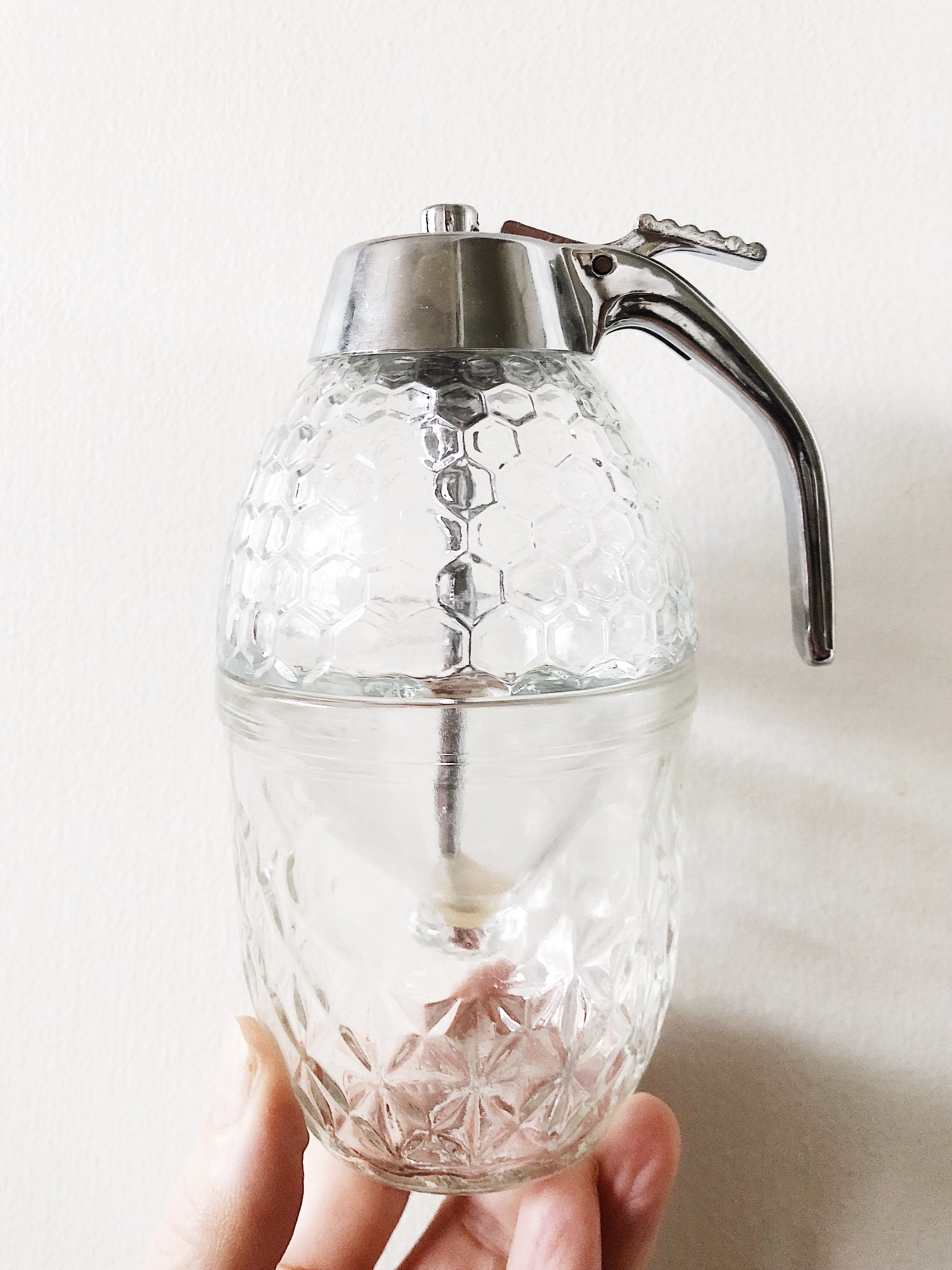 One of our favorite vintage kitchen gadgets. This glass honey or syrup dispenser has an ingenious design. Fill the lower half with warm water and nestle the liquid filled top part inside.