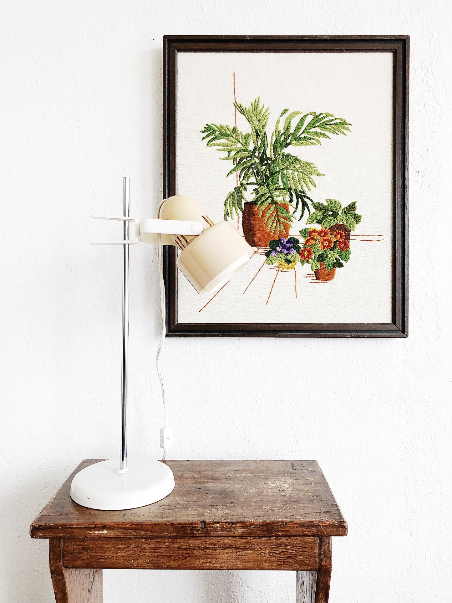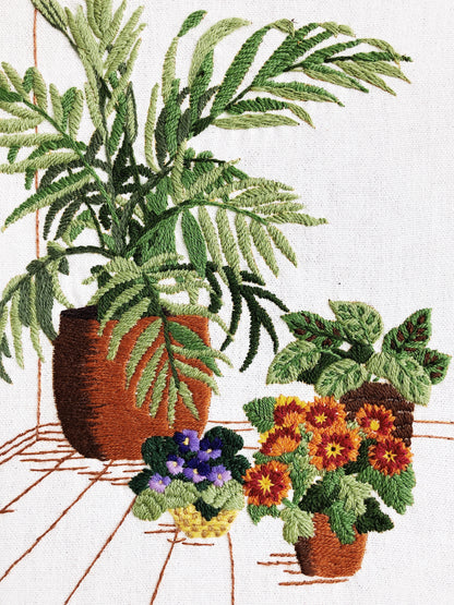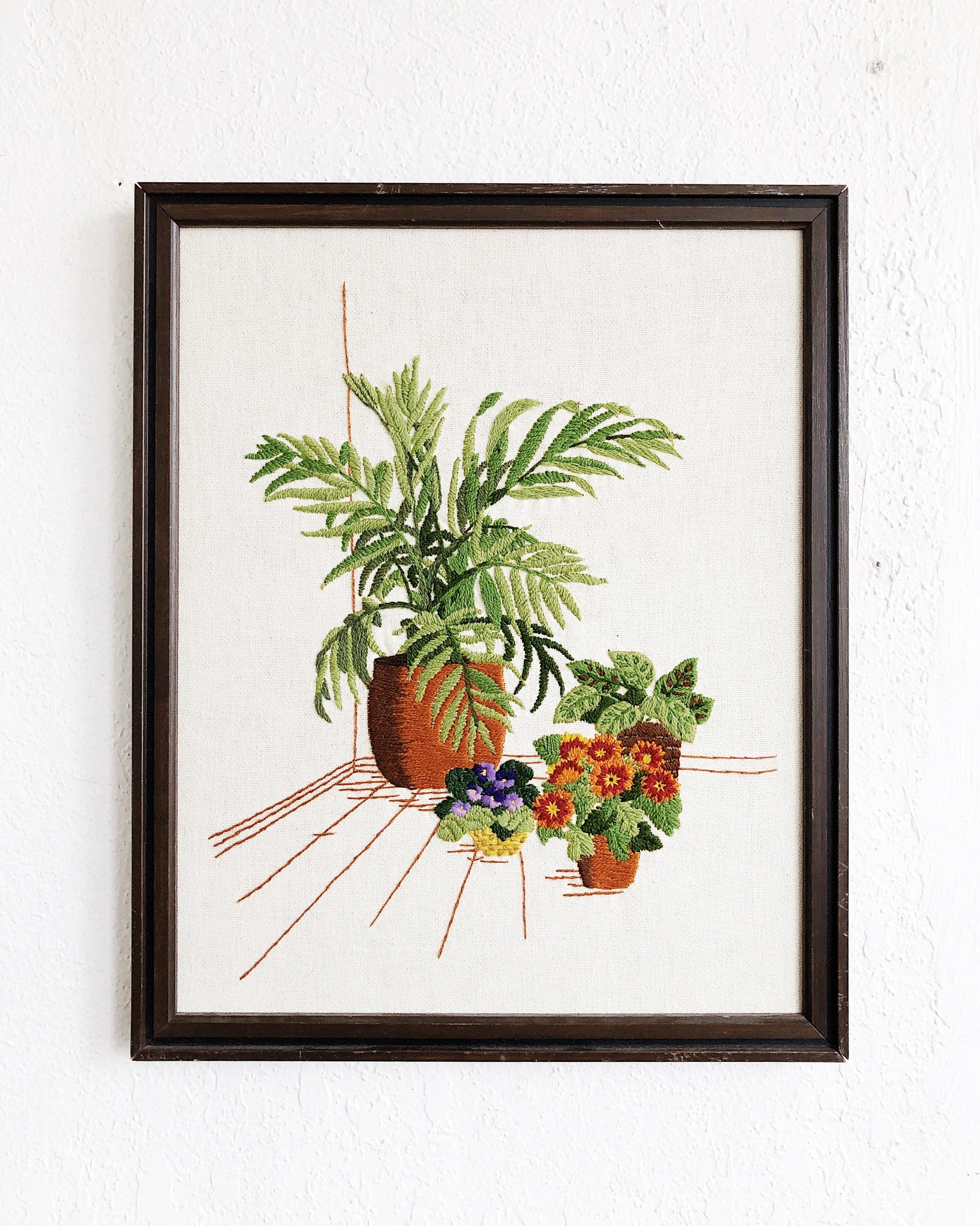 We love finding these! Fab 1970s embroidery of a gathering of houseplants. Charming colors and design. On linen. Framed without glass