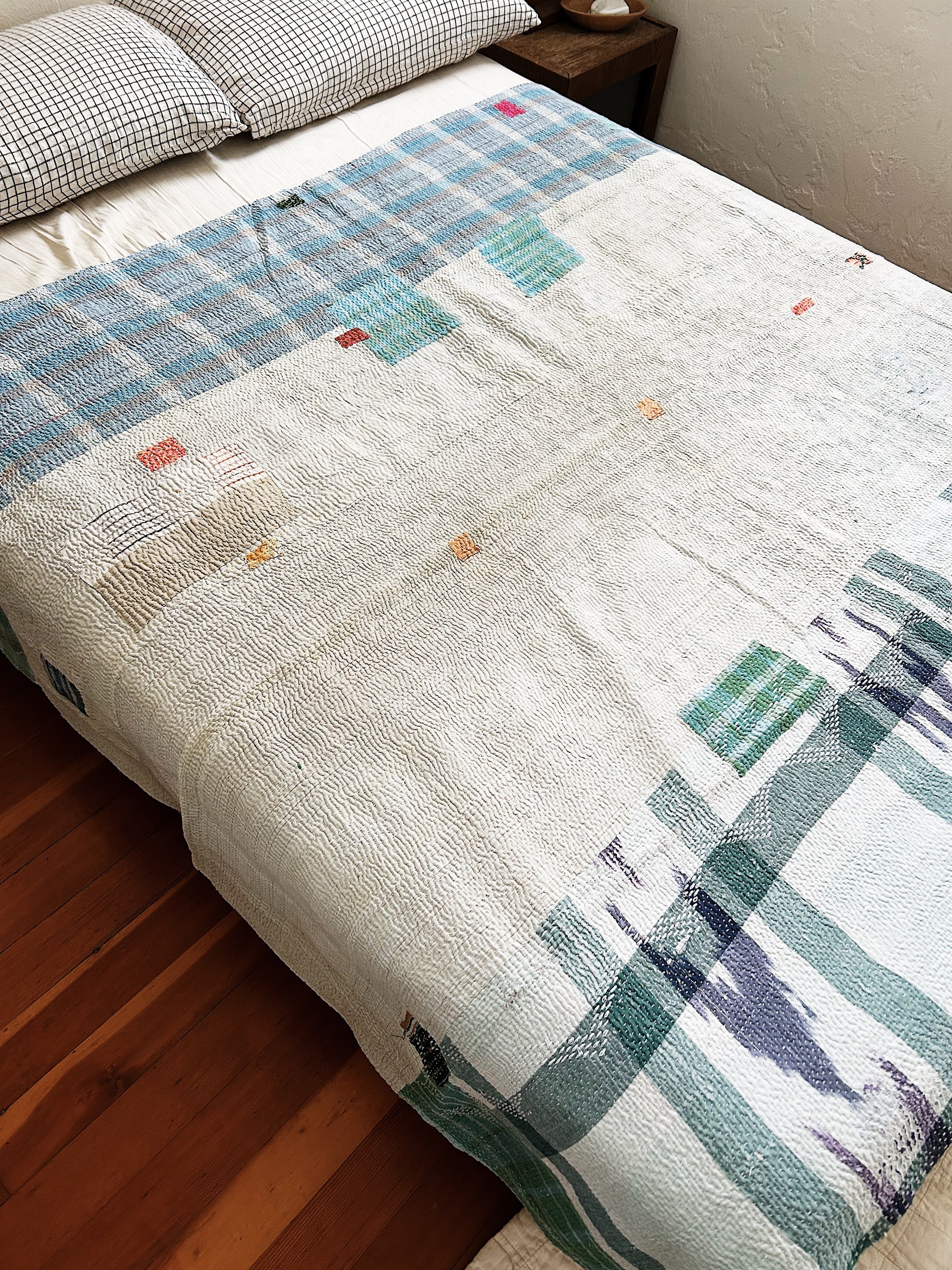 Beautiful reversible kantha made up of a patchwork many different old quilts. The finest stitches. Midweight and super super soft. Lovely drape. Some very minor flaws but appropriate for the age. Nicely sized twin, shown on a full bed