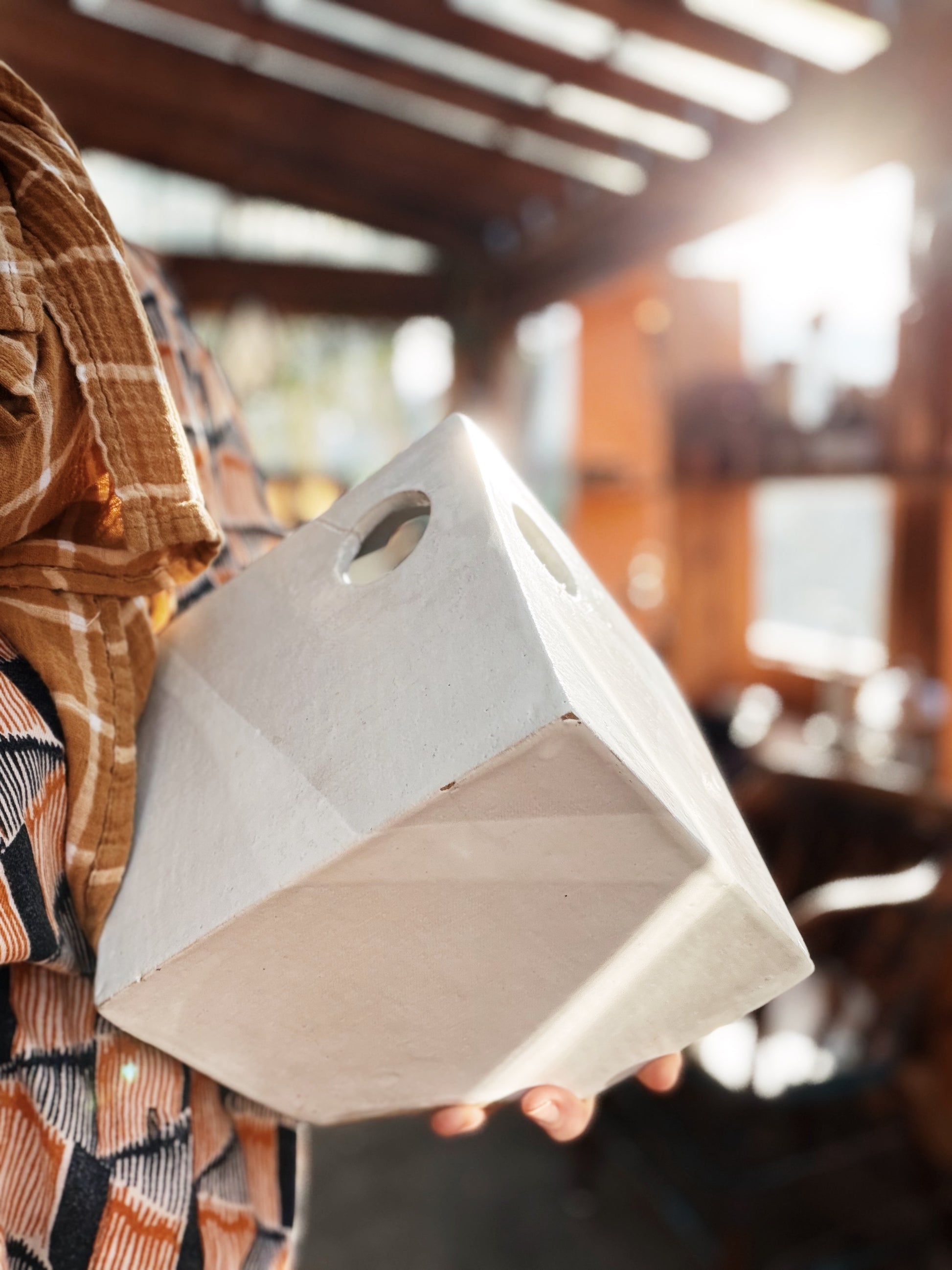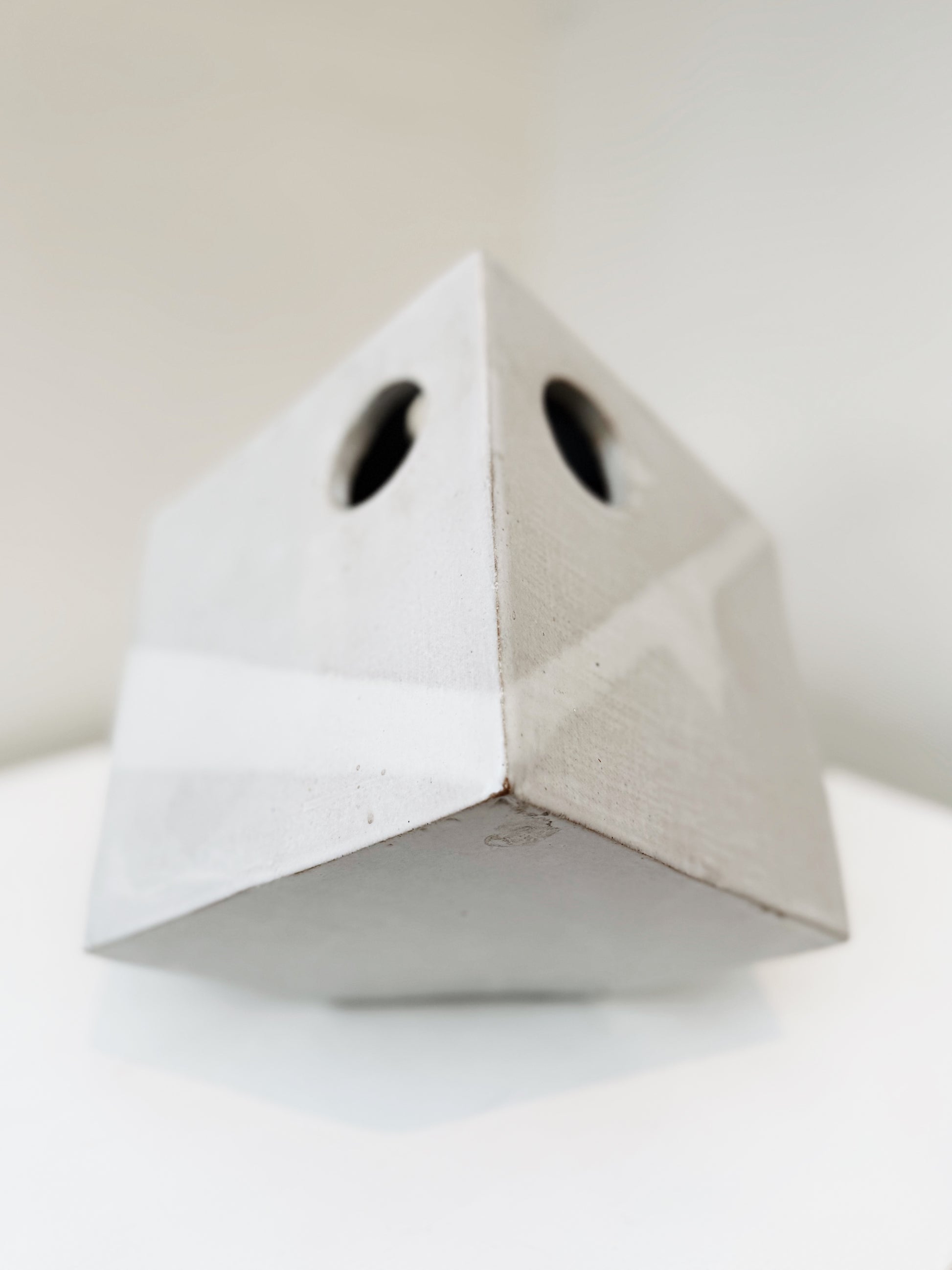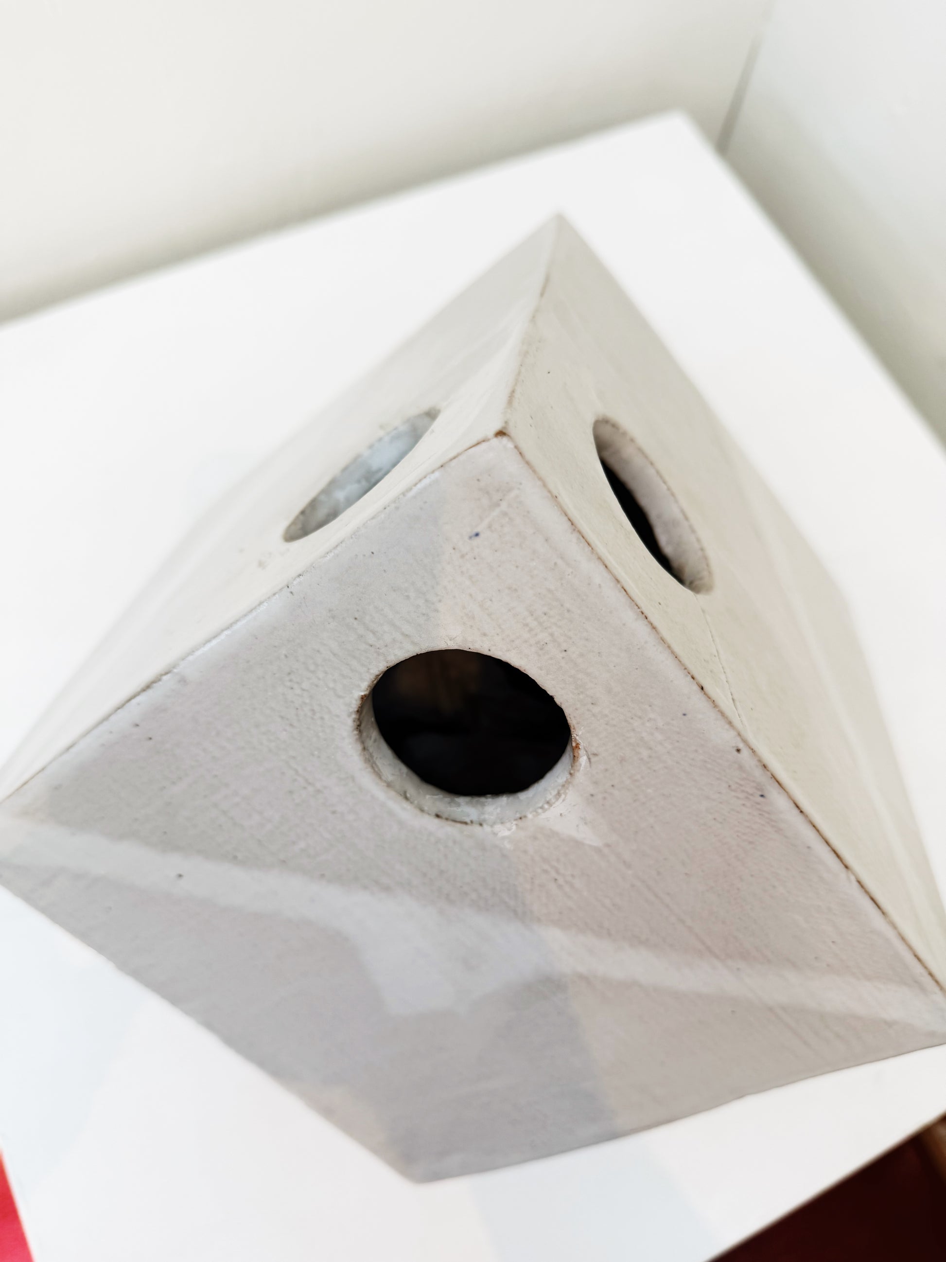 Oversized ceramic ikebana style vase or planter. Lovely tonal white glaze. Three large holes for arranging. Sits askew to inform its trapezoidal shape. A special one