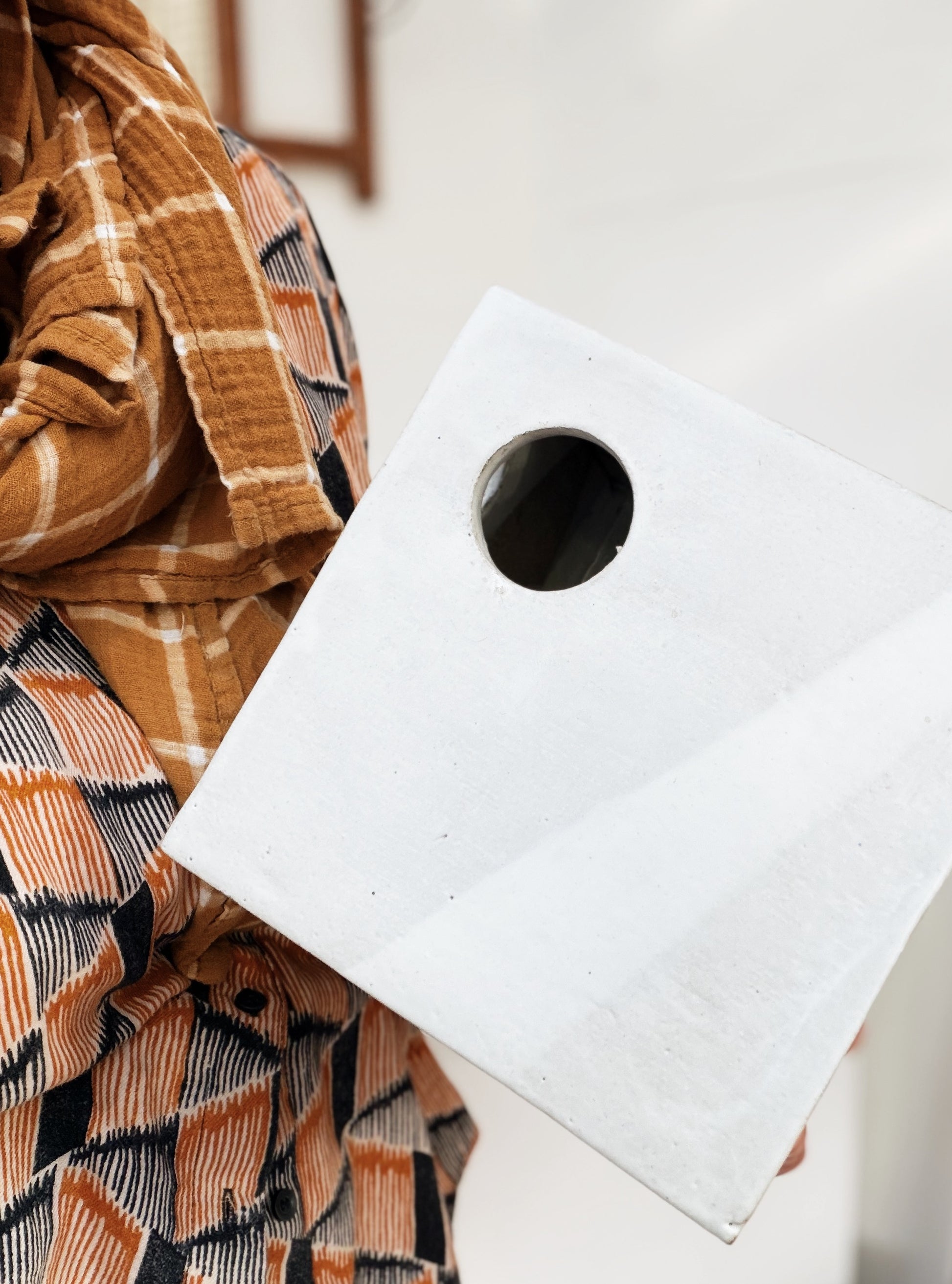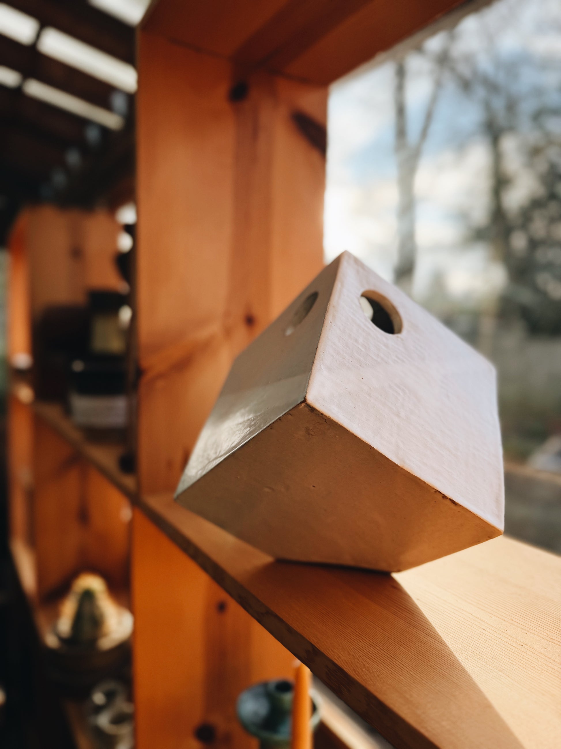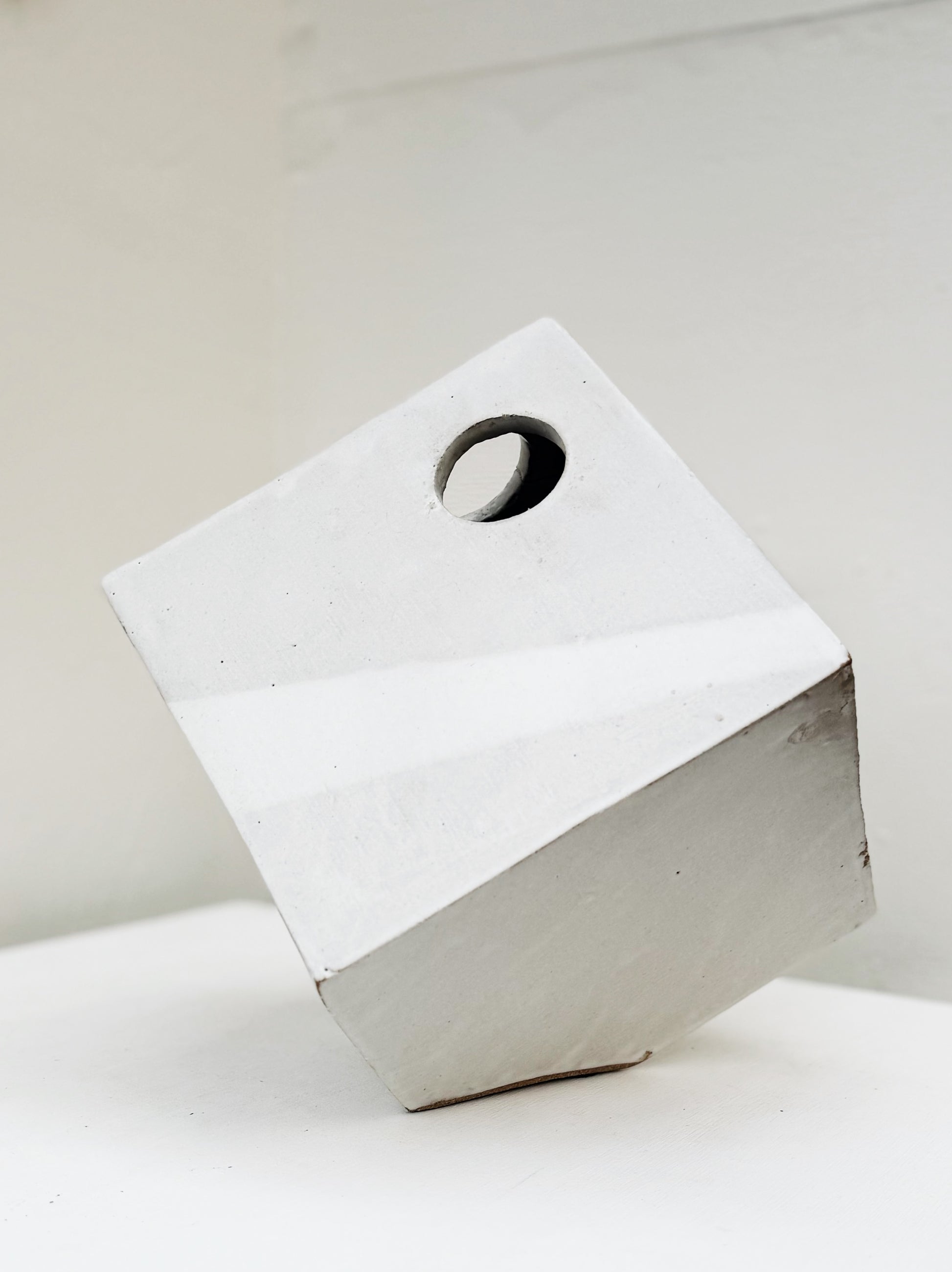 Oversized ceramic ikebana style vase or planter. Lovely tonal white glaze. Three large holes for arranging. Sits askew to inform its trapezoidal shape. A special one