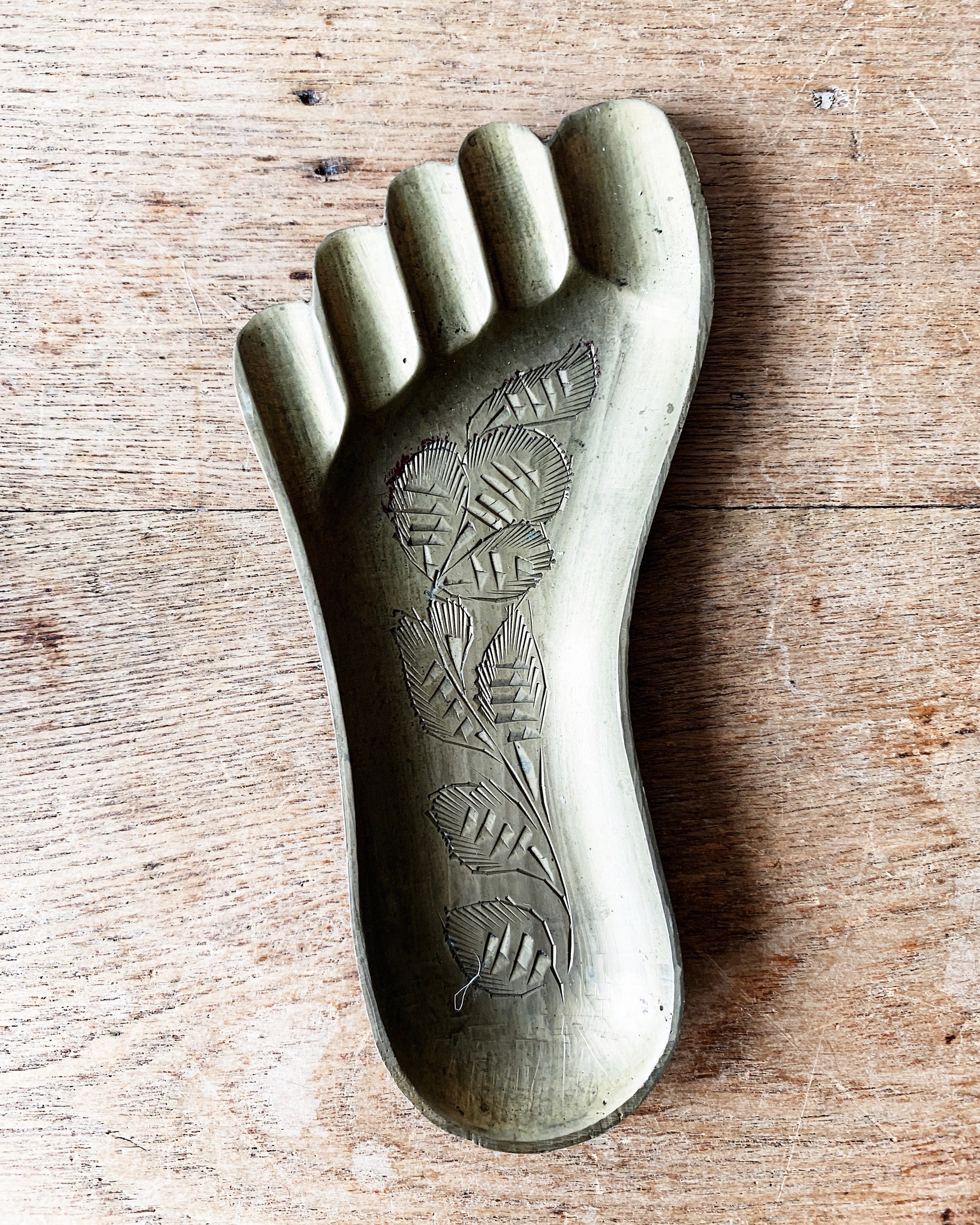 Vintage incised brass foot catchall dish for holding incense or jewelry. Cute!